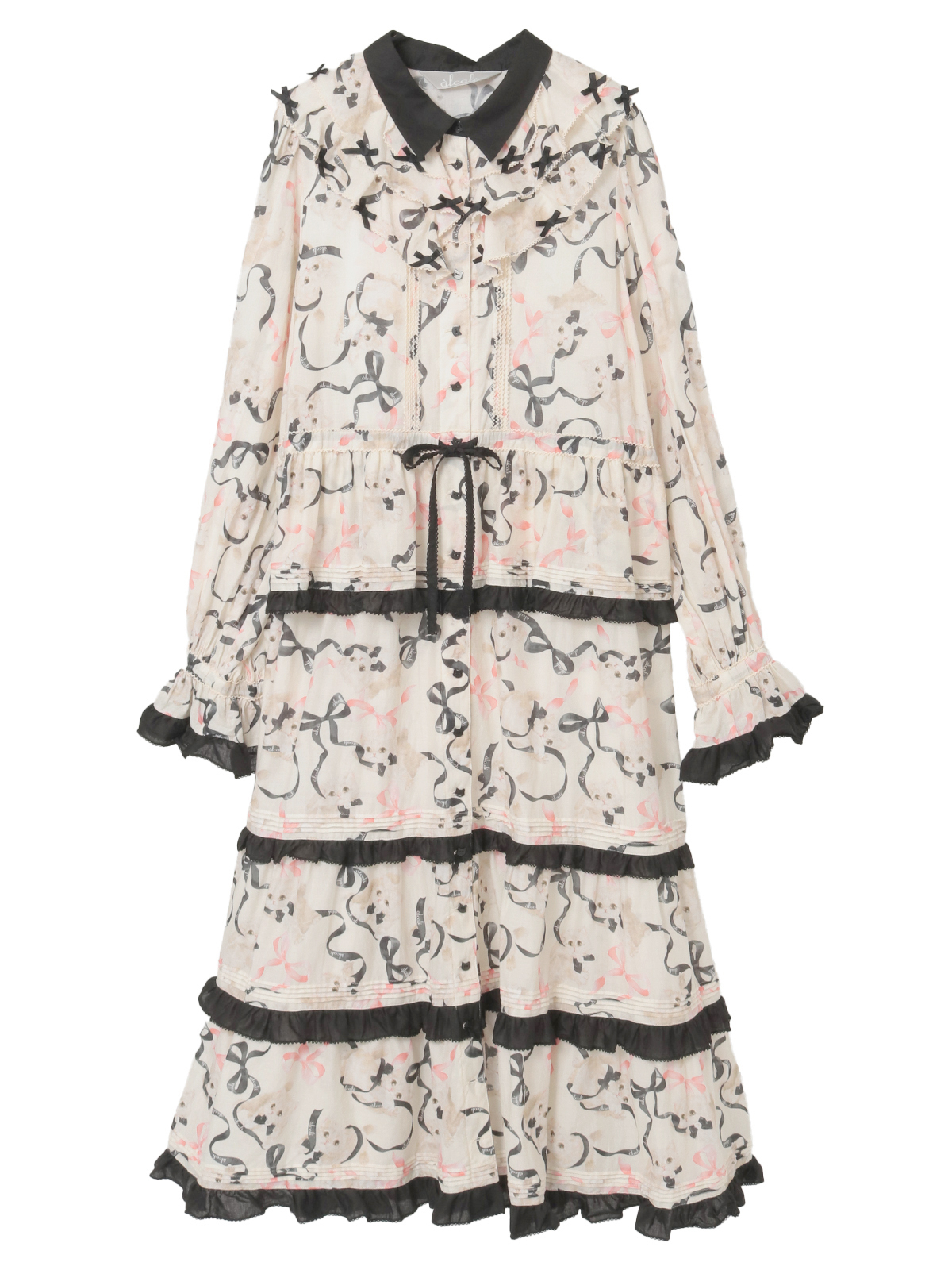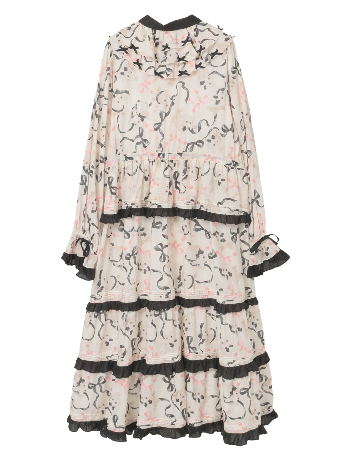 襟元には2重のフリルに実際のリボンテープとピコット刺繍で飾りつけ、