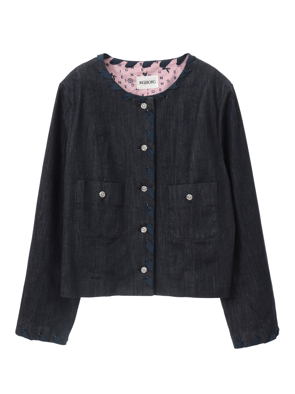カメリア形の光沢のあるボタンや、襟ぐり、前立て、袖口に施されたグログランリボンがアクセントとなり、シンプルながらも洗練された印象を与えます。