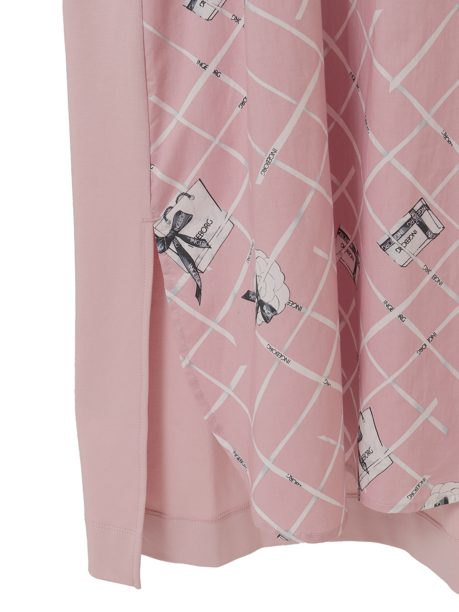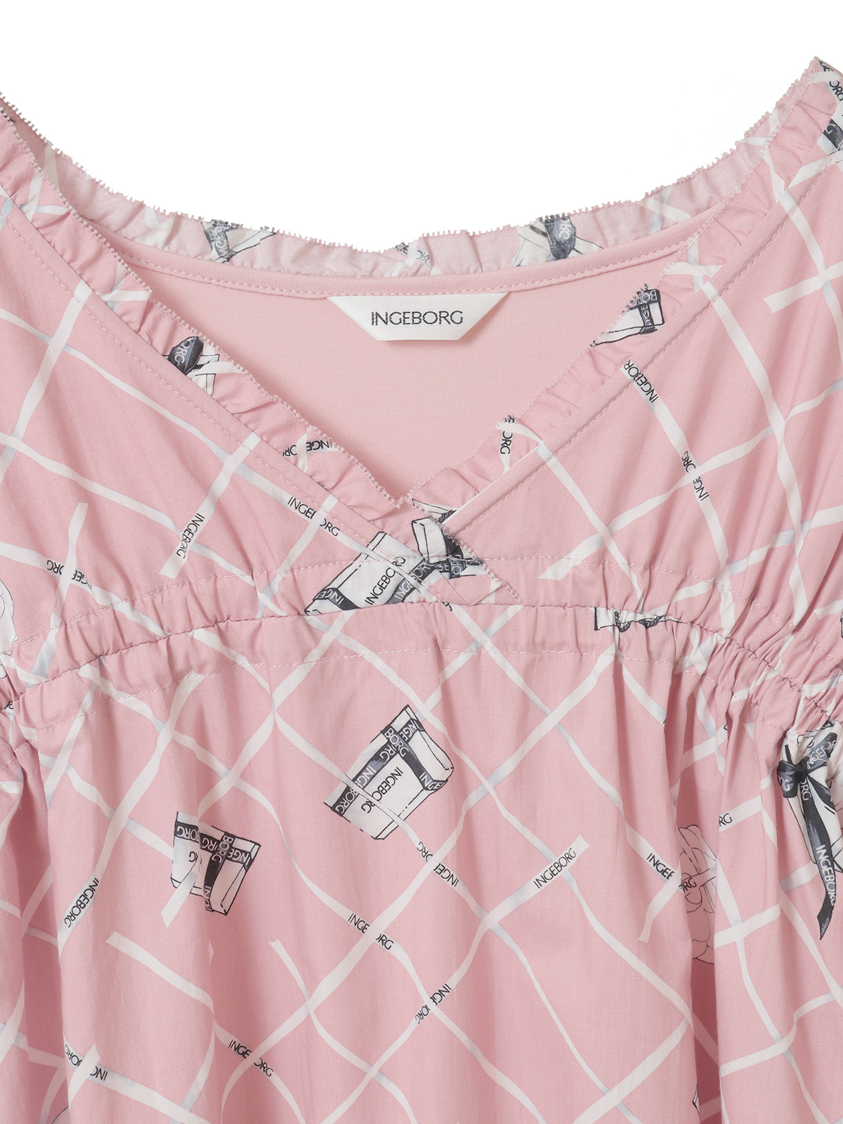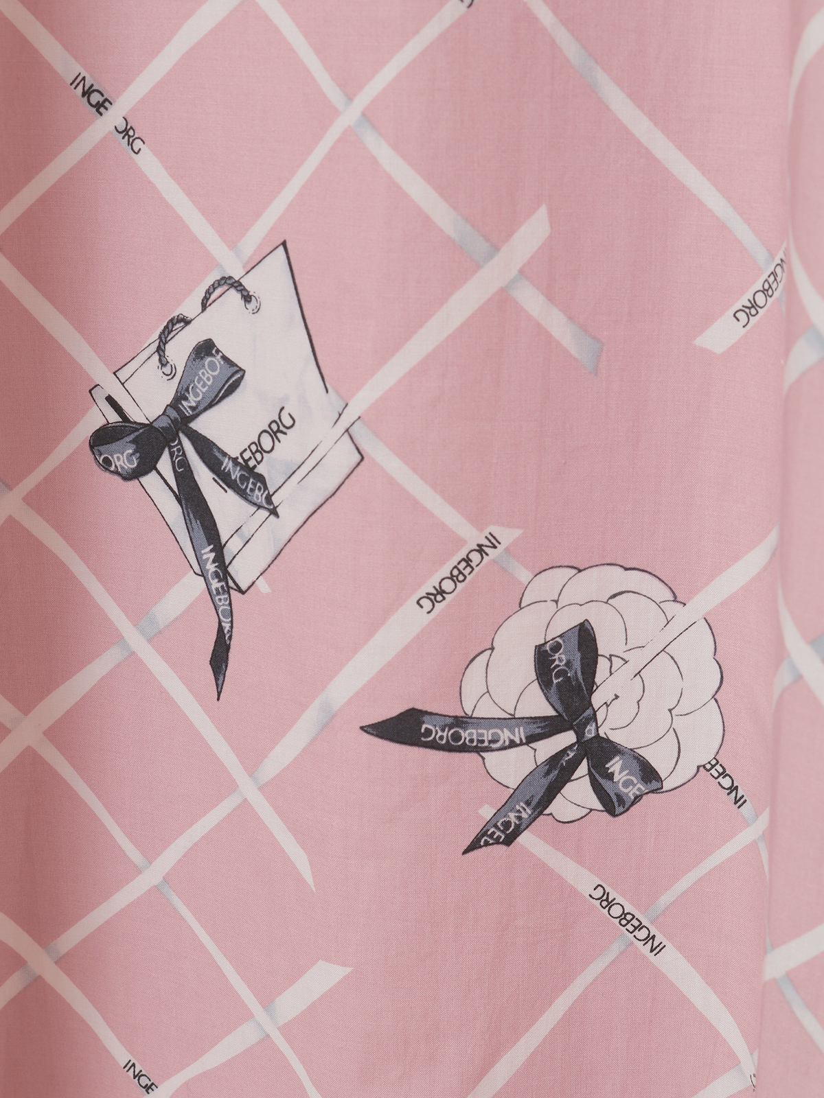 フロントには、張りのあるタイプライター生地にインゲボルグのロゴ入りリボンをチェック状に配した個性的なプリントを使用。