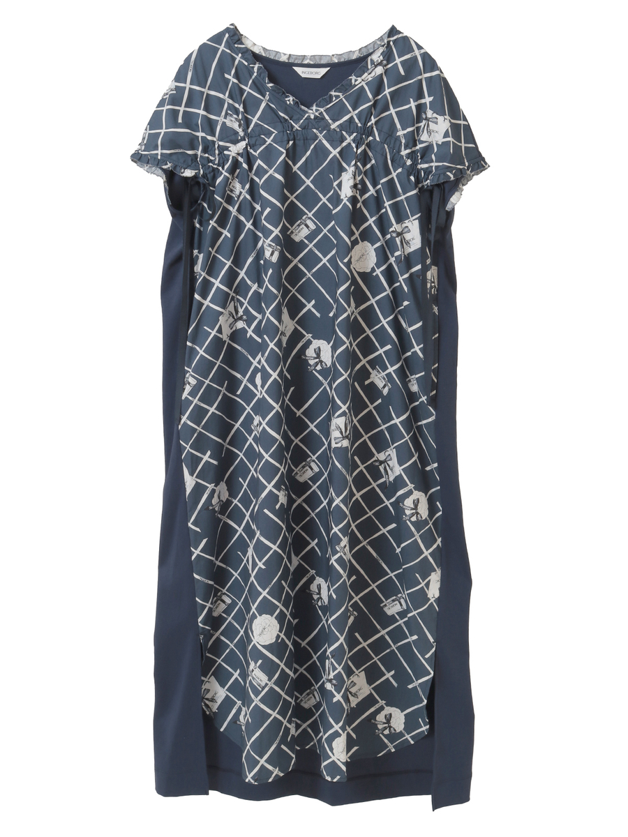 胸上に横ステッチを施し、ウエスト部分はサイドリボンでシルエットの調整が可能なドロスト仕様になっています。