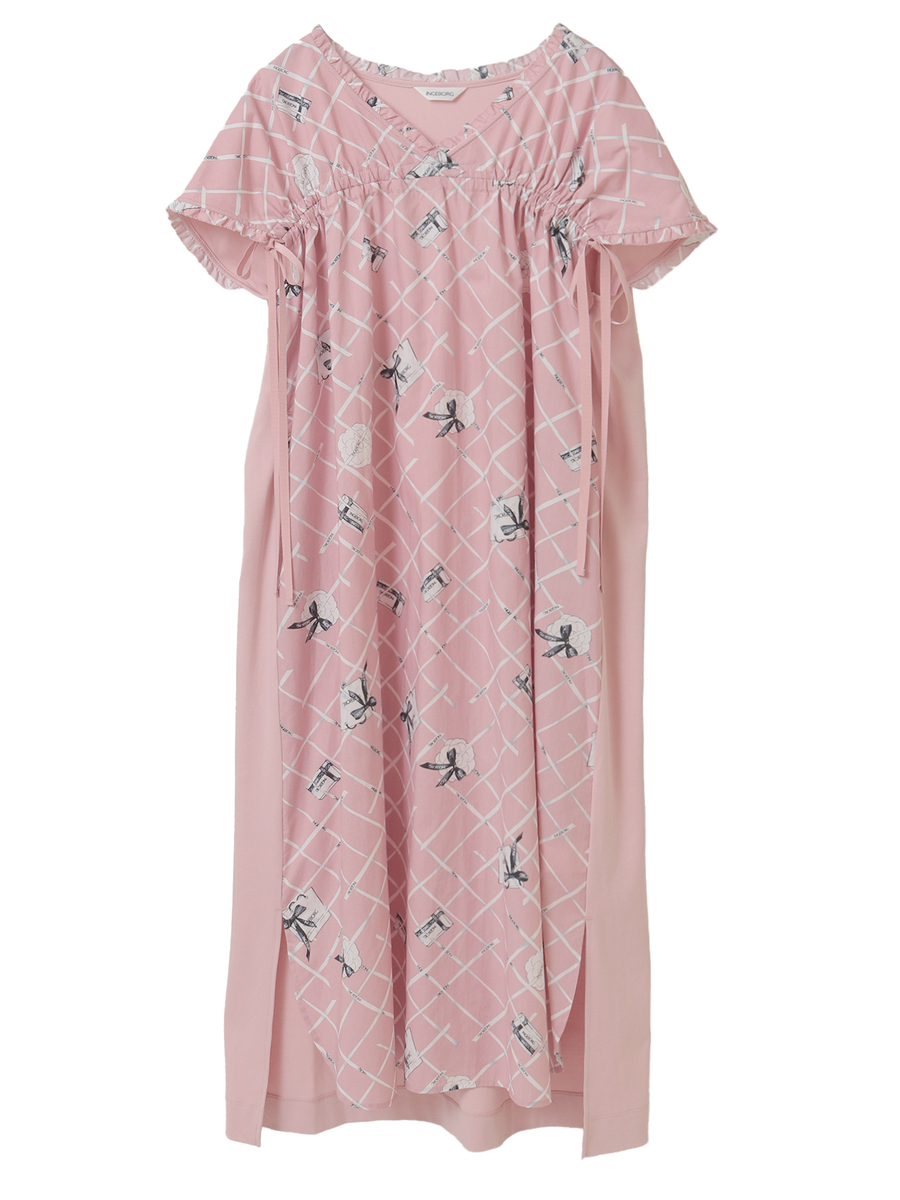 胸上に横ステッチを施し、ウエスト部分はサイドリボンでシルエットの調整が可能なドロスト仕様になっています。
