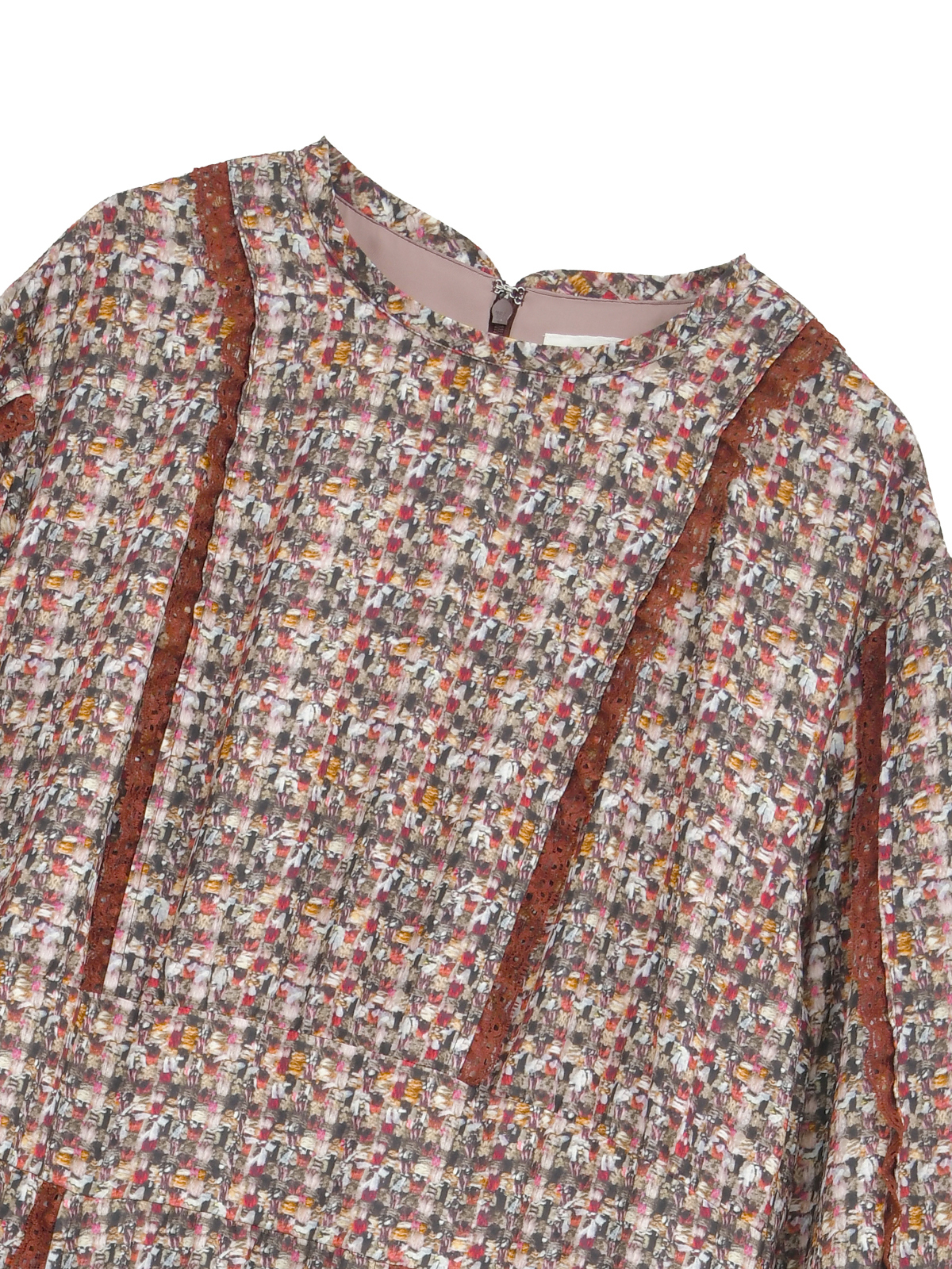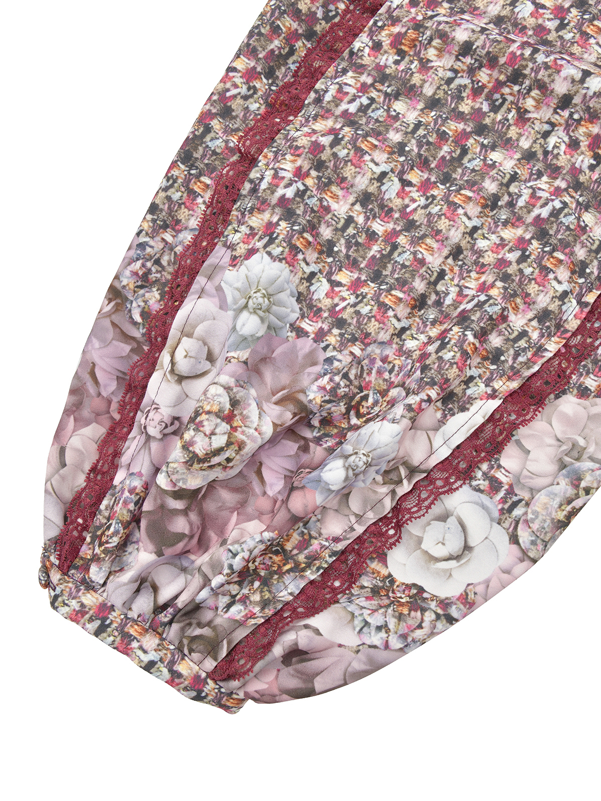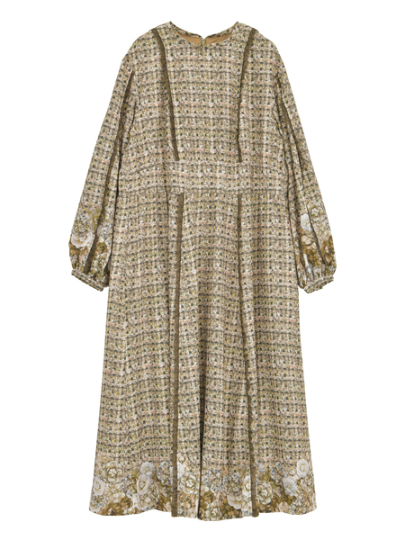 上品な光沢と落ち感が魅力のサテン素材に、リントンツイードの質感をプリントで巧みに再現さらに華やかな花モチーフを重ねたプリントした素材を使用したフェミニンなワンピース。