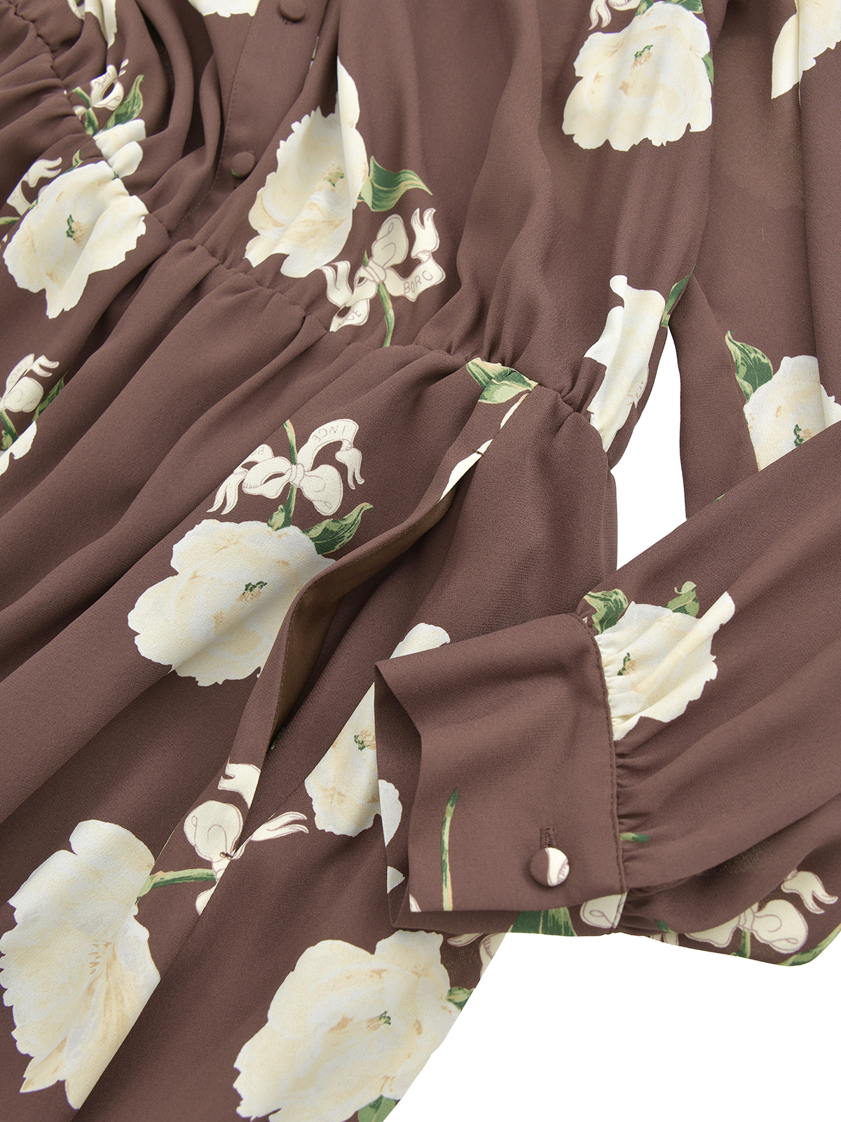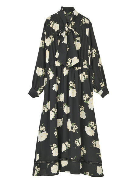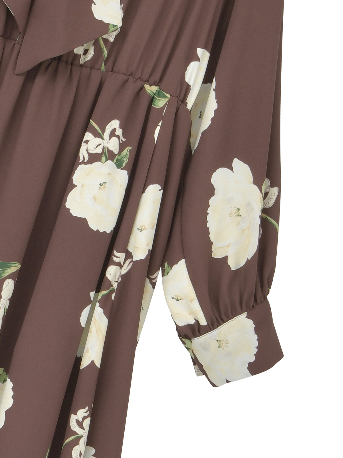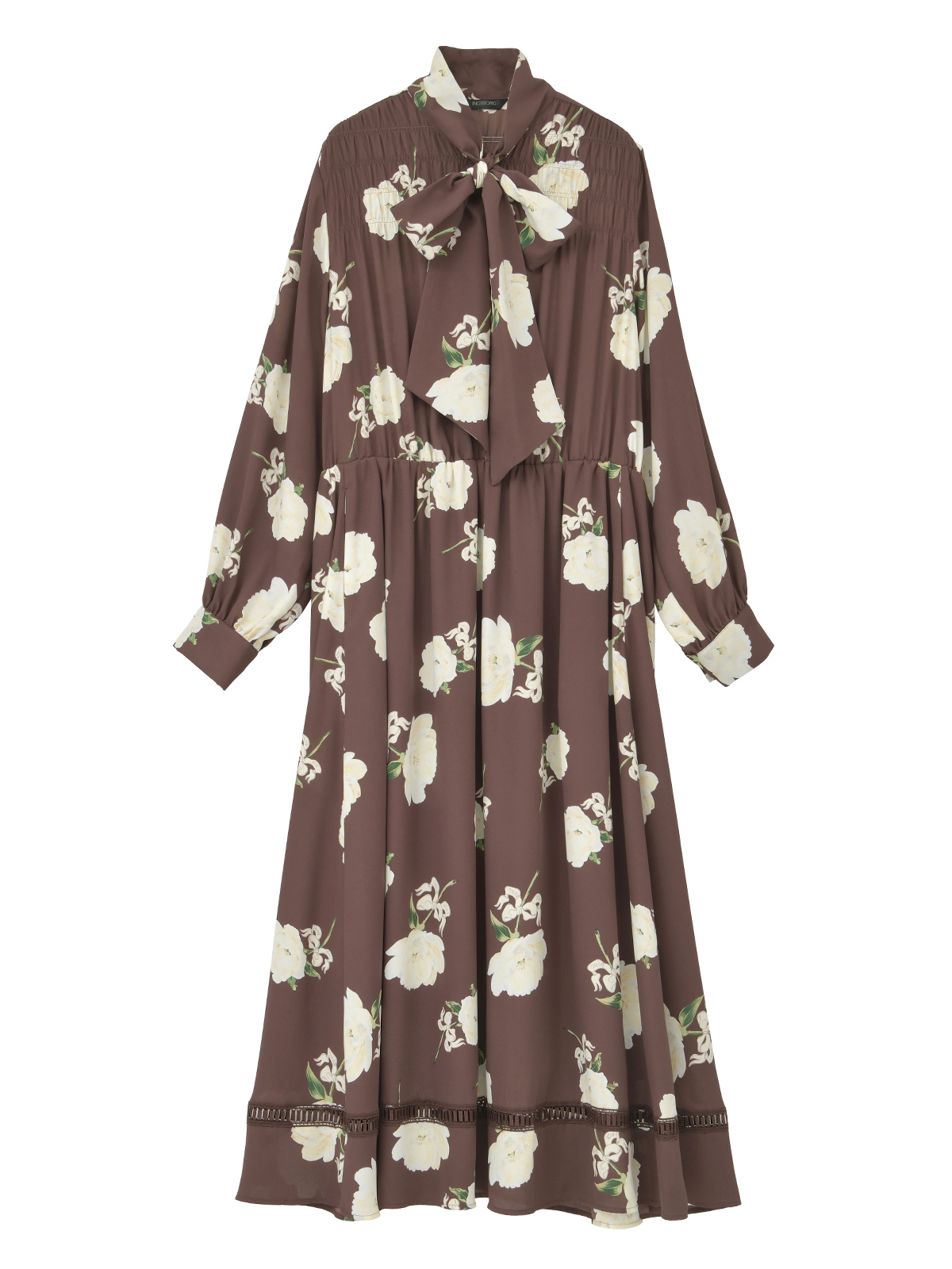 繊細な凹凸感が美しい梨地ジョーゼットに、華やかで気品あるシャクヤクの花を描いた、エレガントな長袖ロングワンピース。
