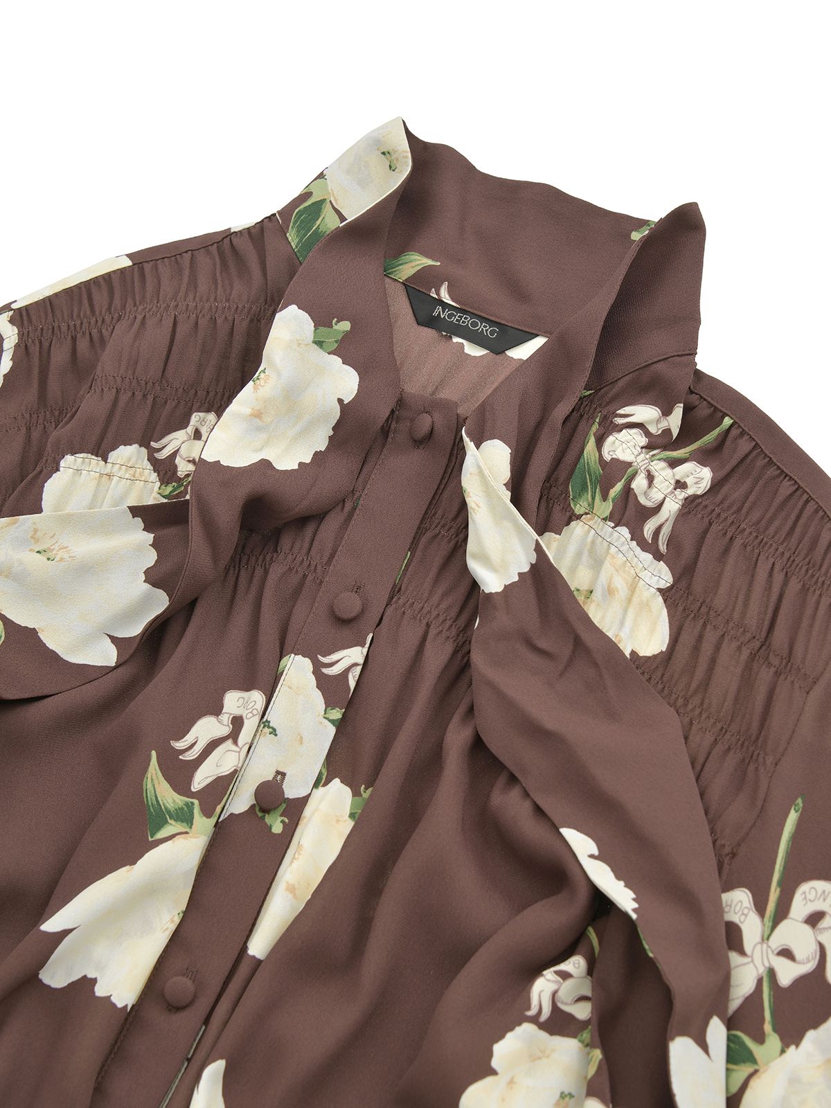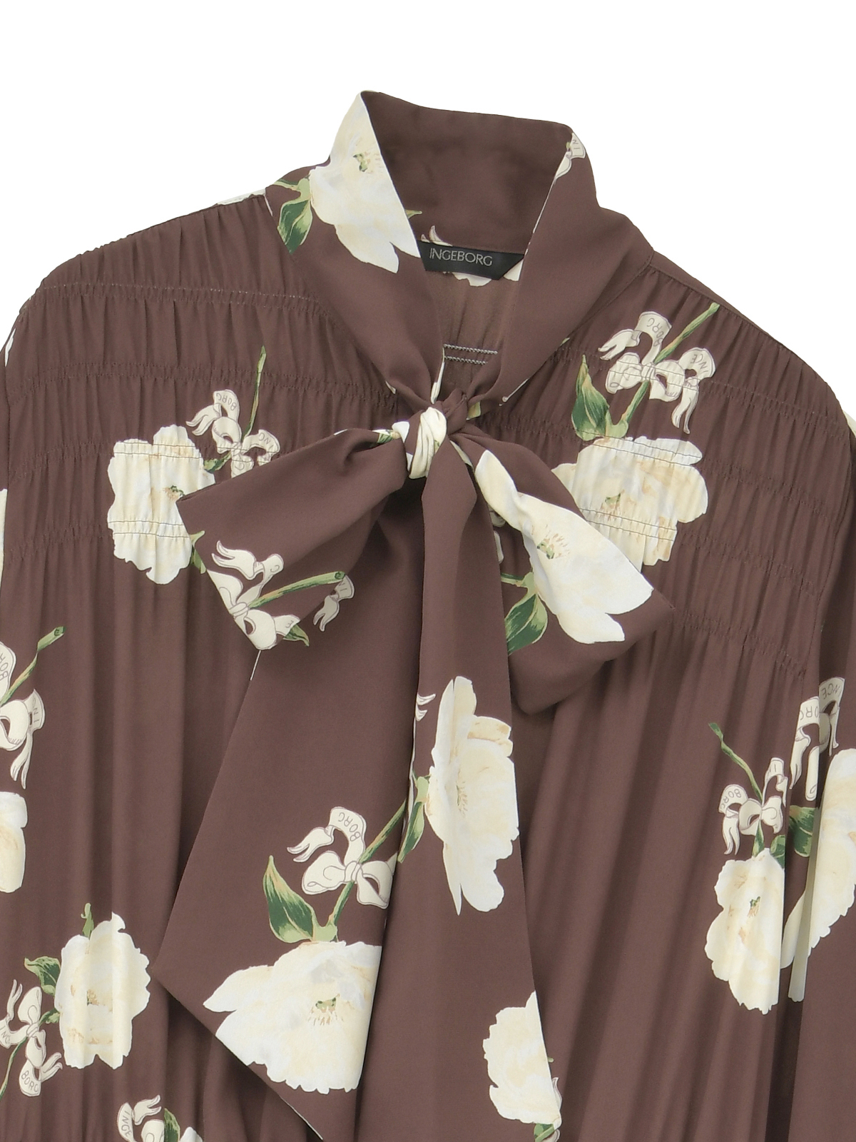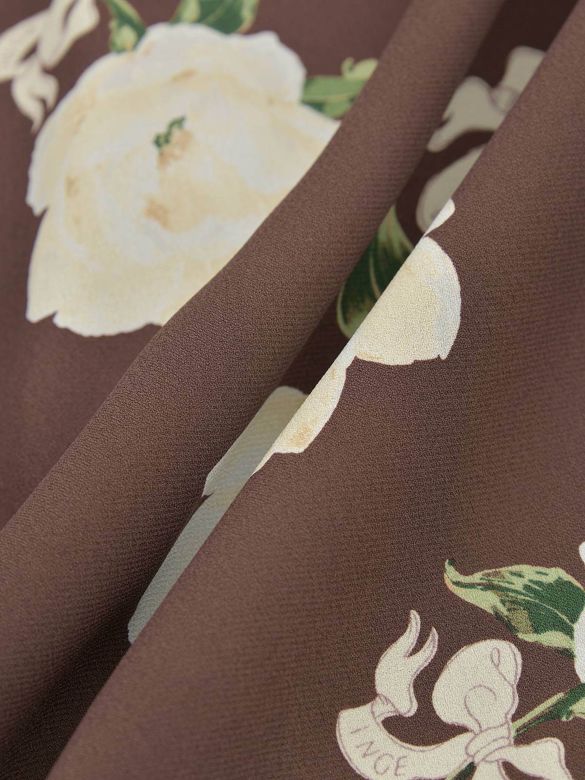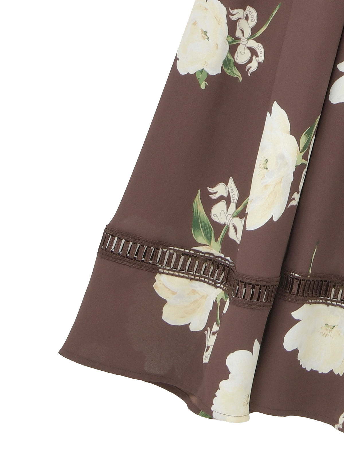 繊細な凹凸感が美しい梨地ジョーゼットに、華やかで気品あるシャクヤクの花を描いた、エレガントな長袖ロングワンピース。