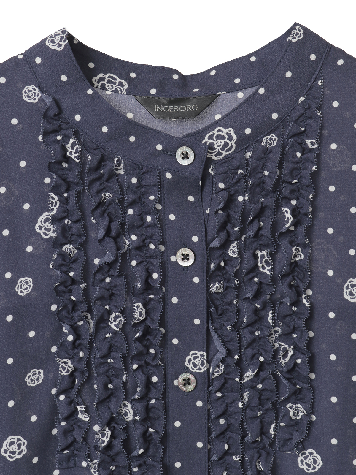すっきりとしたバンドカラーに、前身頃のフリルが立体感を添えフェミニンな表情をプラス。