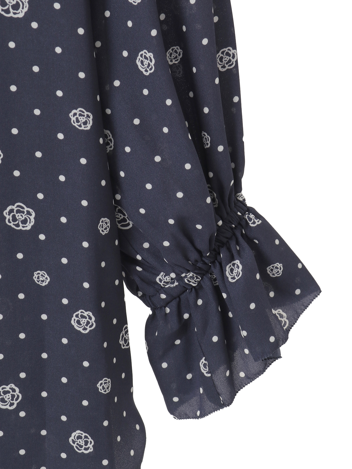 ソフトでふんわりとした膨らみ感があり、優しい手触りの素材に、インゲボルグの定番「カメリアドット柄」をリズム感のある新しい配置でアレンジしプリントした華やかな一着です。