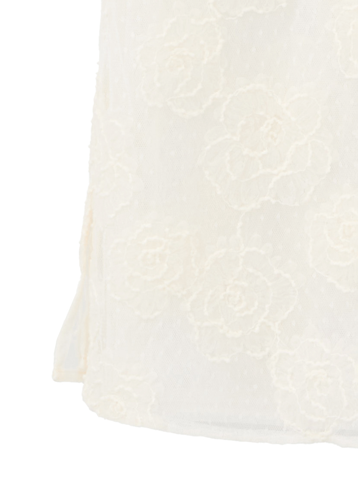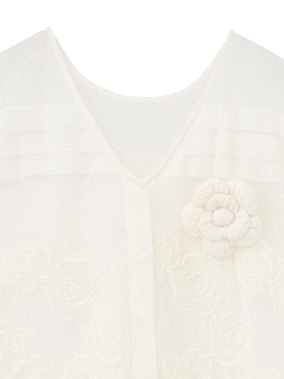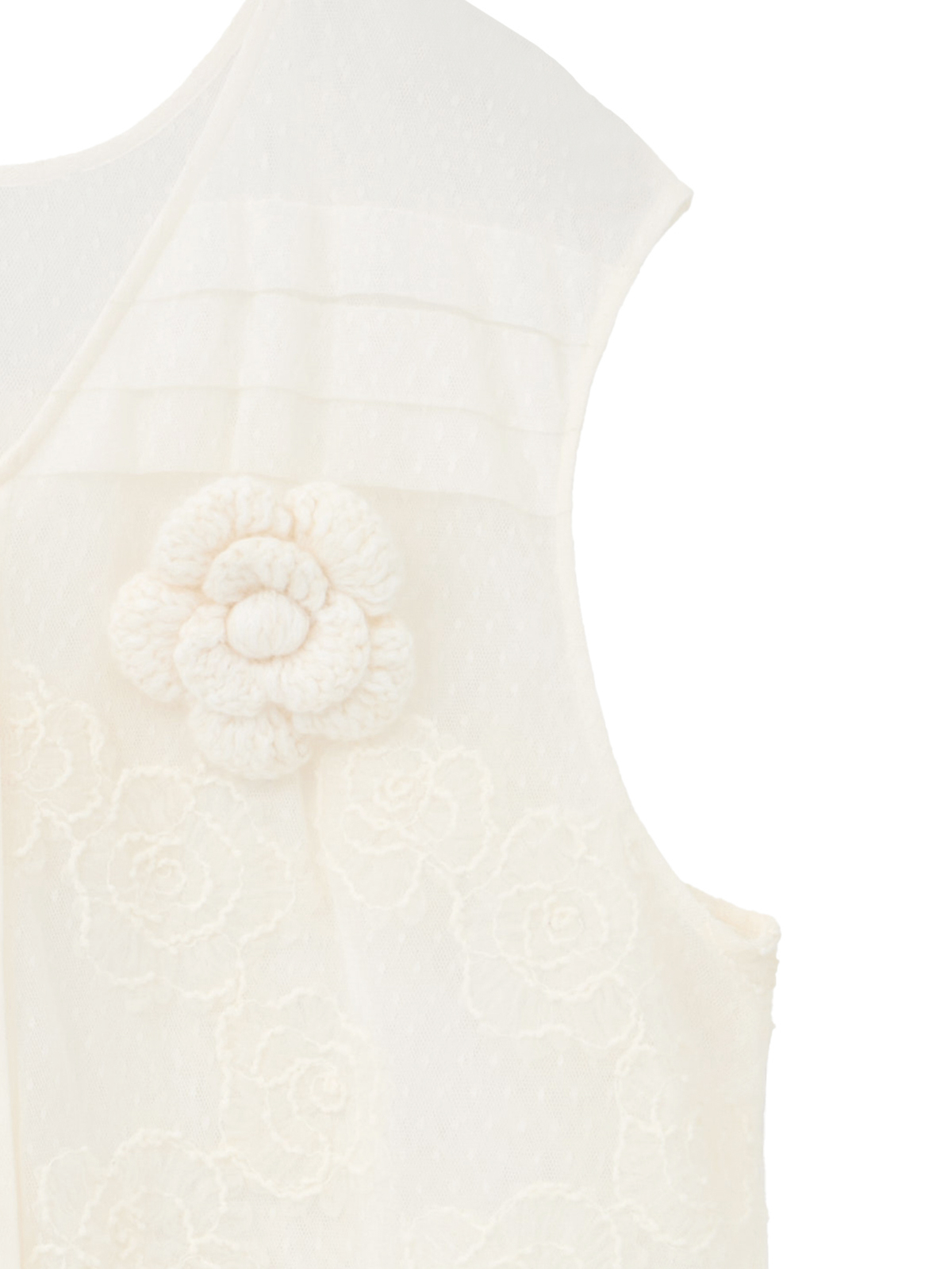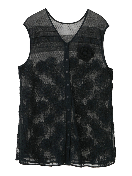 柔らかなチュールテープに変則的なネップ糸で刺繍を施し、上質な高級感を表現したカメリアチュールレースを贅沢に使用したベストタイプチュニックブラウスです。