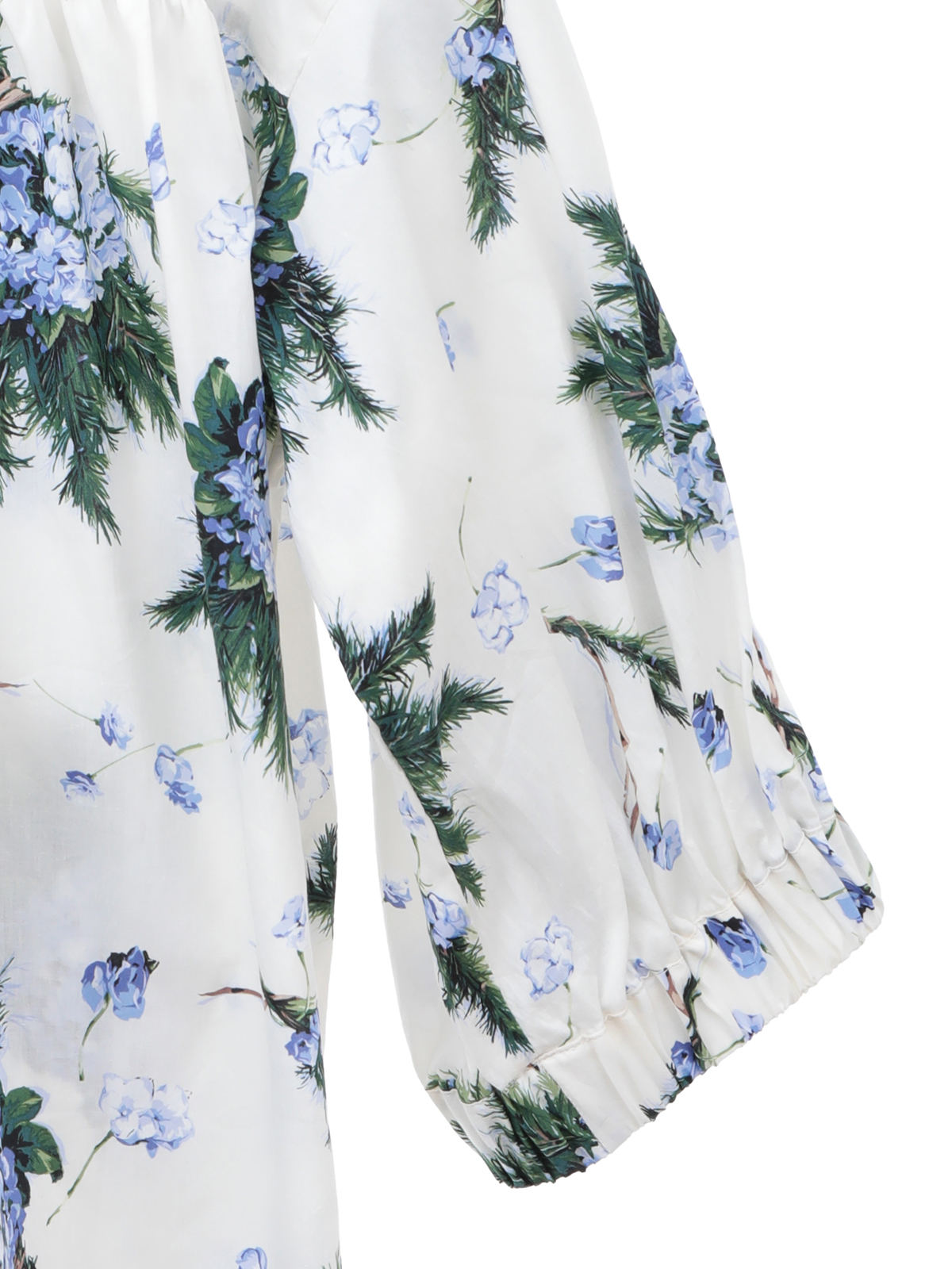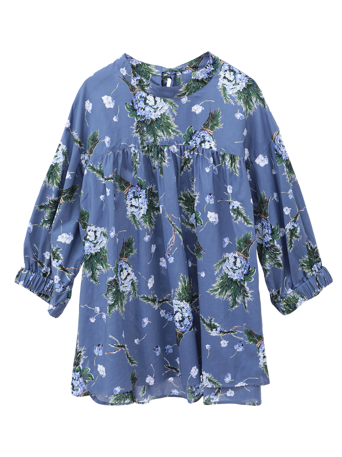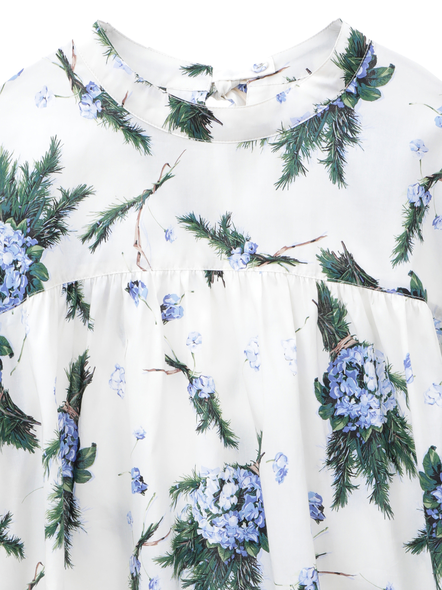 しなやかな張りと適度な艶感が美しい素材に、ウェディングブーケのようにアレンジされたローズマリーと紫陽花の祝祭感あふれるプリントを施したブラウスです。