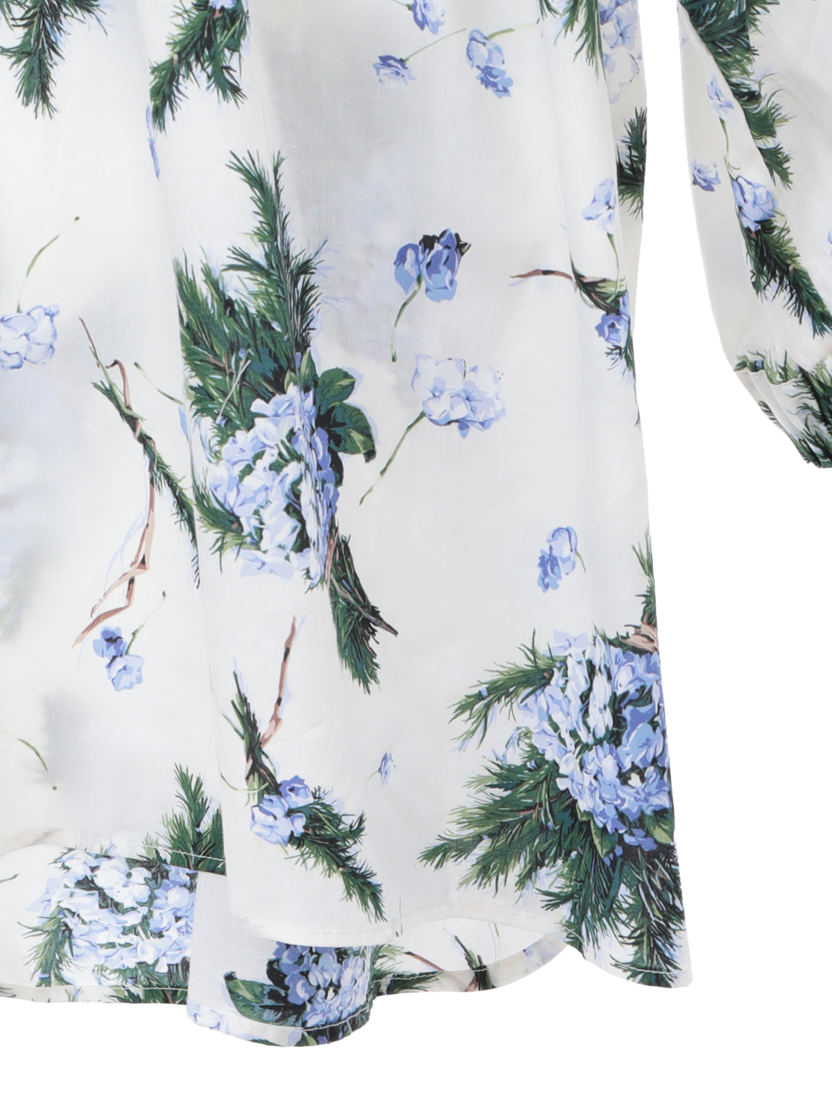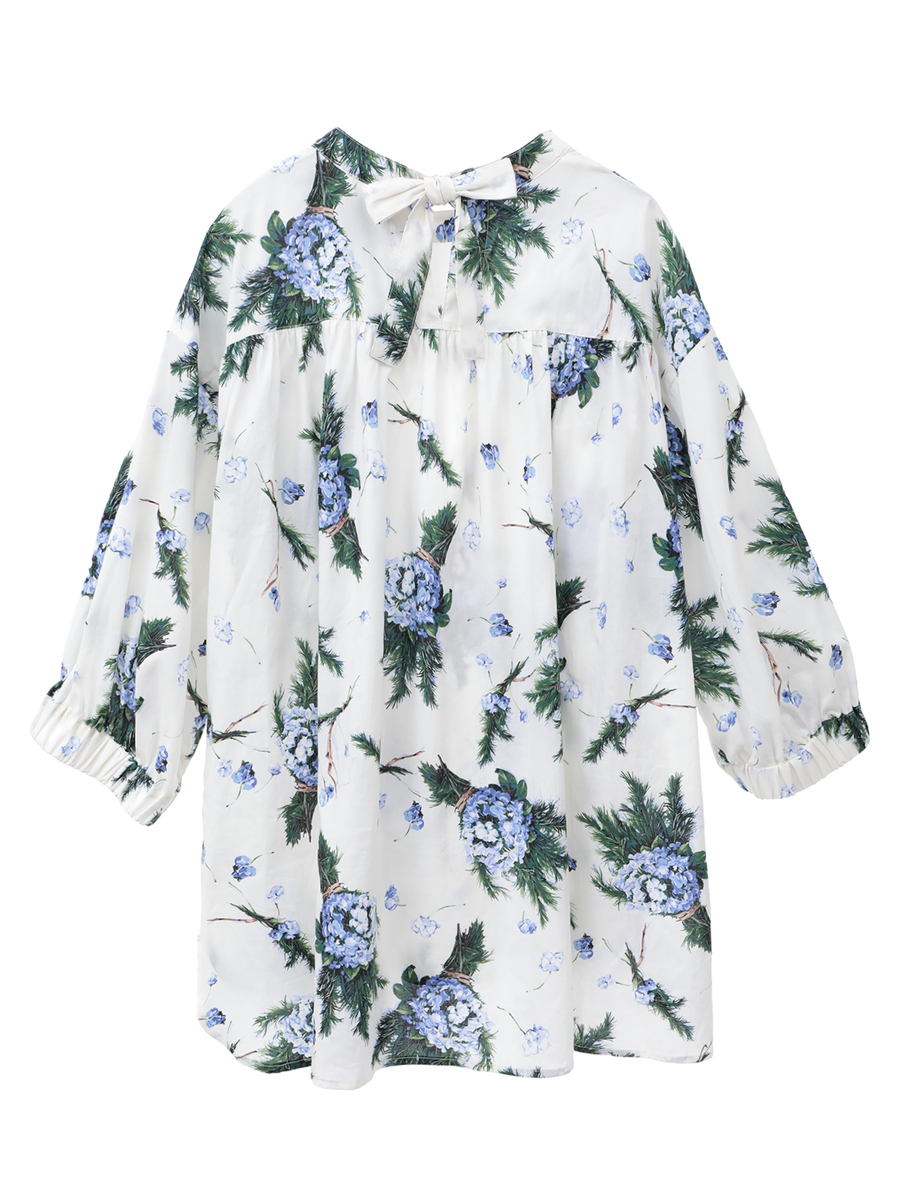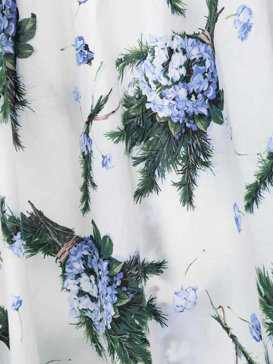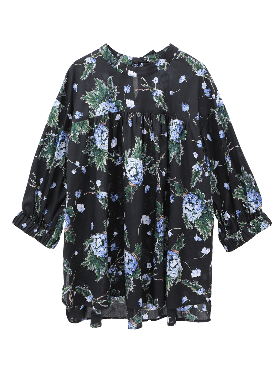 しなやかな張りと適度な艶感が美しい素材に、ウェディングブーケのようにアレンジされたローズマリーと紫陽花の祝祭感あふれるプリントを施したブラウスです。