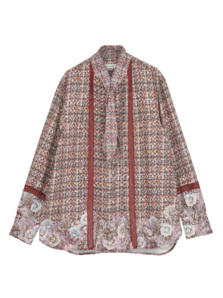上品な光沢と落ち感が魅力のサテン素材に、リントンツイードの質感をプリントで巧みに再現さらに華やかな花モチーフを重ねたプリントした素材を使用したブラウスです。