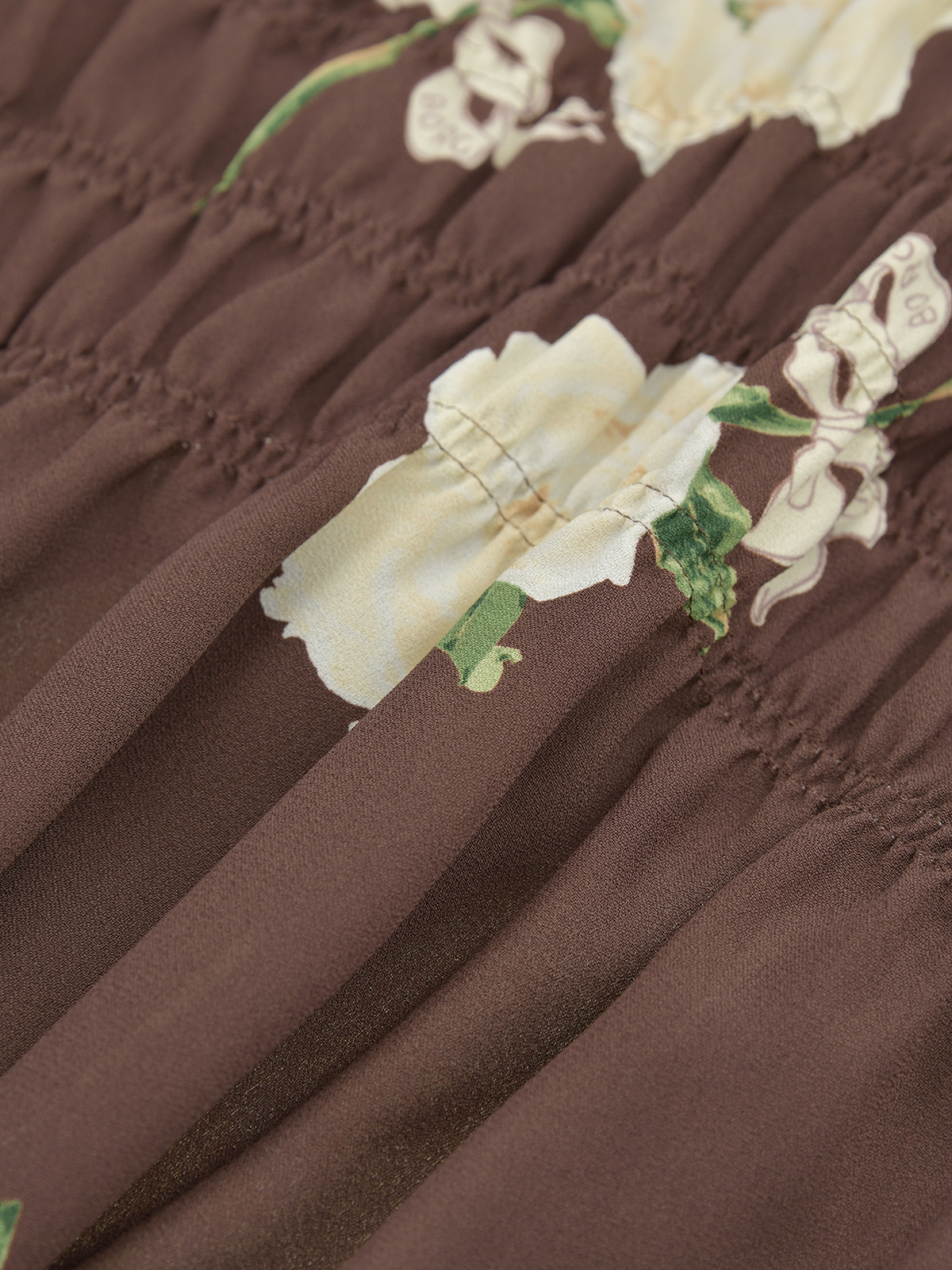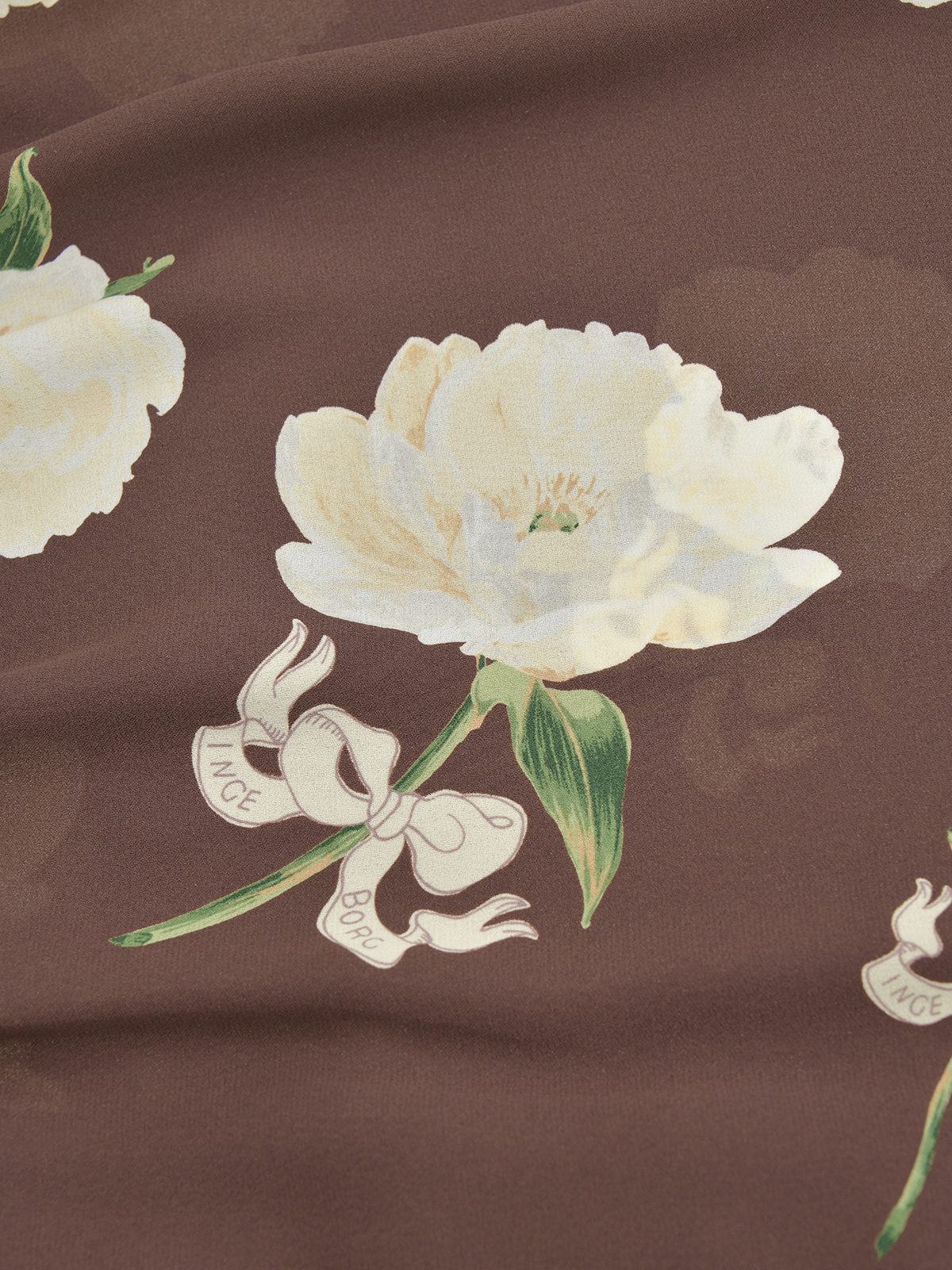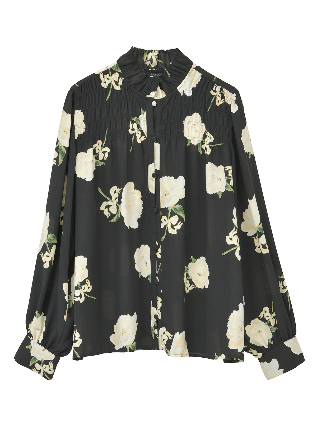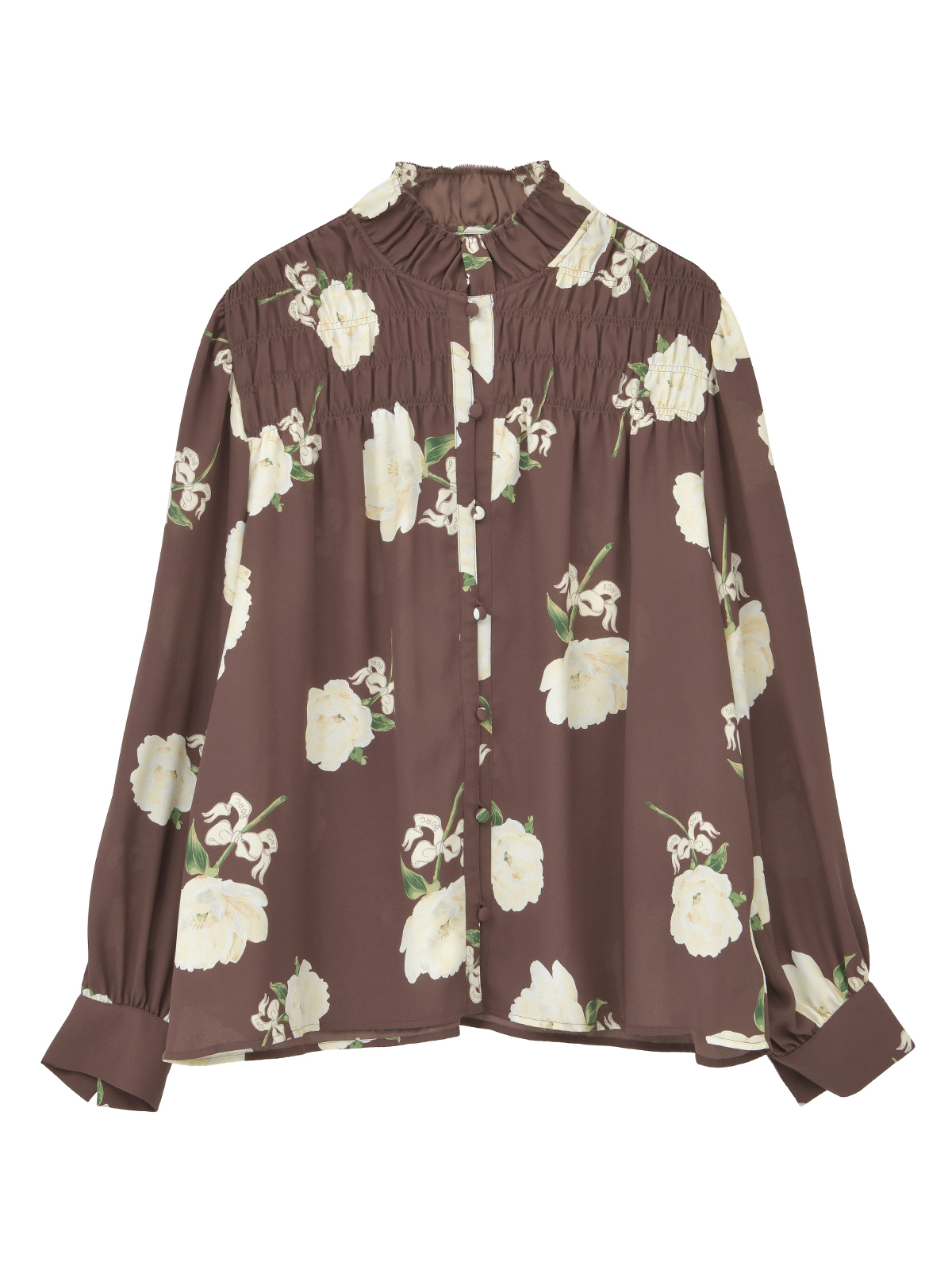 繊細な凹凸が美しい梨地ジョーゼットに、華やかで気品あふれるシャクヤクの花を描いた長袖ブラウス。