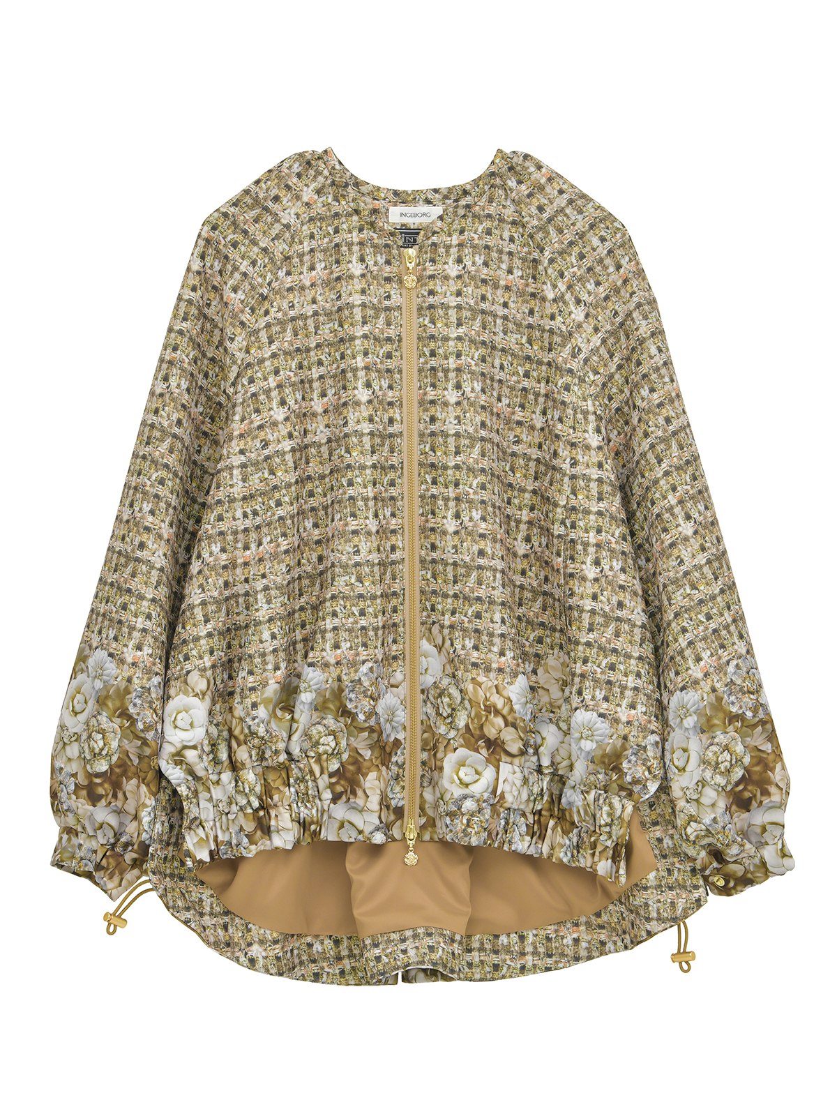 ソフトで膨らみ感のある優しい手触りのツイル素材に、リントンツイードの質感をプリントで巧みに再現さらに華やかな花モチーフを重ねたプリントした素材が魅力のノーカラーブルゾンです。