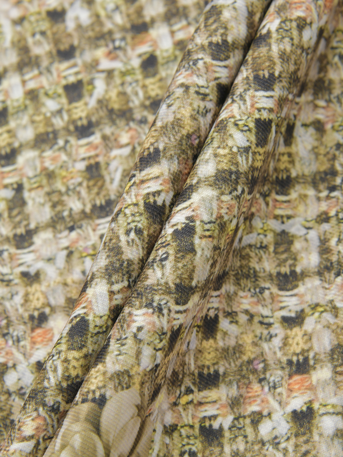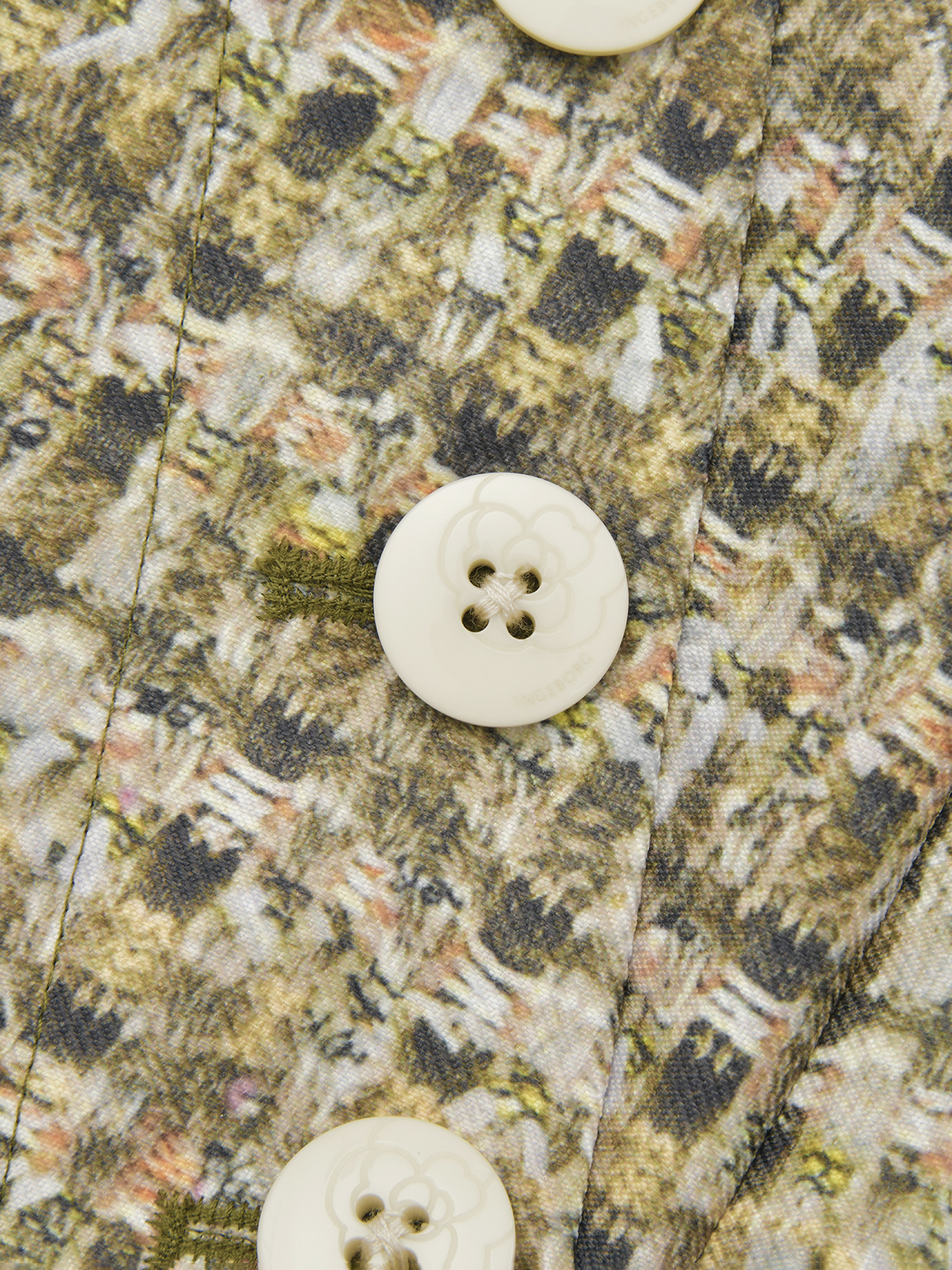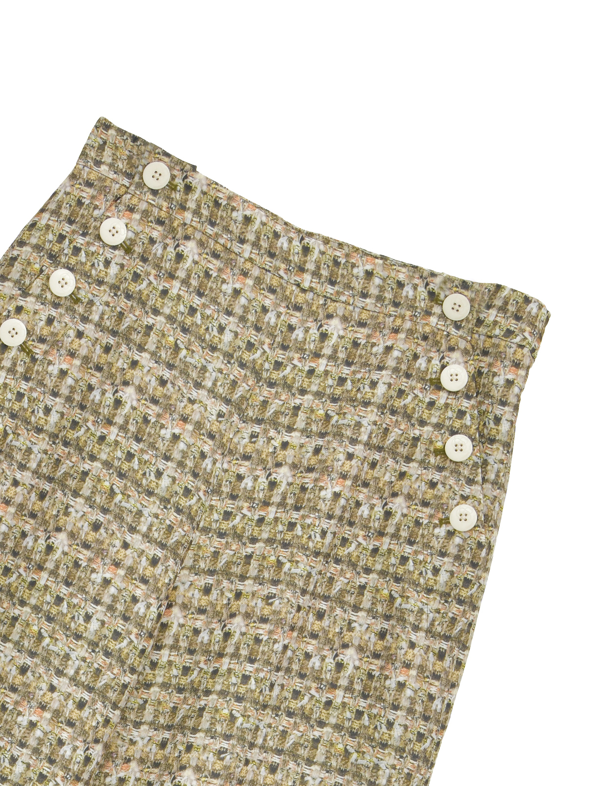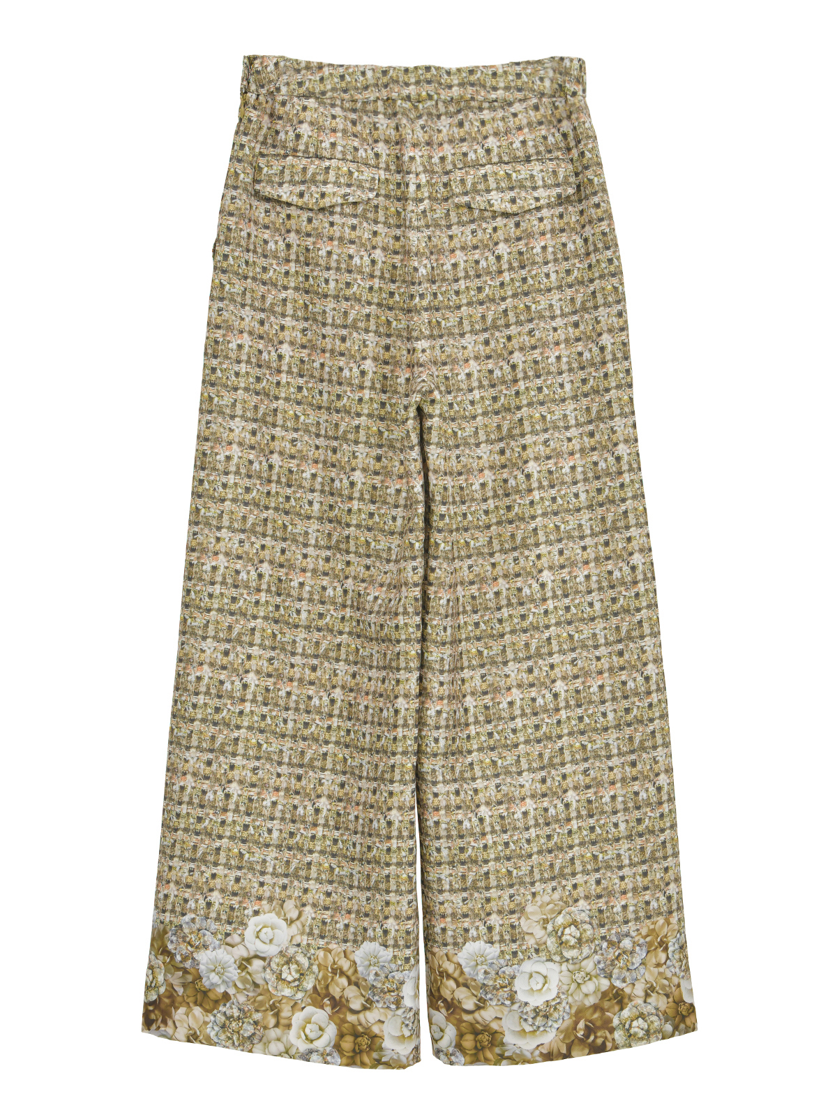ソフトで膨らみ感のある優しい手触りのツイル素材に、リントンツイードの質感をプリントで巧みに再現さらに華やかな花モチーフを重ねたプリントした素材を使用したワイドパンツです。