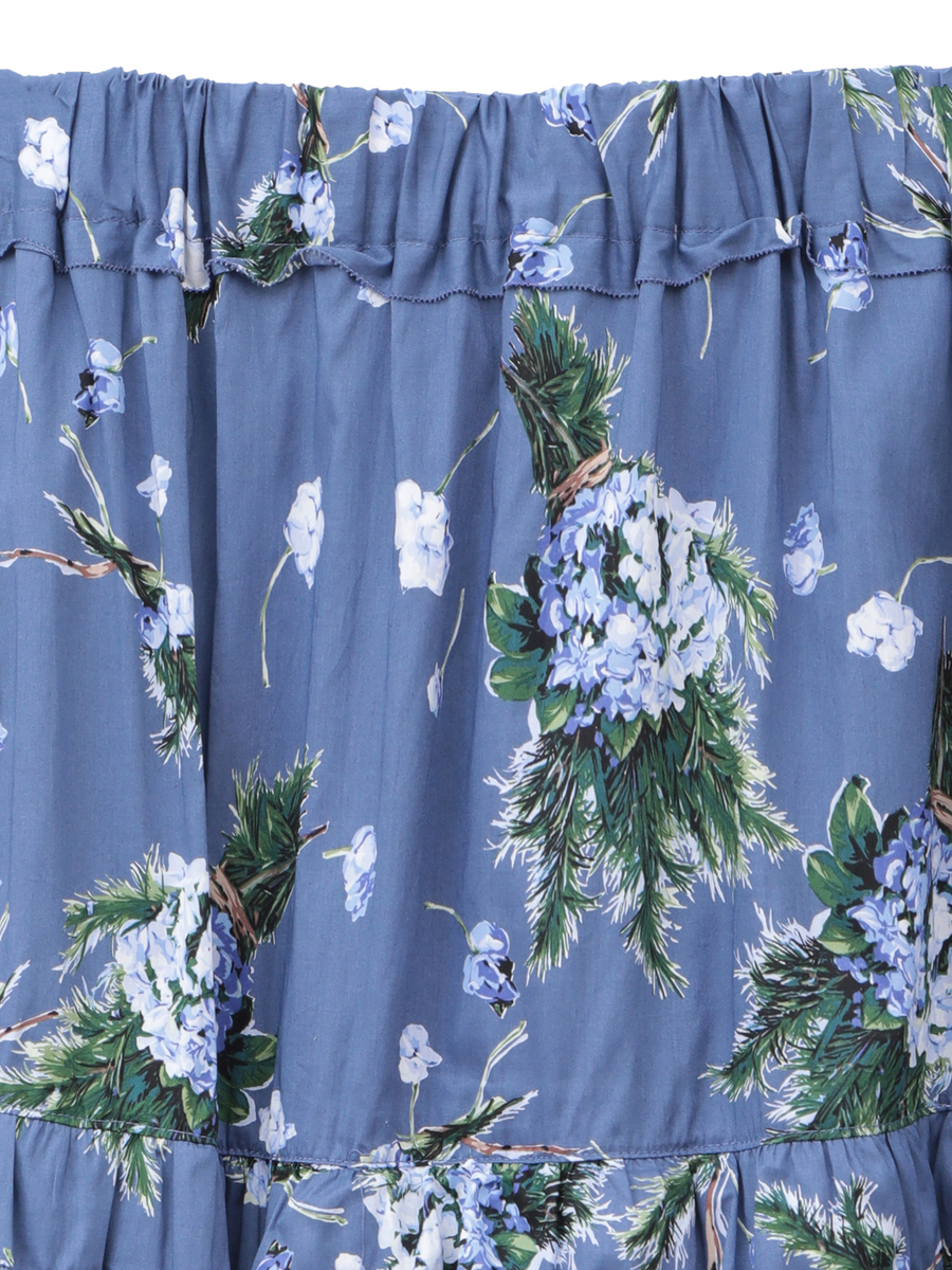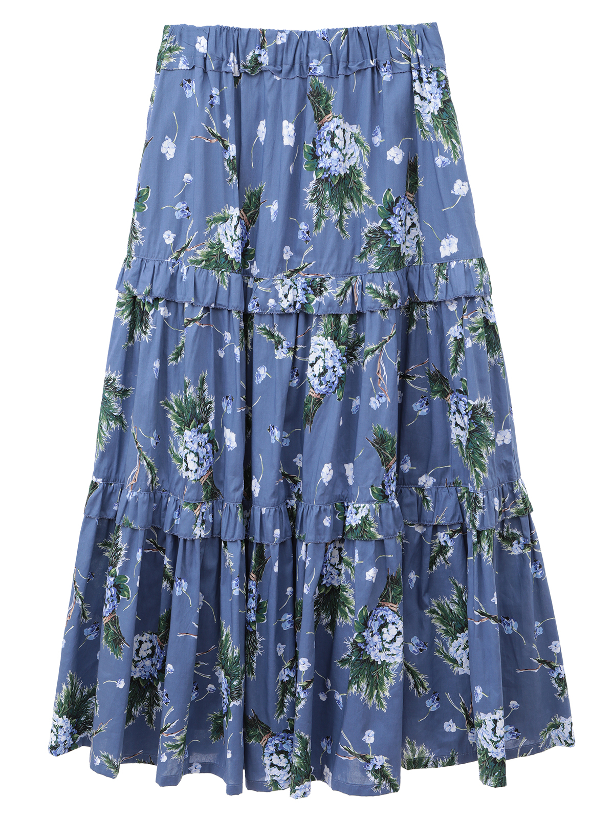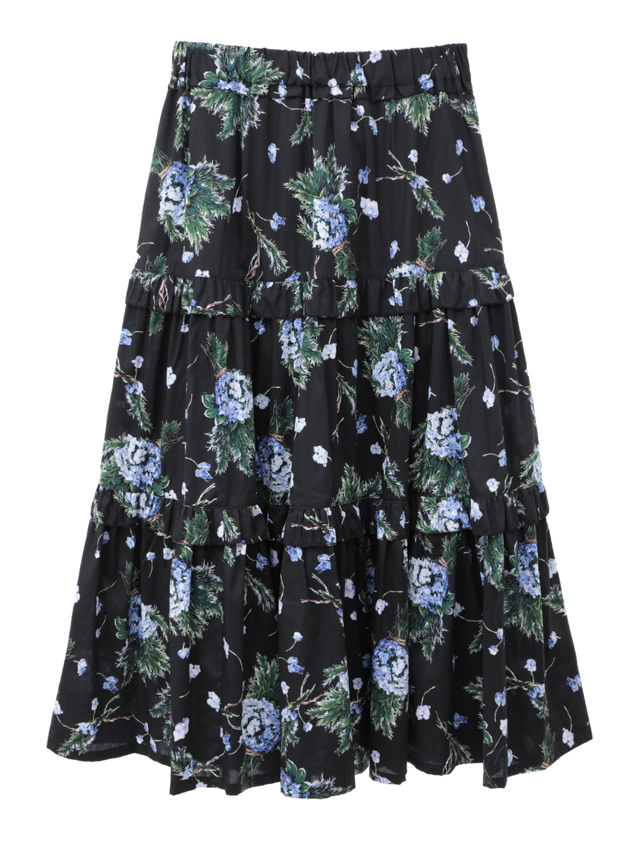 華やかなプリントと繊細なディテールが彩る、ローズマリーとアジサイのティアードロングスカート