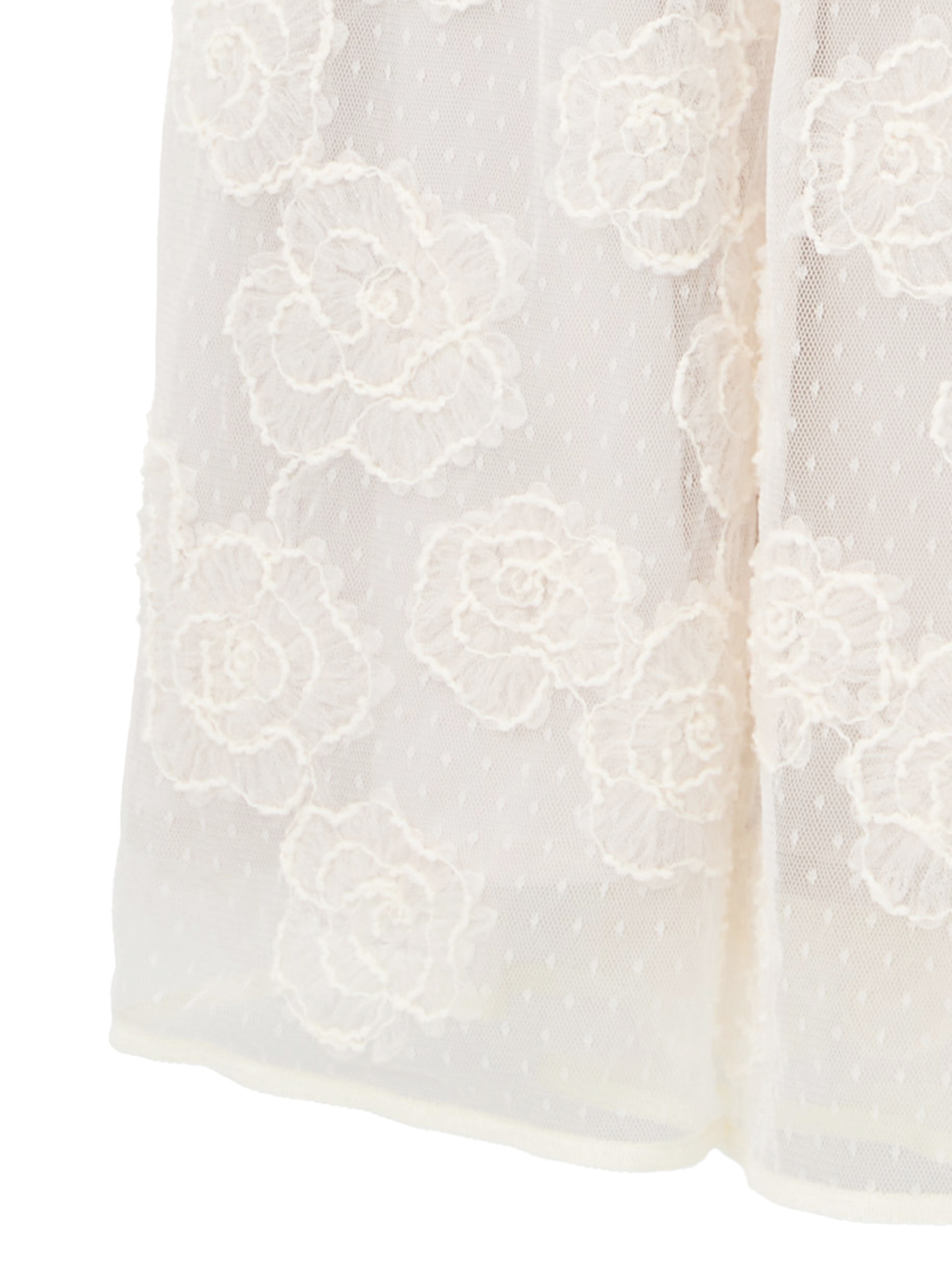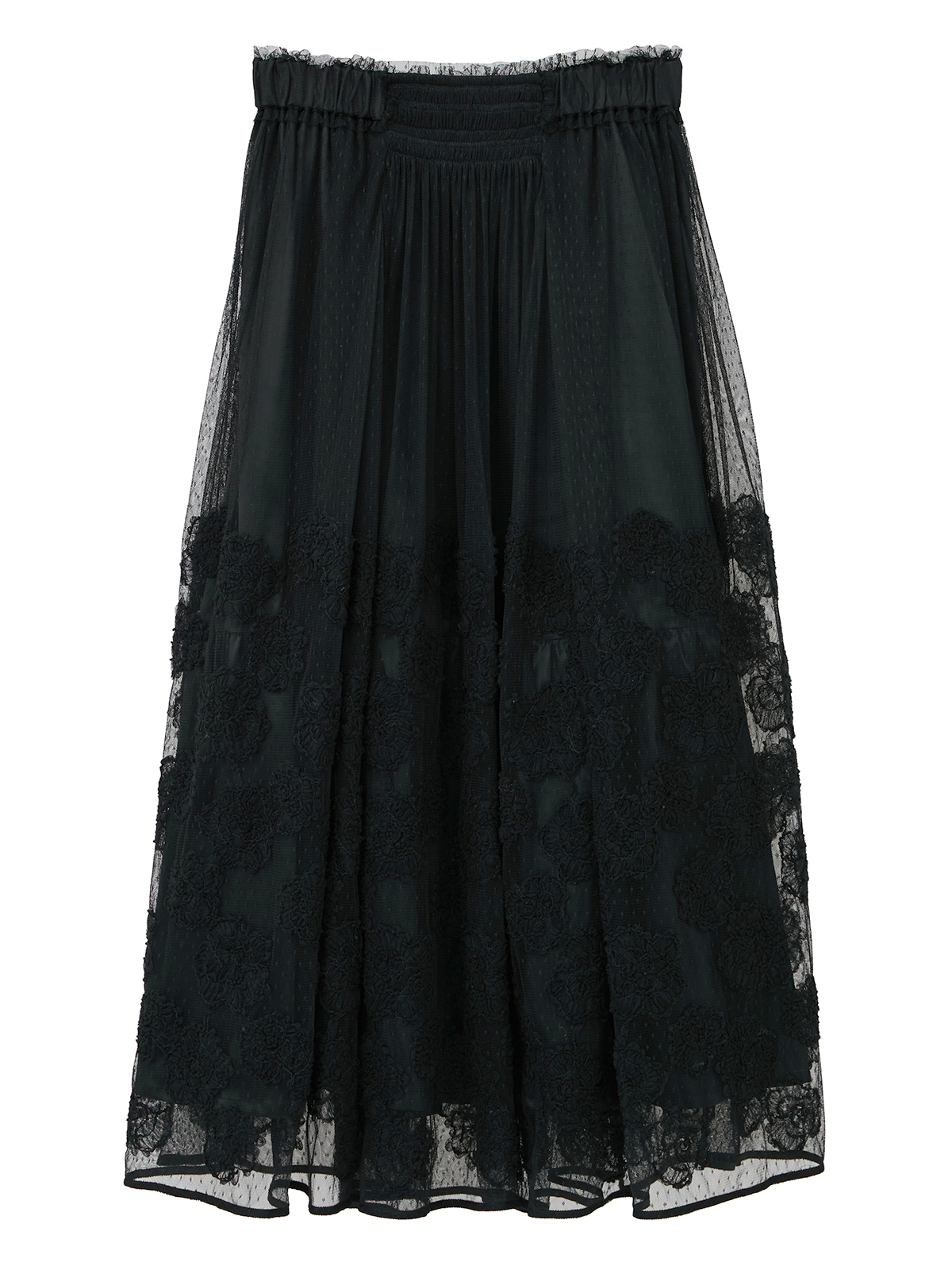 繊細なチュール生地に立体的に浮かび上がるカメリアの花模様が、まるで静かに咲き誇る花園のような美しさを纏うロングスカート。