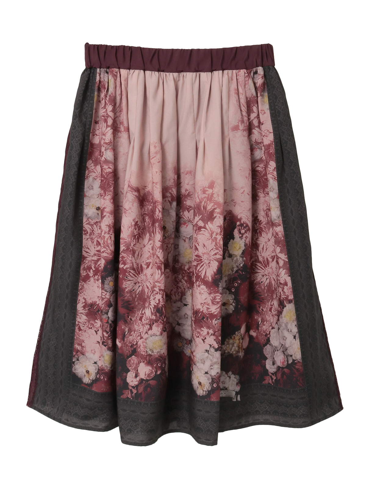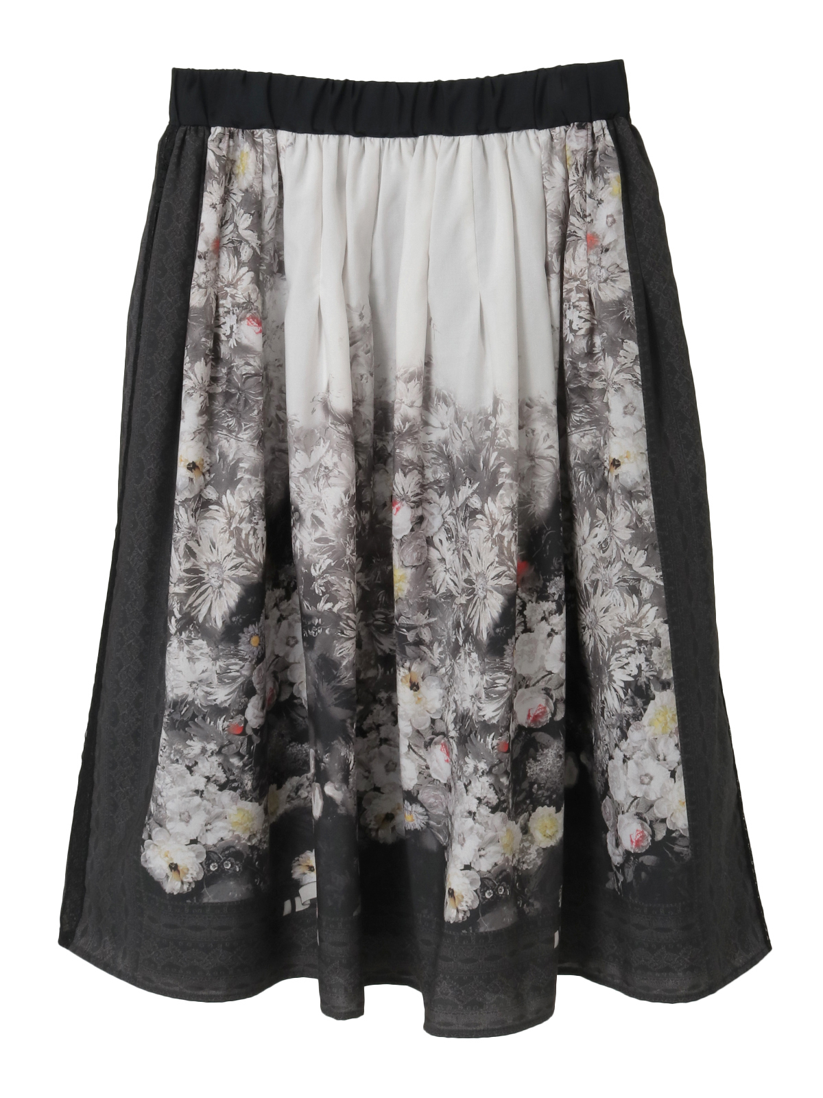 そんなストーリーを宿すプリント生地を贅沢に使用した、スカーフ風パネルデザインのミドル丈スカート。