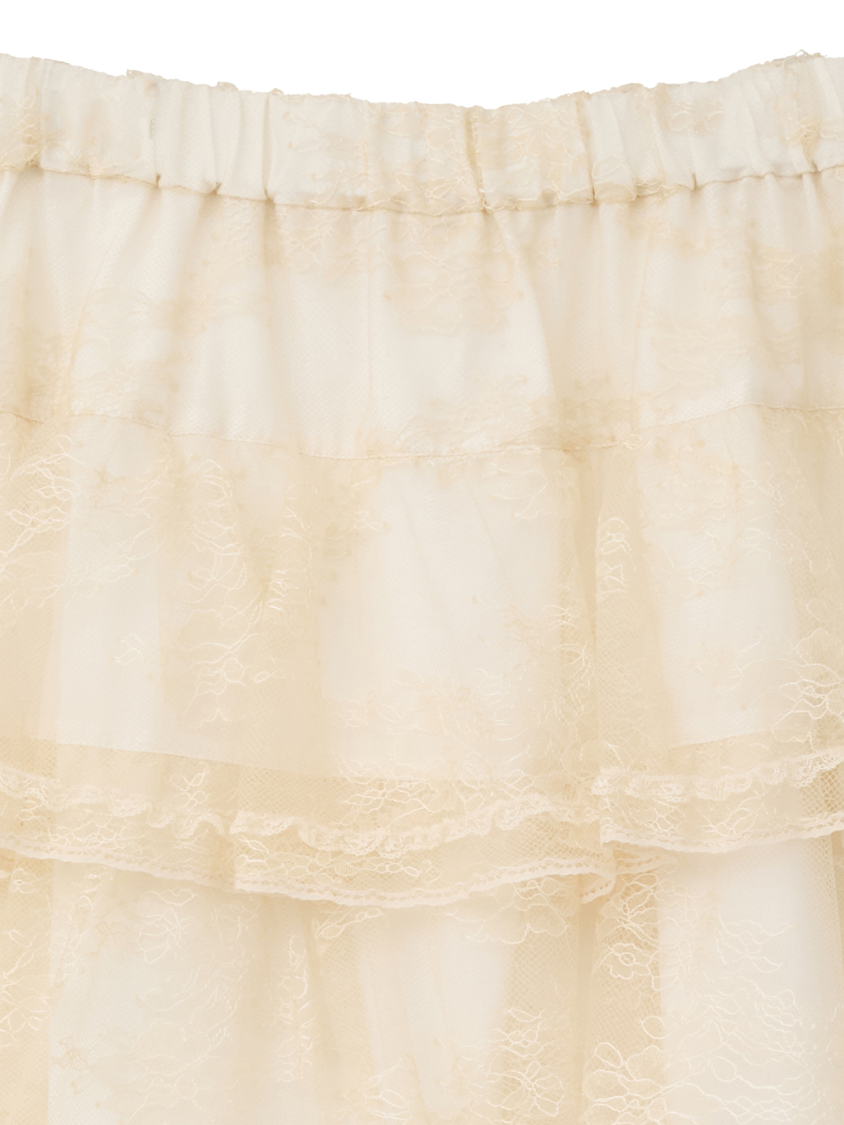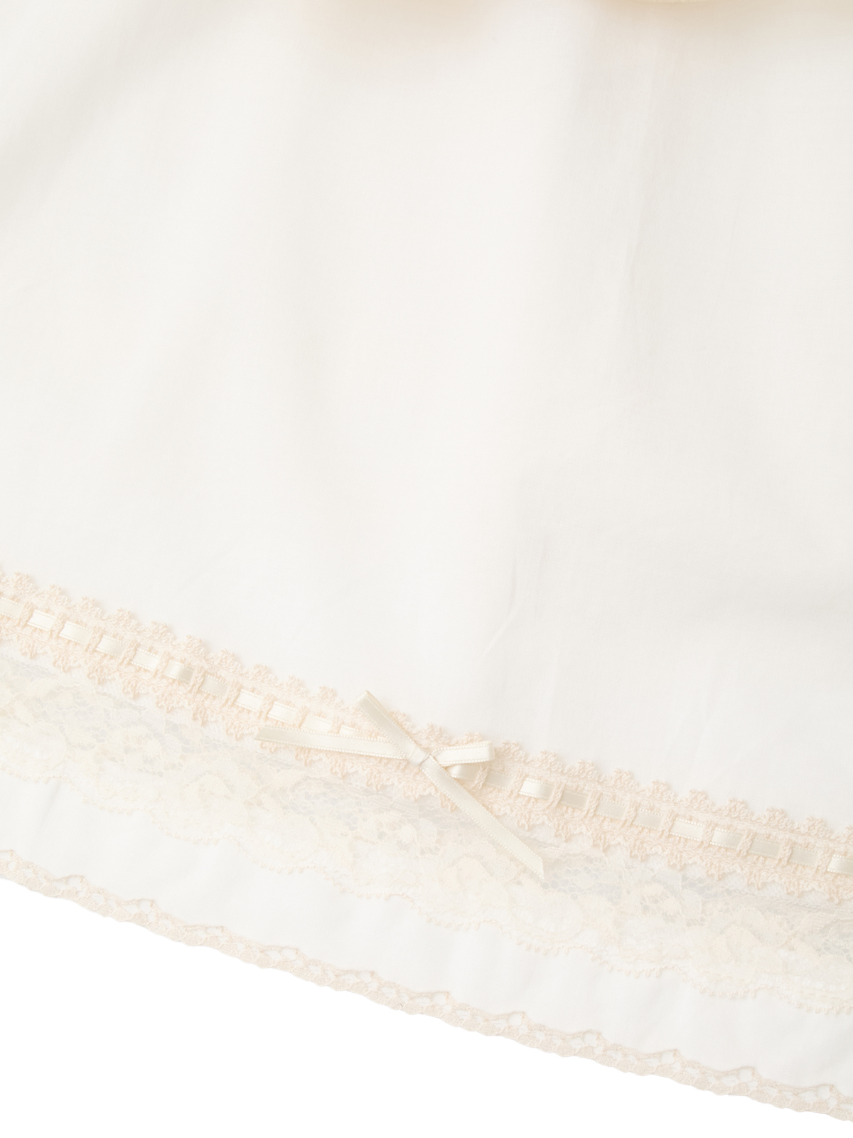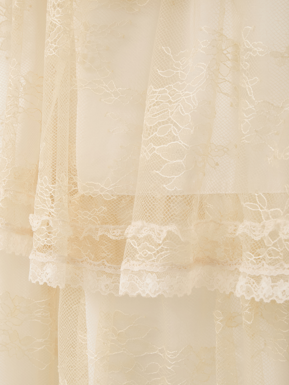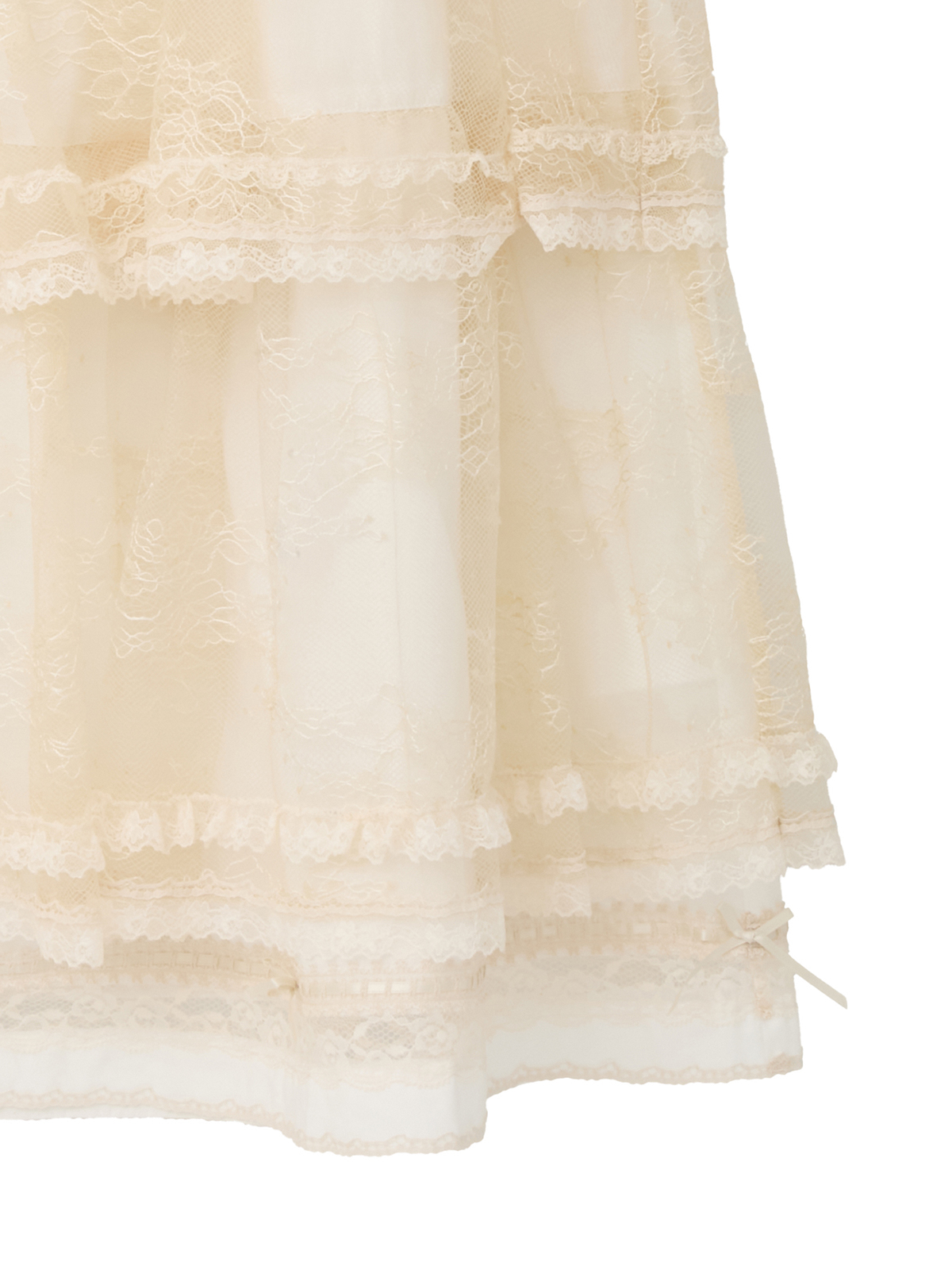 フリルの端に幾重にもあしらわれた糸レースが、繊細な光を纏うように上品な存在感を放ちます。
