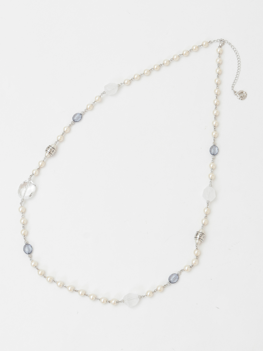 ブランドロゴを刻印したインゲボルグオリジナルのロンデルをアクセントに、大小さまざまなパーツを丁寧につないだロングネックレス。