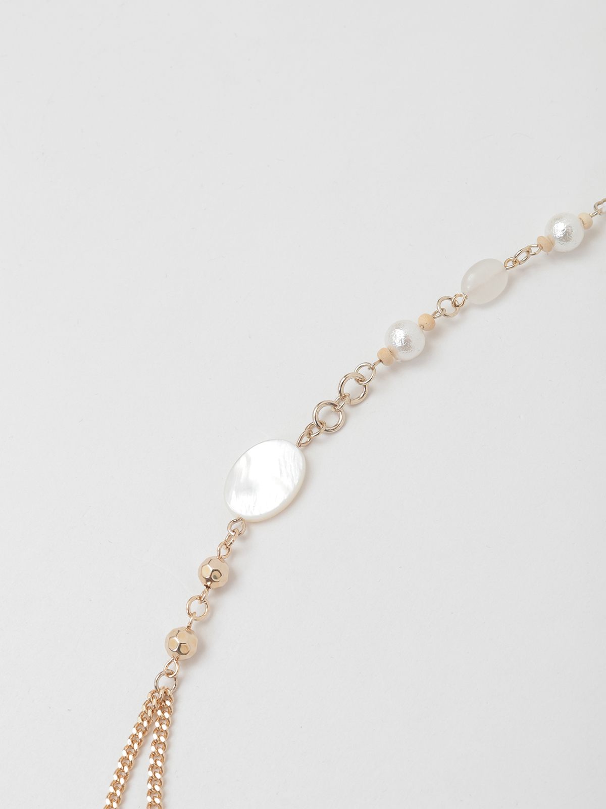 パール調ビーズや楕円形の貝殻、ウッドパーツ、樹脂パール、チェーンをリズミカルに組み合わせることで、ナチュラルな風合いと上品さが絶妙に調和したデザインに仕上げました。