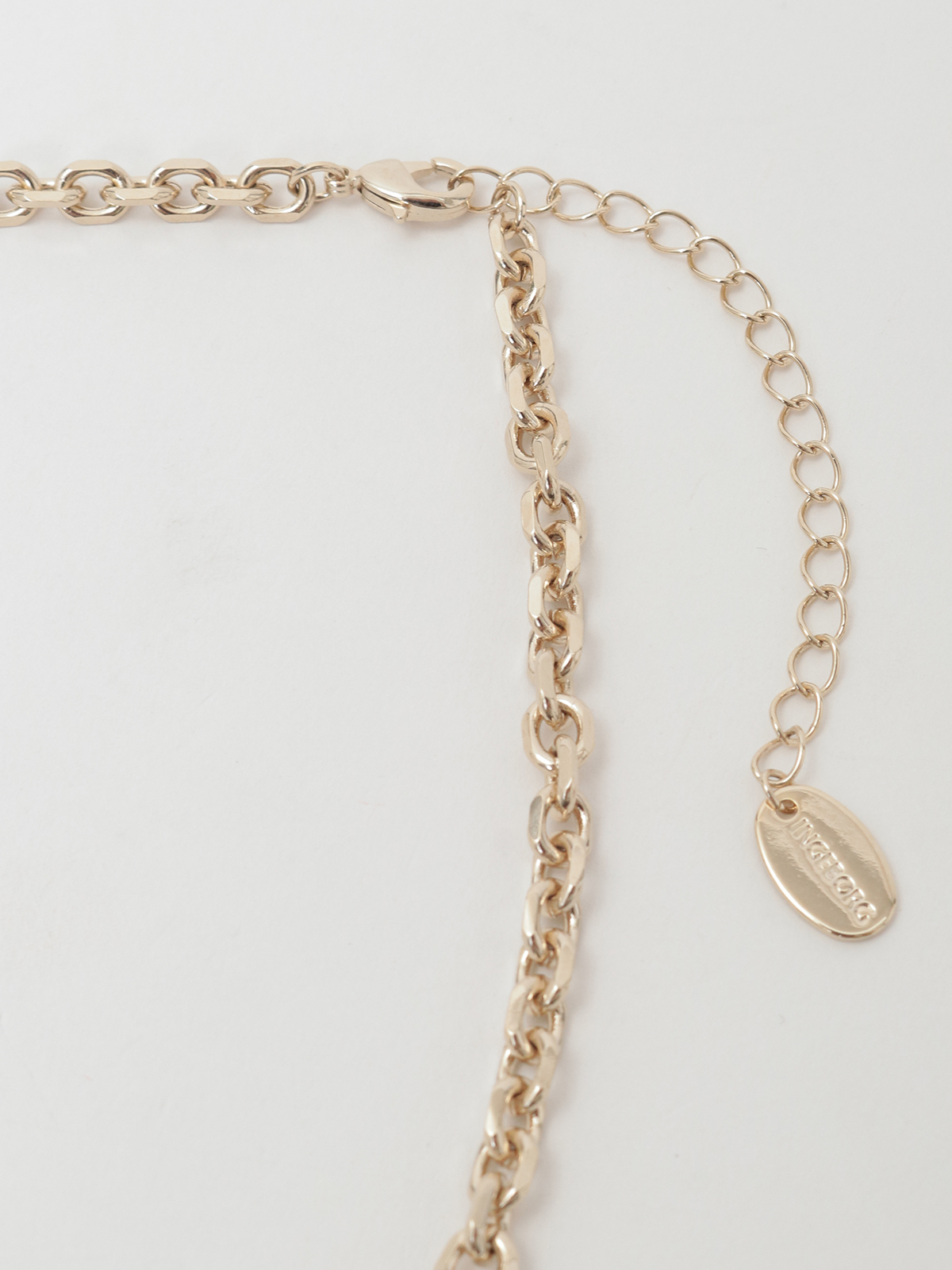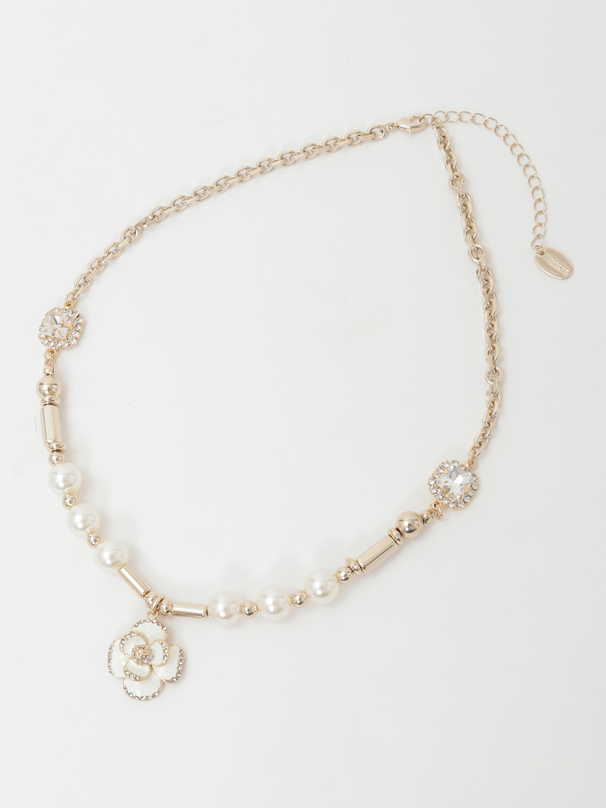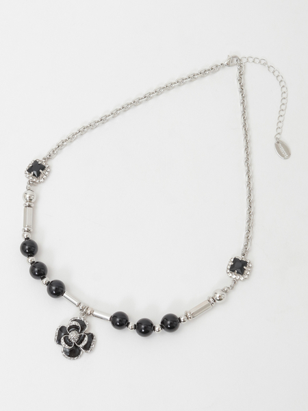 繊細なカメリアのトップチャームと、多彩な形状のパーツを巧みに繋ぎ合わせたショートネックレス。