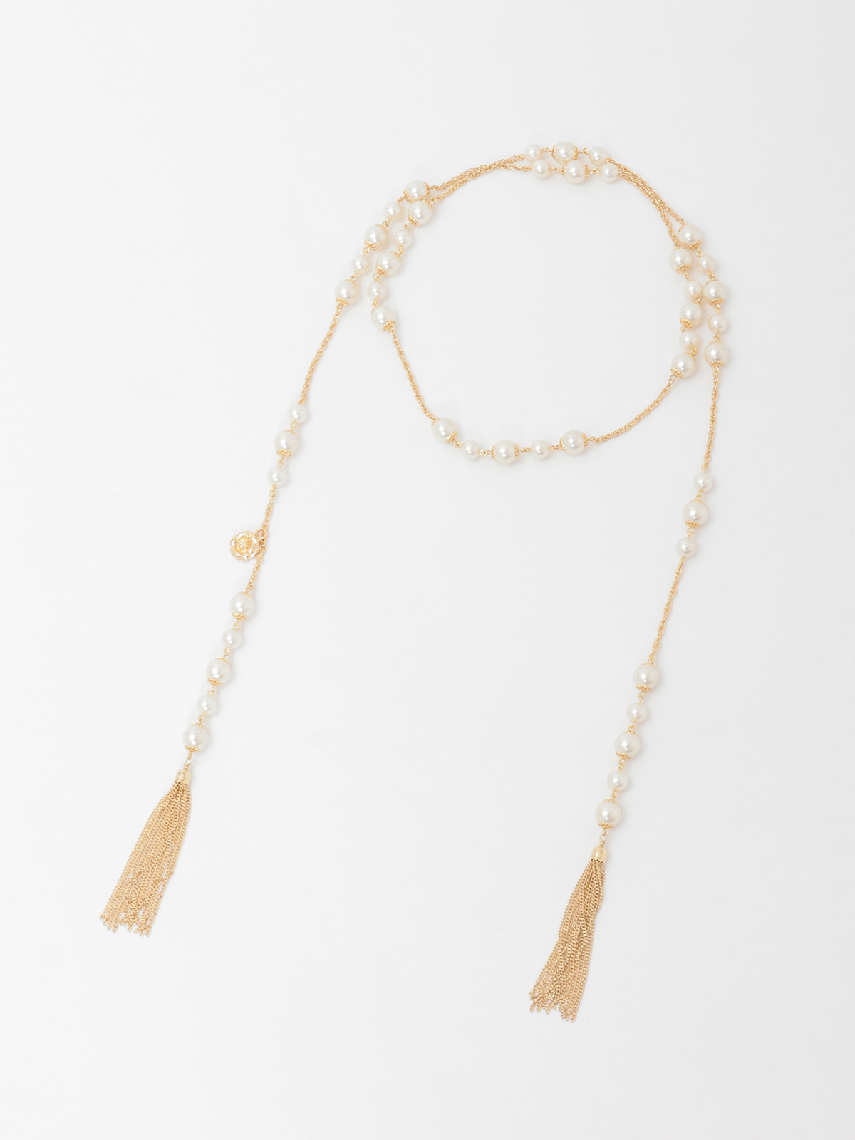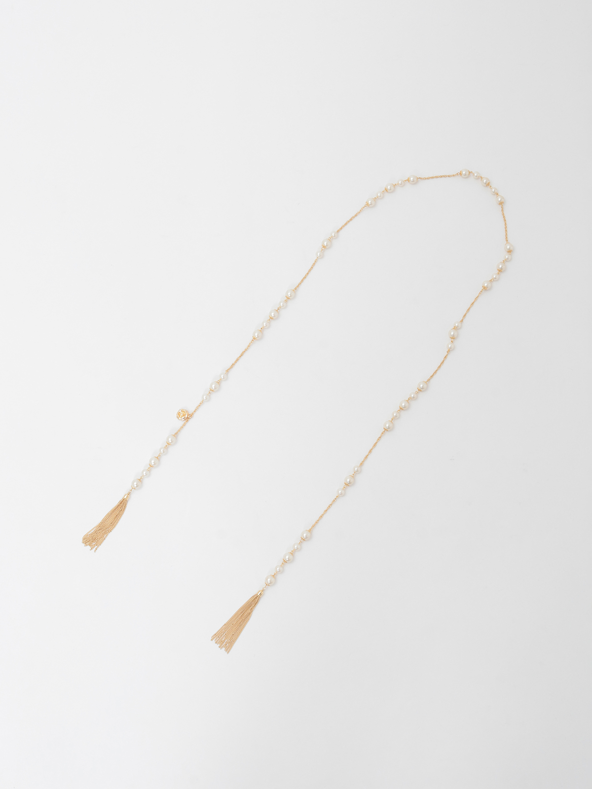 ふんわりとした女性らしさと、華やかさを両立させたチェーンフリンジラリエットで、あなたの装いをワンランク上に。