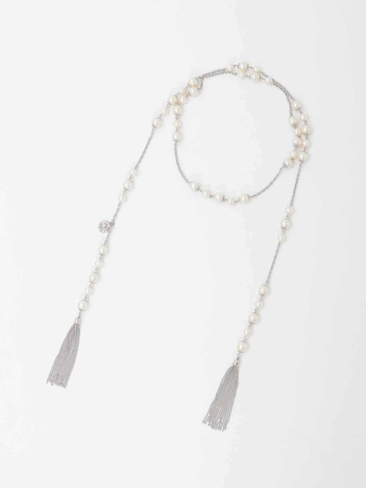 大小のパールとオーバルチェーンがリズミカルに並び、動きに合わせて柔らかく輝くデザインは、首元に上品なアクセントを添えます。