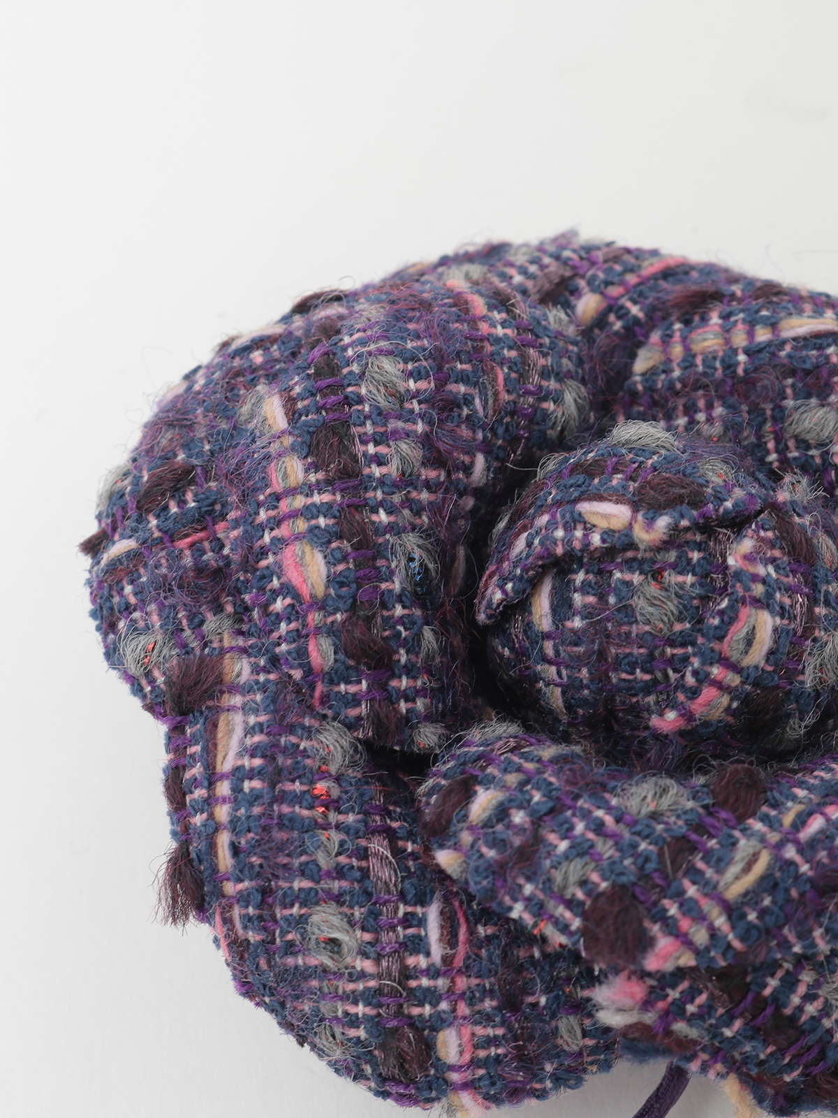 英国の老舗ファブリックメーカー「リントン社」のコレクションからインゲボルグが色違いで厳選した4マークのツイードを使用し、ブランドのアイコン的存在であるカメリアコサージュを仕立てました。