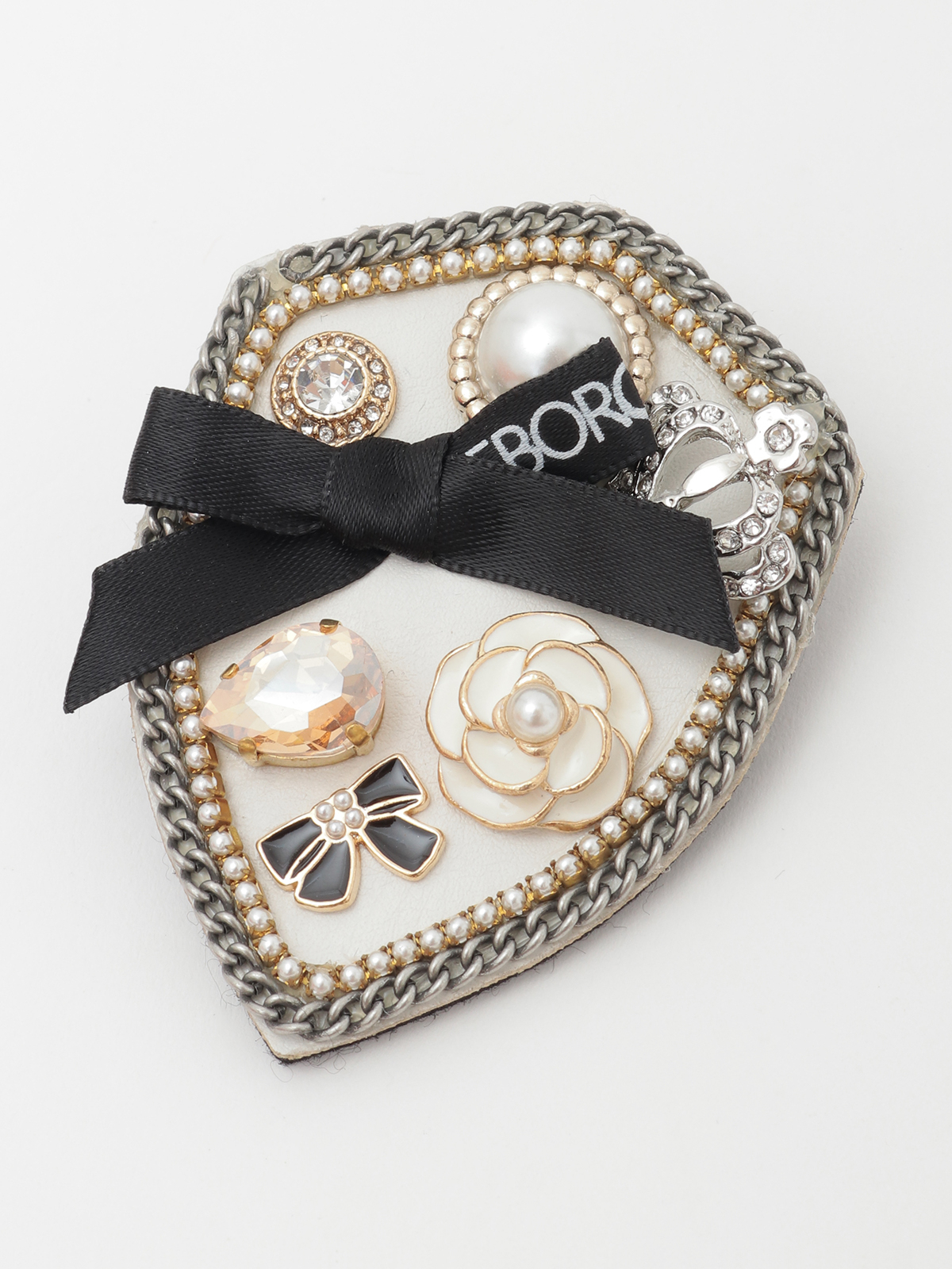 カメリア、王冠、カメリアリボン、サテンリボンパーツを絶妙なバランスで組み合わせた、立体的なエンブレムブローチ。