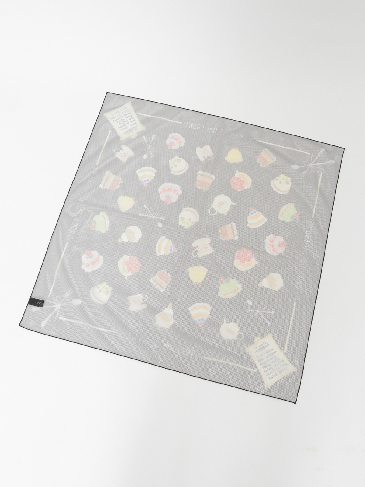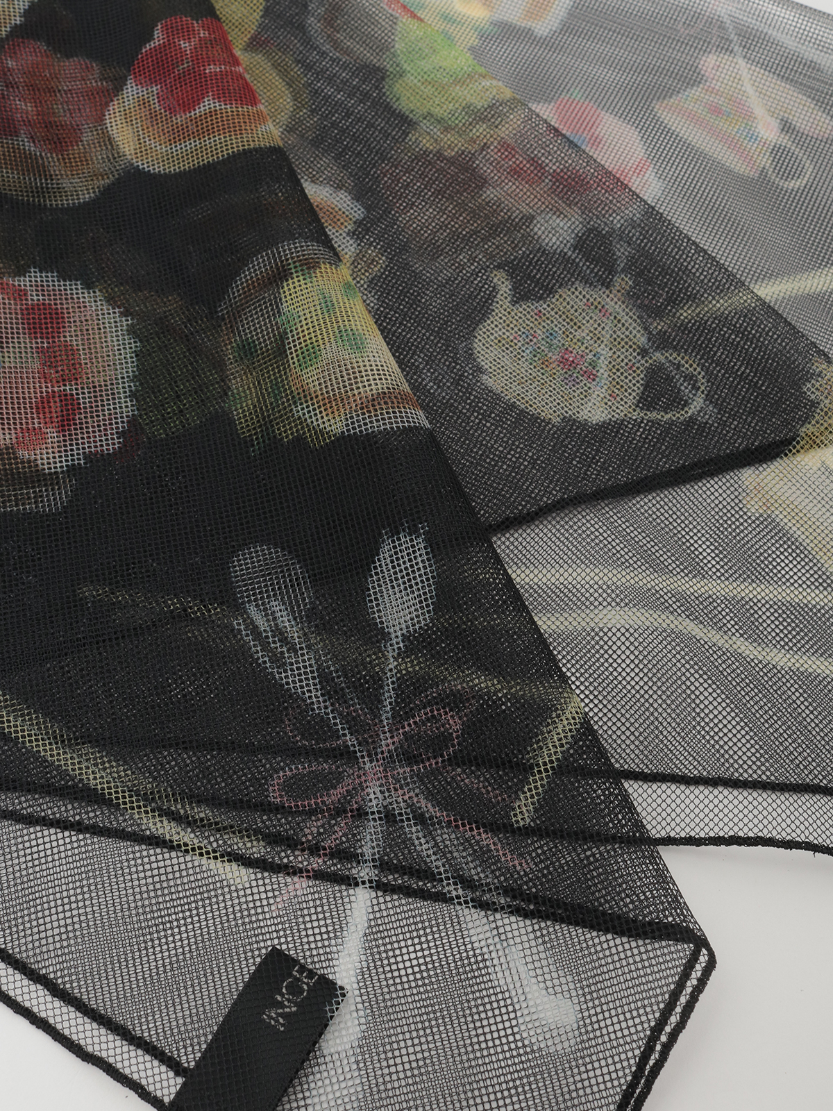透け感のある柔らかなチュール素材に、スイーツをモチーフにしたケーキ柄をレイアウト。