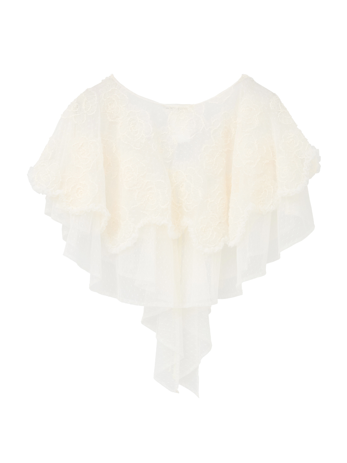 繊細なチュールに立体的に浮かび上がるカメリアの花模様が、優雅な存在感を放つフリルストール。
