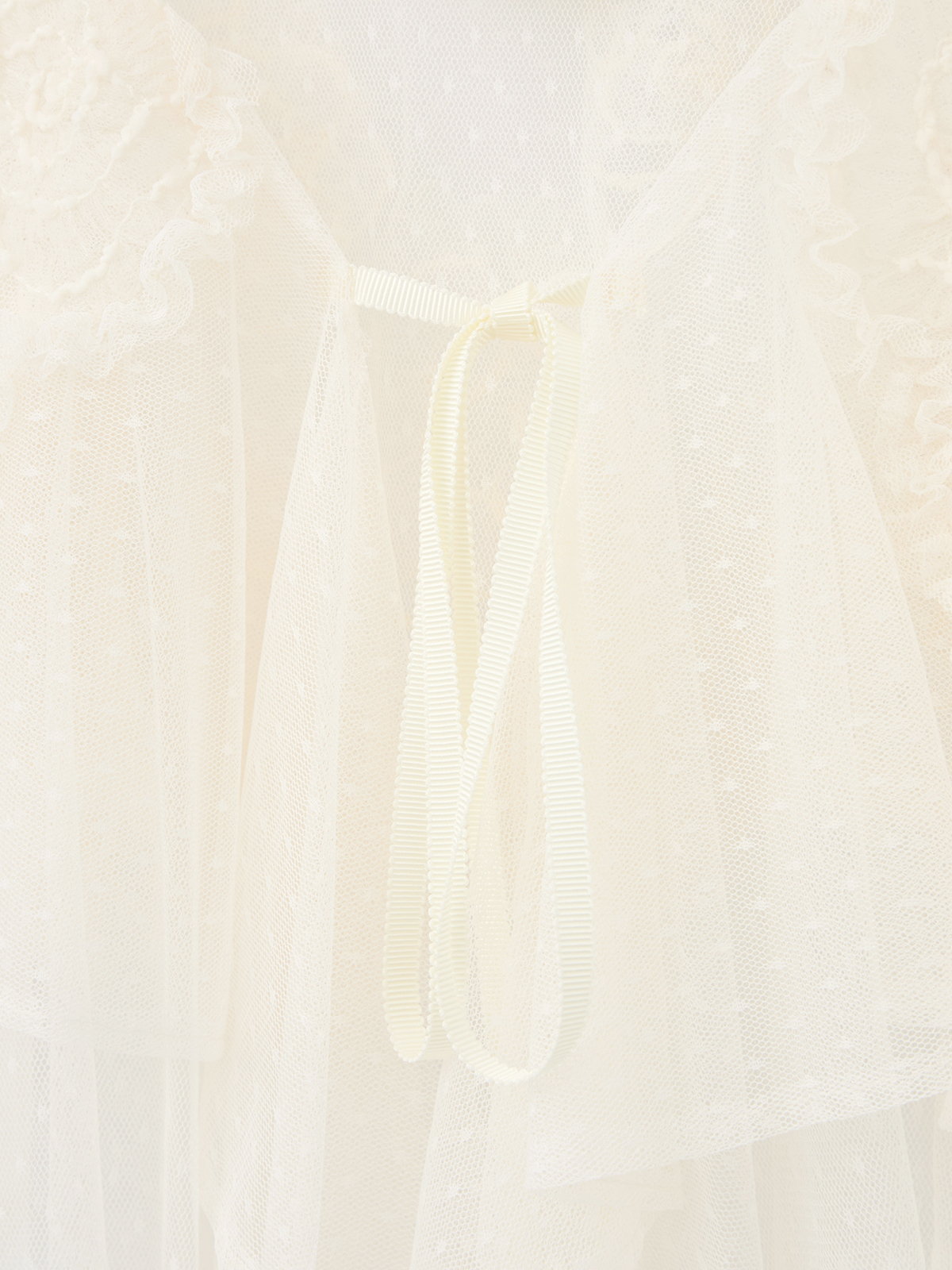 前中心のリボンで着脱でき、ドットチュールフリルとカメリアチュールレースの二重重ねが華やかさと奥行きを演出。