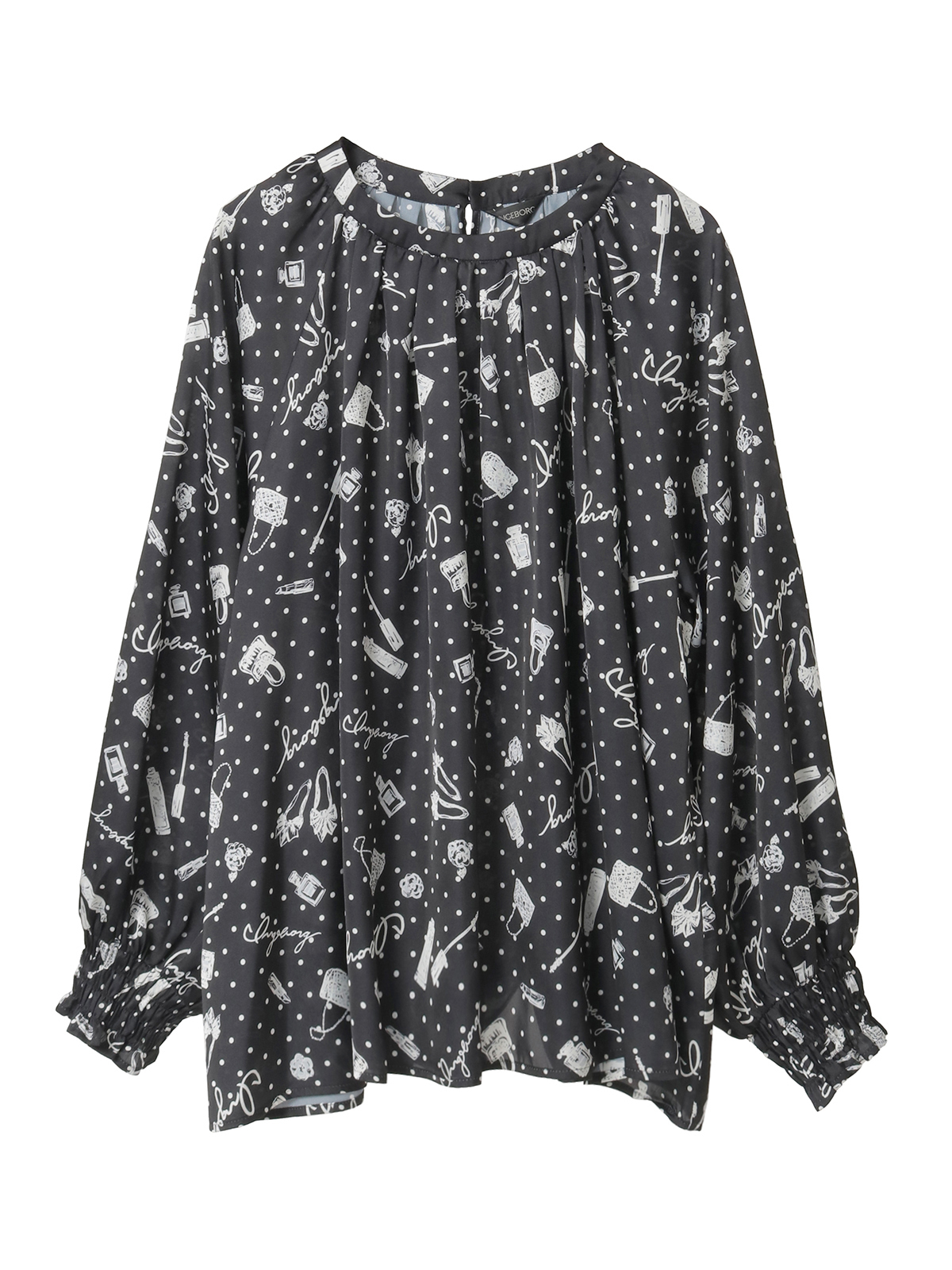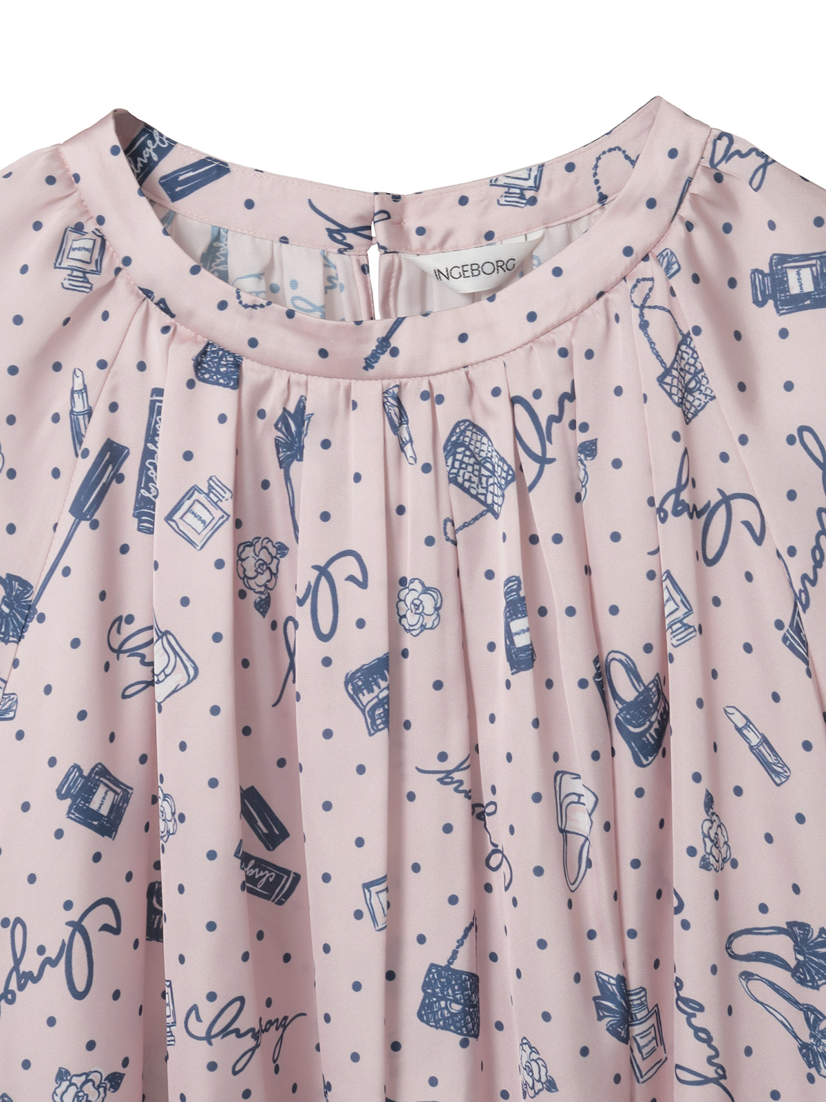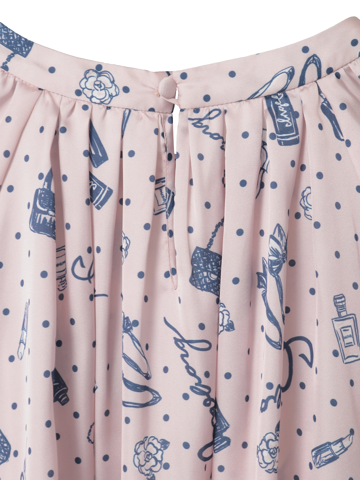 光沢を控えたポリエステルサテンに、手描きのバッグや香水瓶を思わせるモチーフを散りばめ、どこか懐かしく、それでいて新鮮な表情に仕上げました。