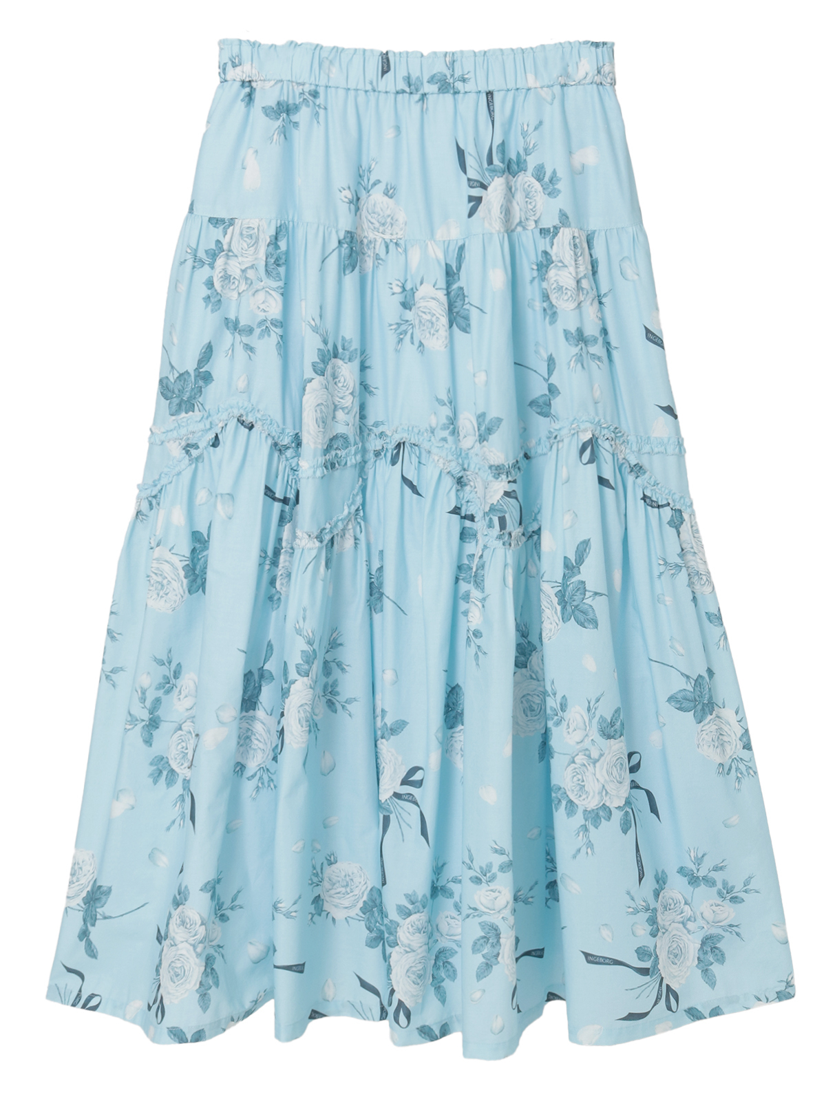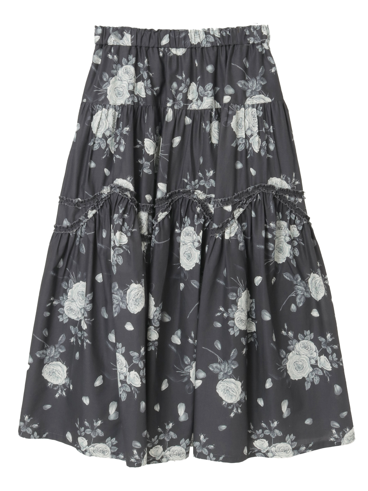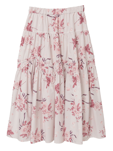 エッチング版画のように繊細な線で描かれたローズが、静かに物語を咲かせるティアードスカート。