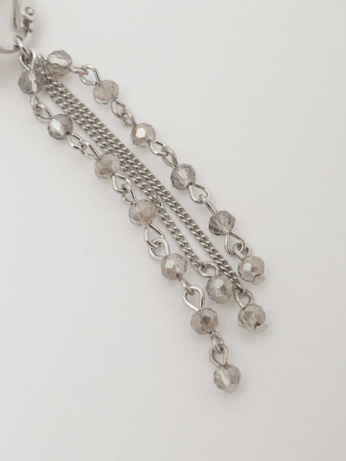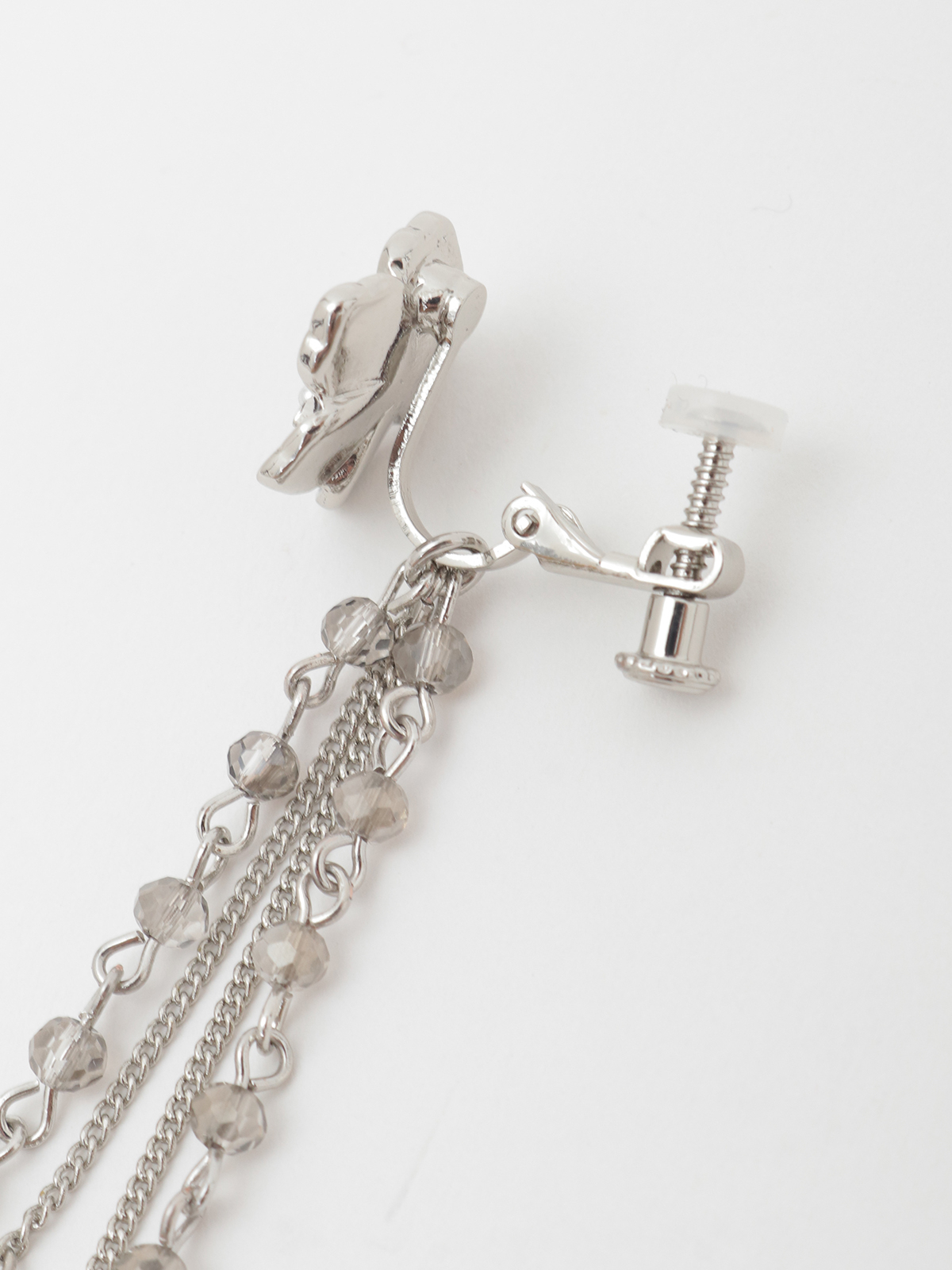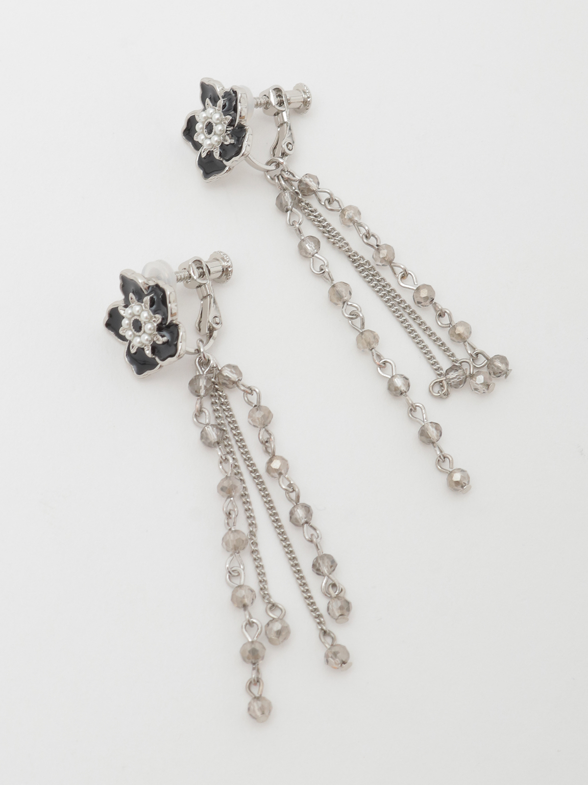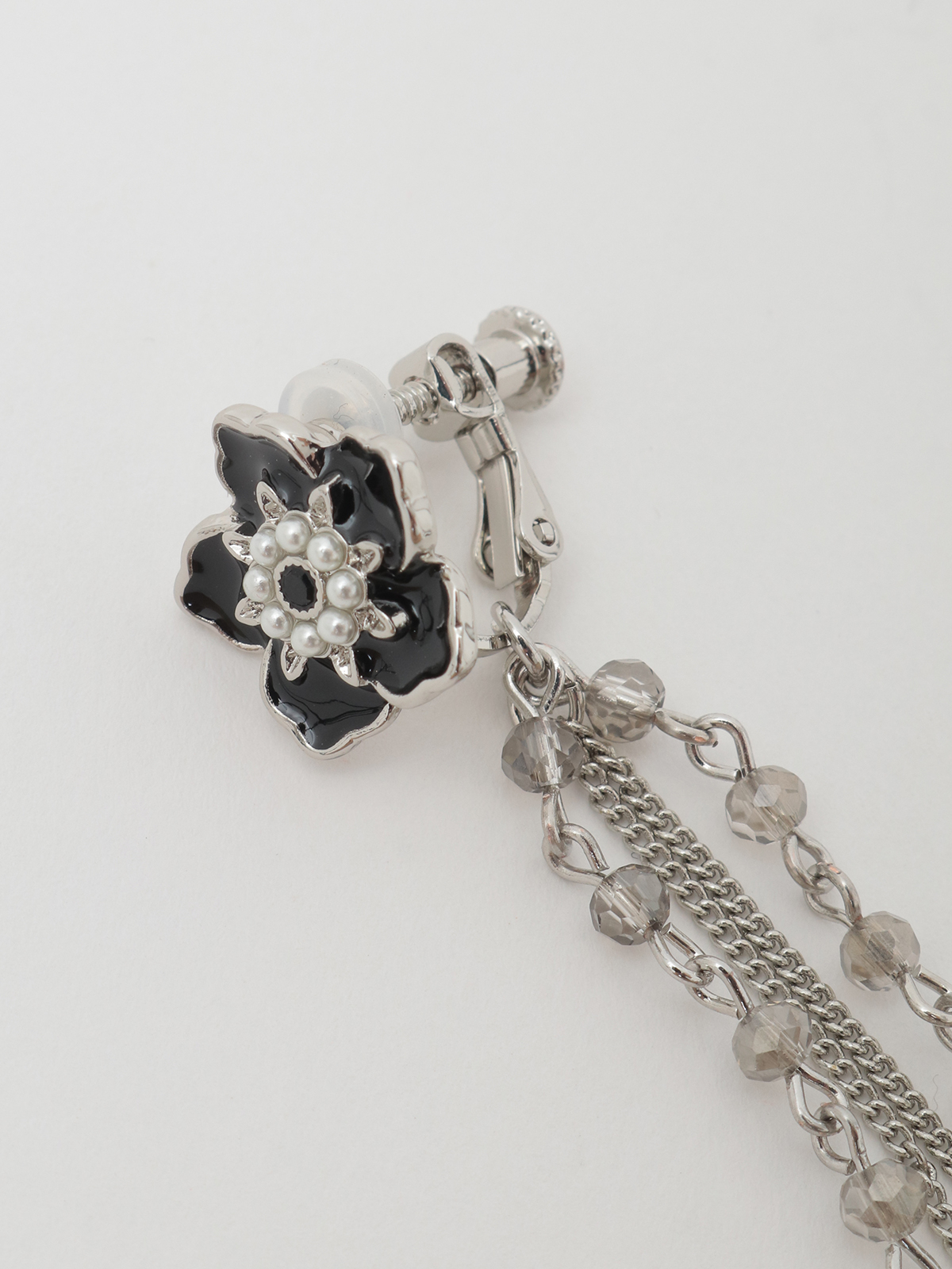 小さな花のチャームから、華奢なチェーンとビーズチェーンが静かに垂れ下がり、動くたびに繊細なきらめきを描きます。