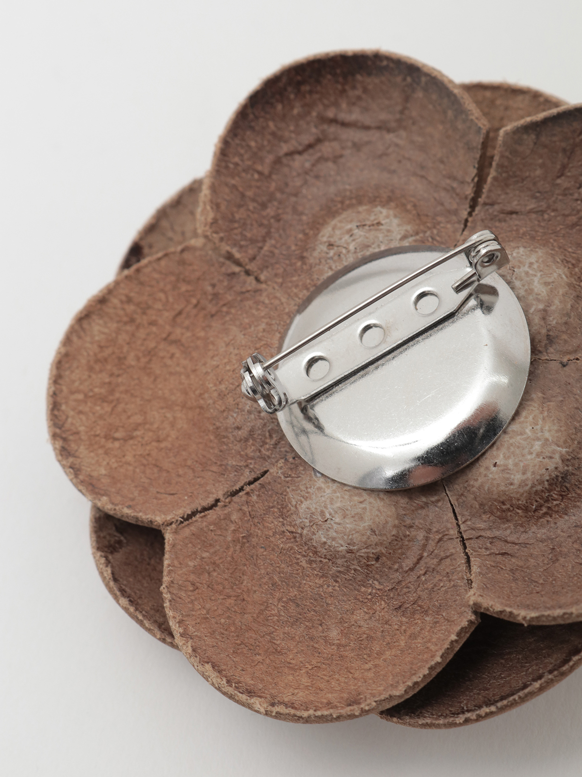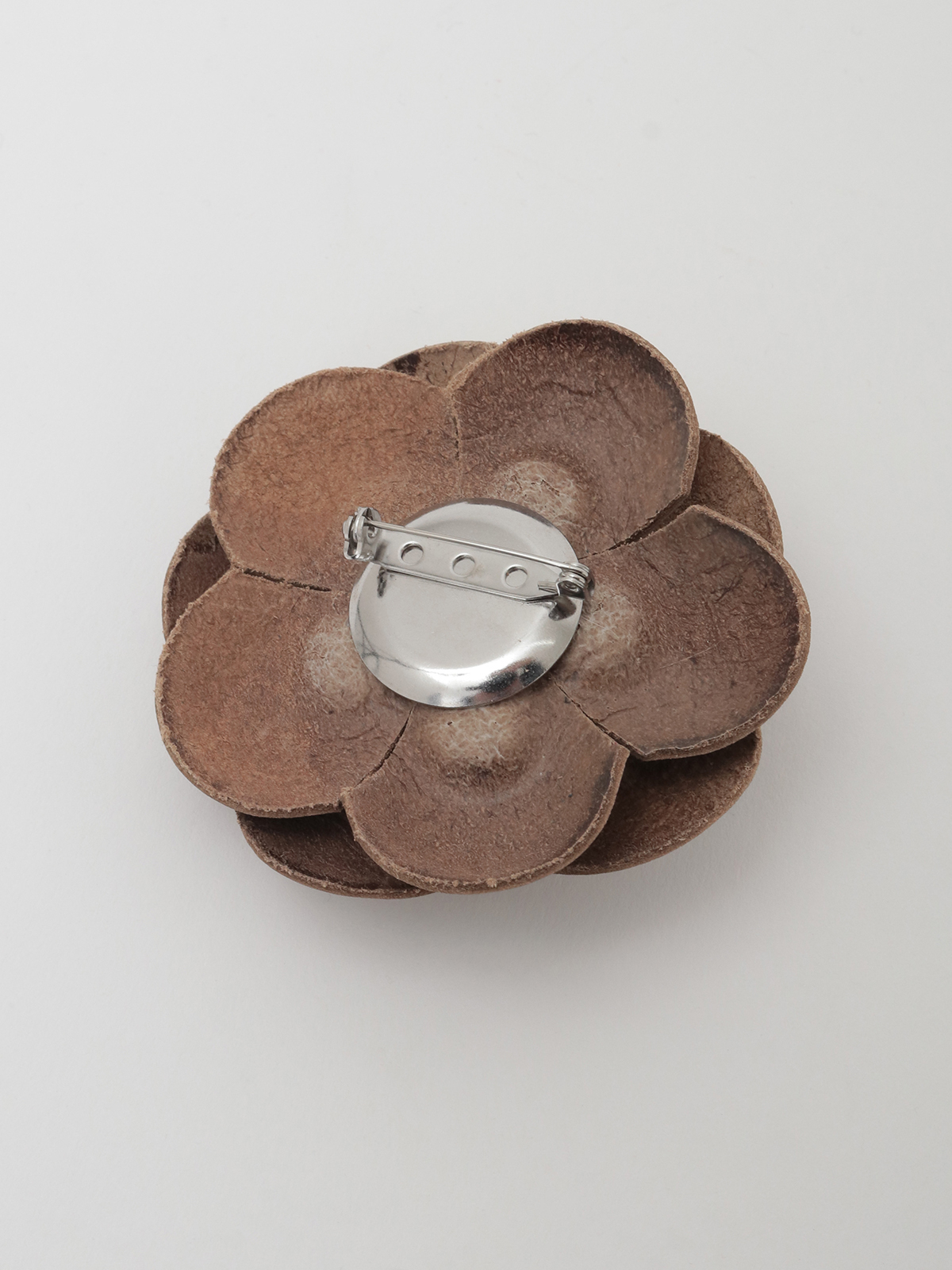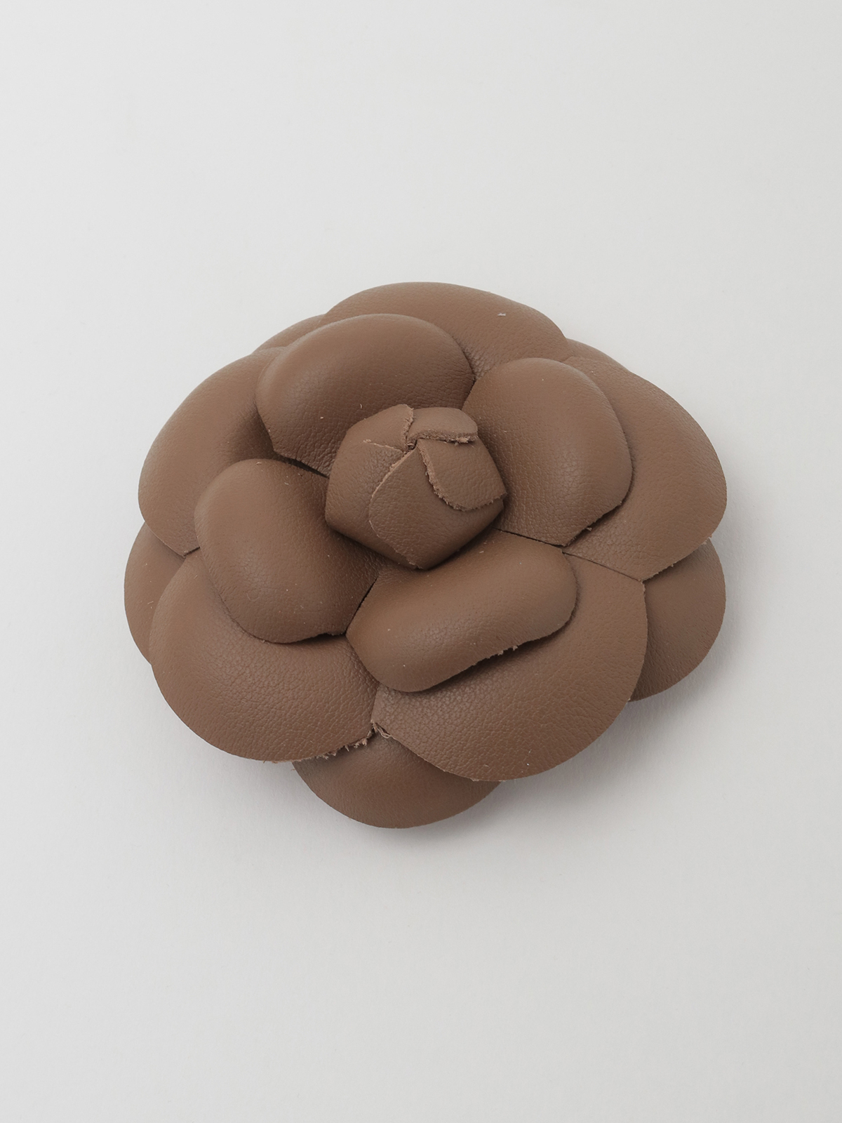 アクセントとなるカメリアブローチは、着こなしに華やかさと上品な表情をプラス。