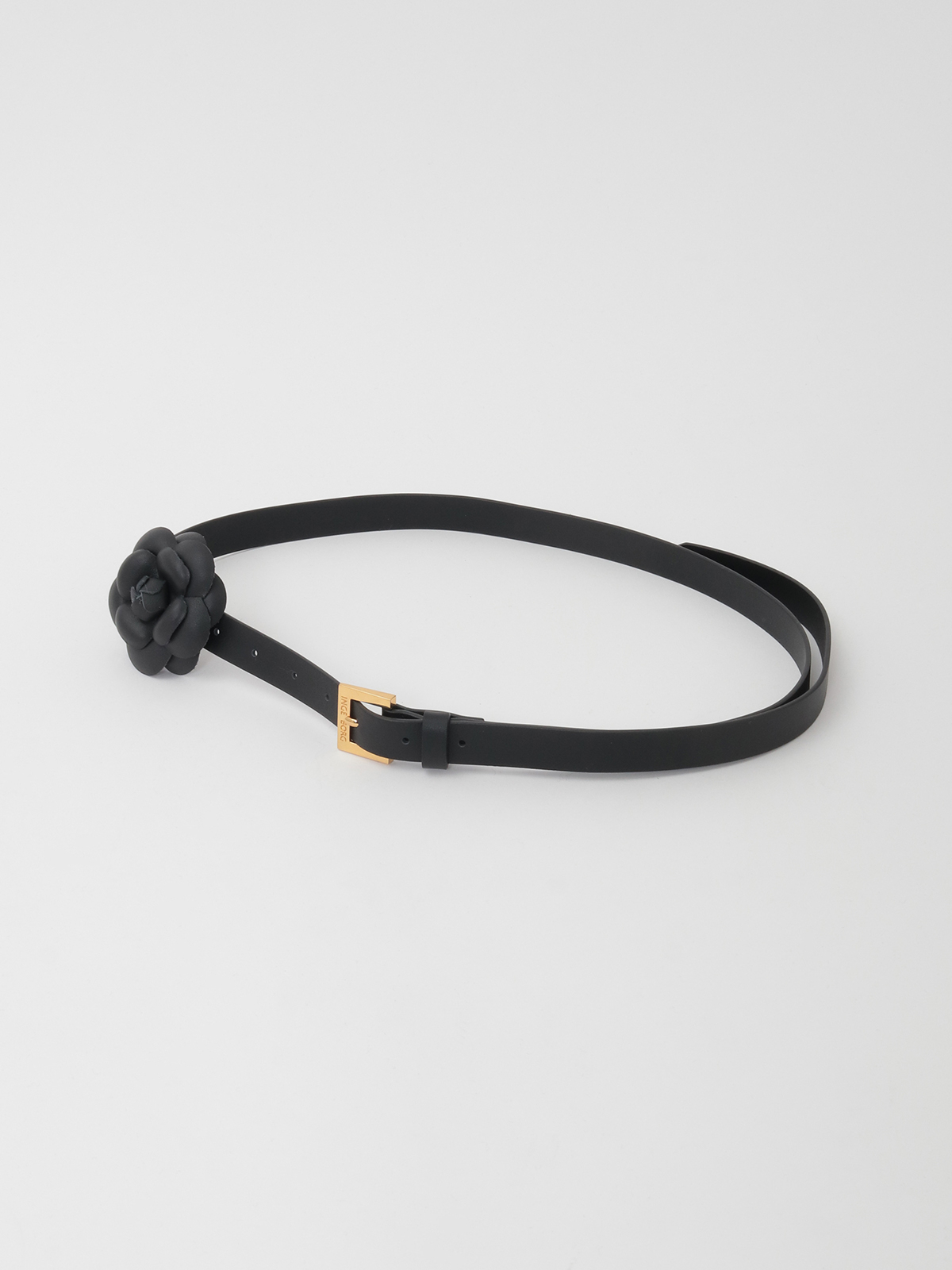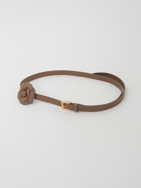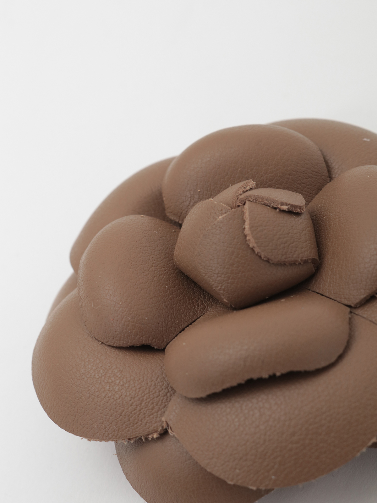 アクセントとなるカメリアブローチは、着こなしに華やかさと上品な表情をプラス。