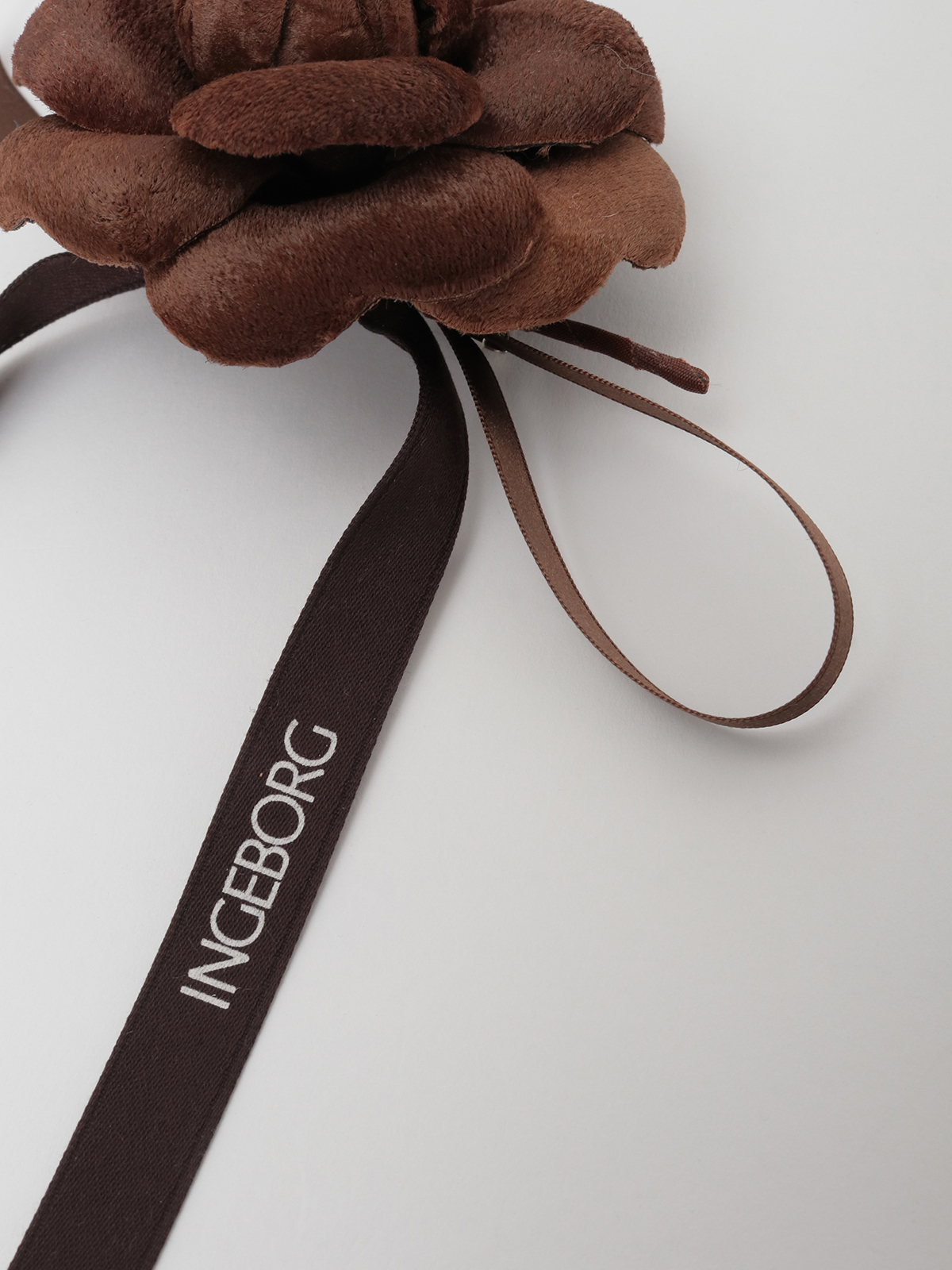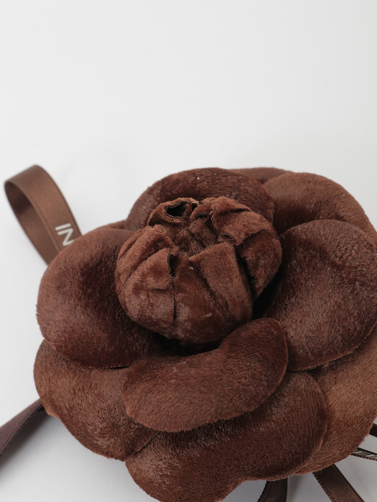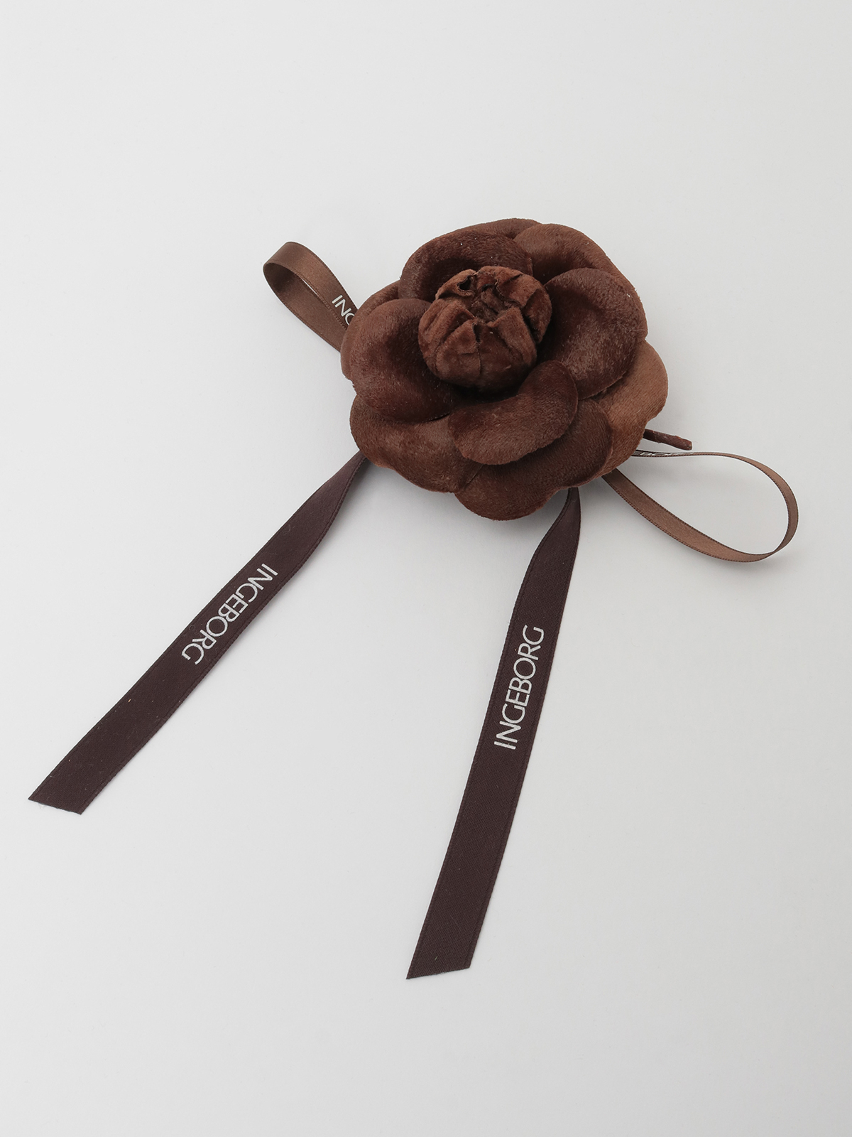 “メゾンドカメリア”プリントに描かれた、チョコレートのようなカメリアコサージュ。