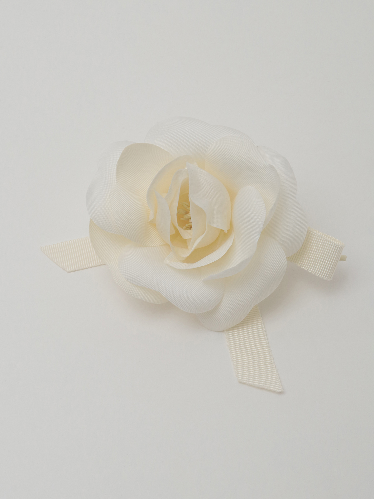 柔らかく動きのある花びらが、まるでそよ風に揺れる花のように優雅に広がるホワイトカメリアコサージュ。