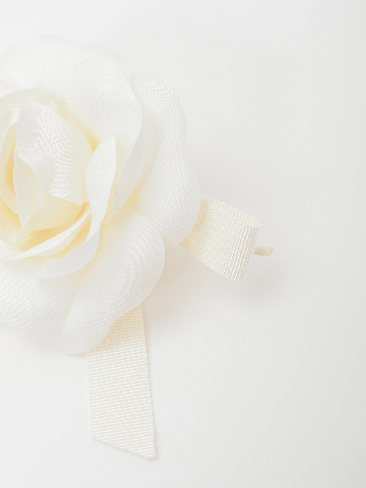 そっと結ばれたグログランリボンが上品なアクセントとなり、胸元やバッグ、ヘアアクセサリーとしても洗練された存在感を放ちます。