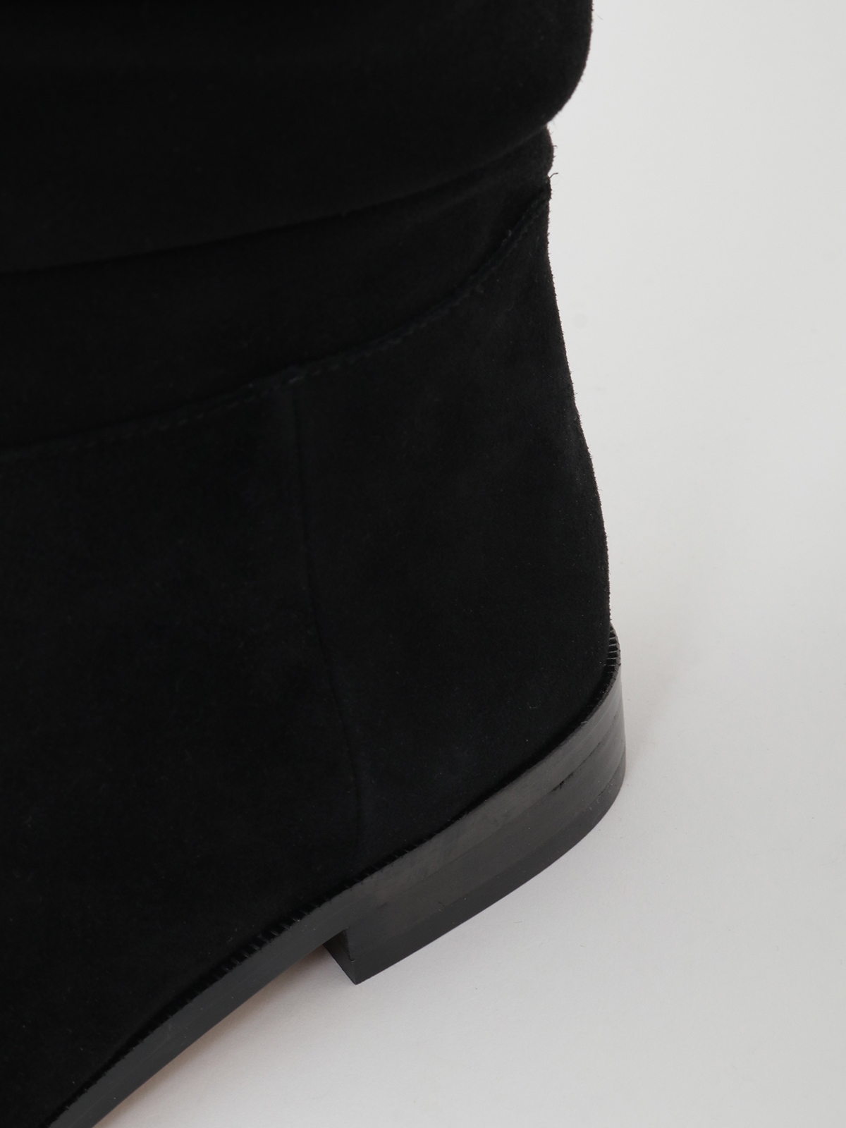 脛から足首にかけて施されたギャザーが、歩くたびに柔らかく揺れ、軽やかな表情を生み出すロングブーツ。