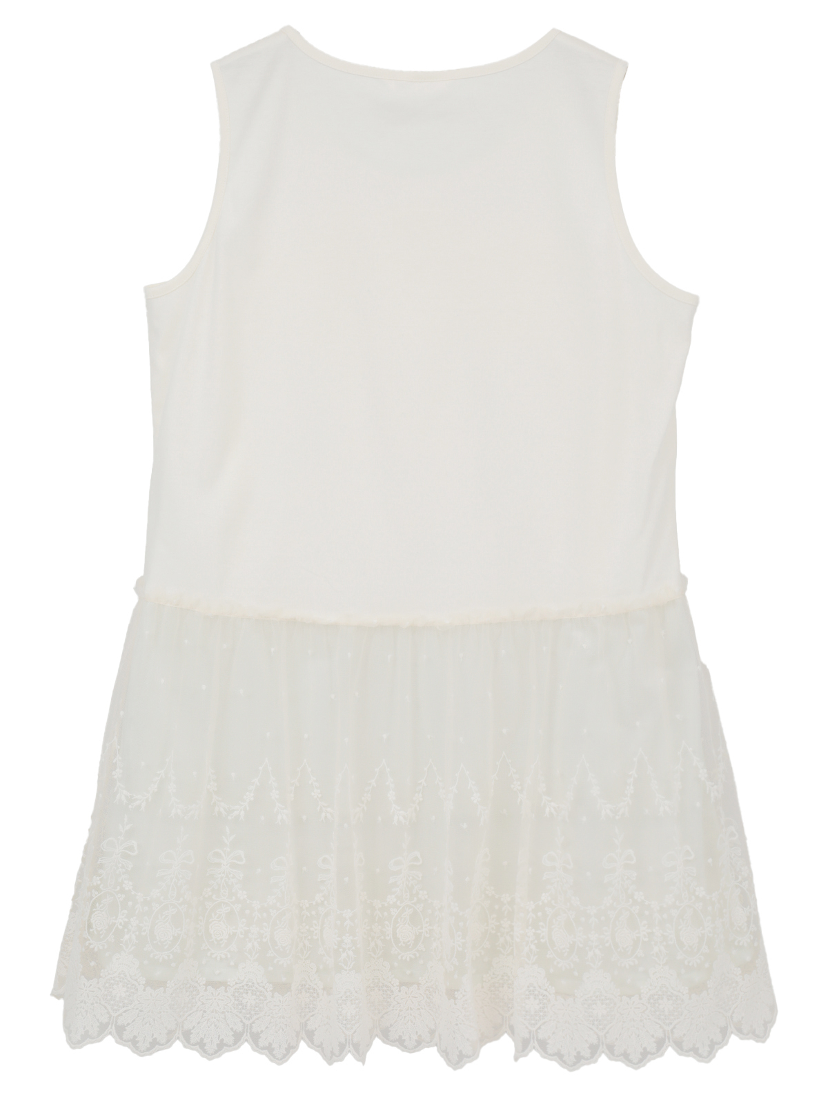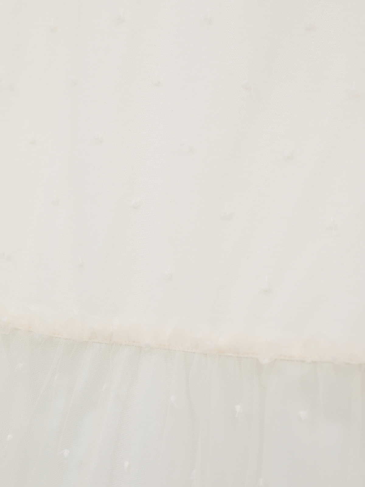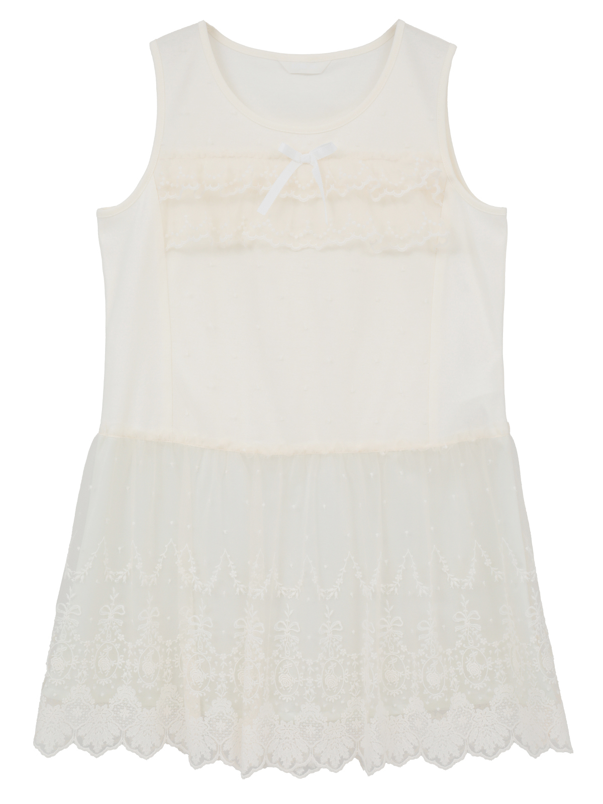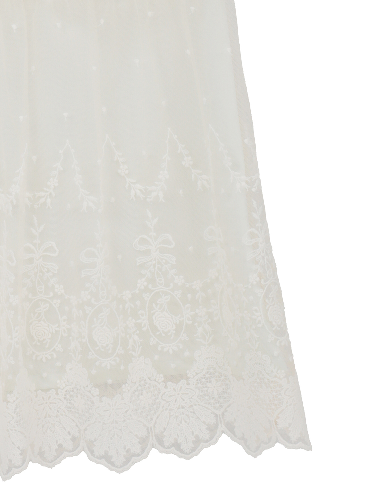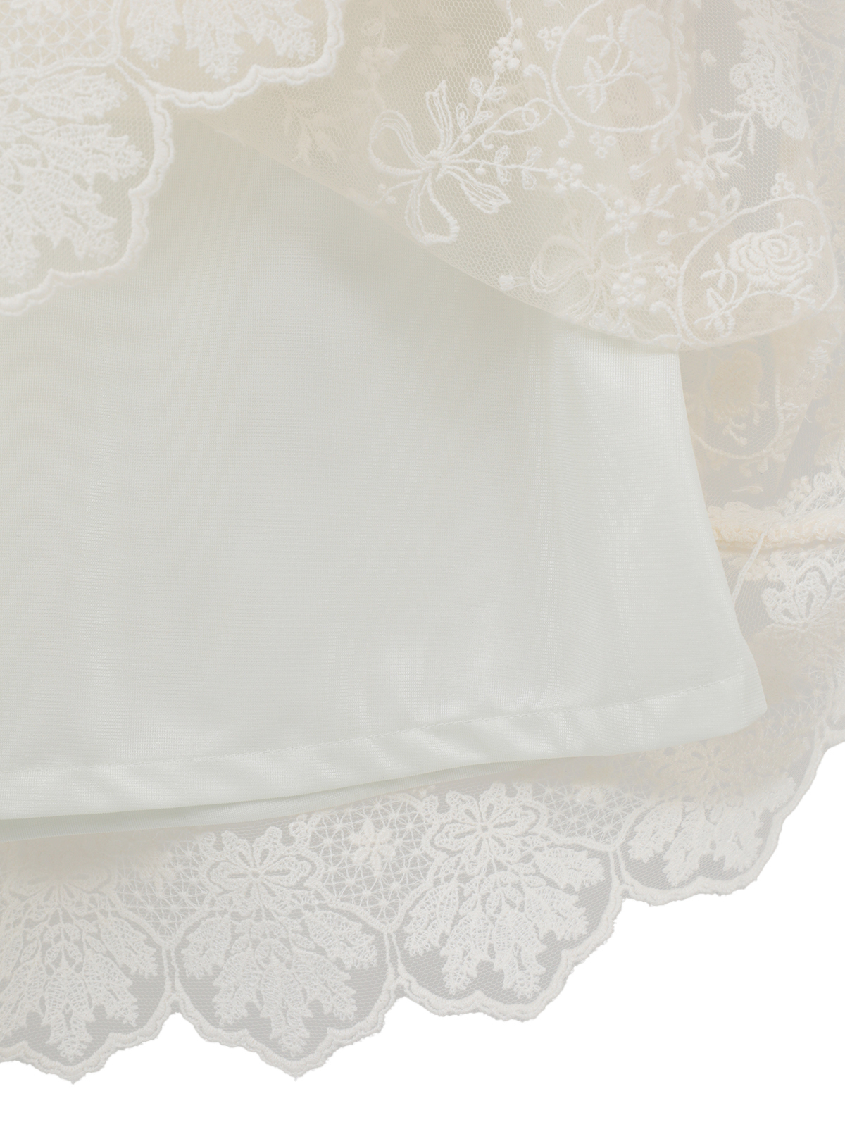 ウエスト下からはギャザーを寄せたレースがふんわりと広がり、動きに合わせてやわらかく揺れるフェミニンなラインを描きます。