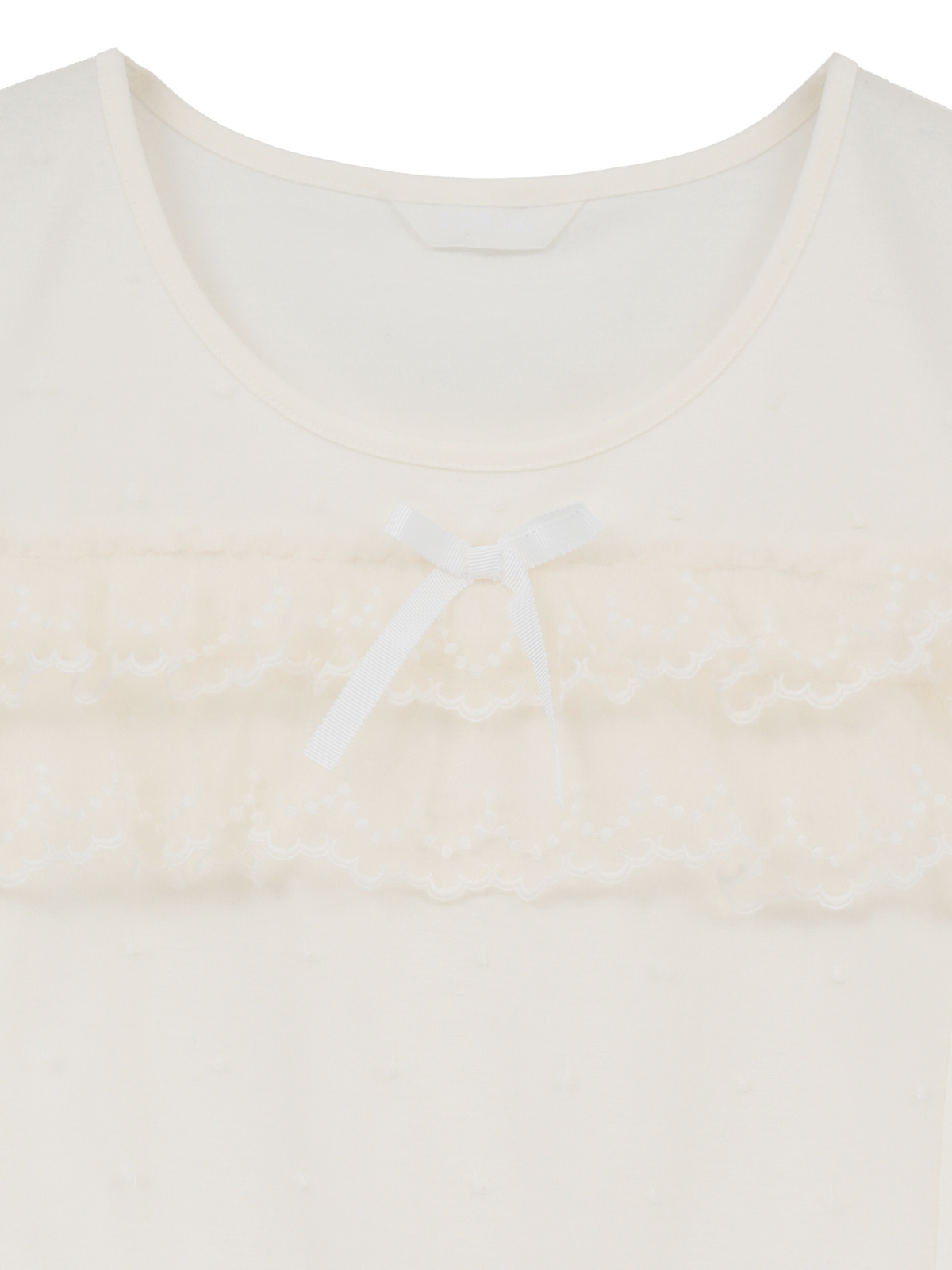 胸元には2本のフリルレースを配し、さりげない立体感と華やぎをプラス。