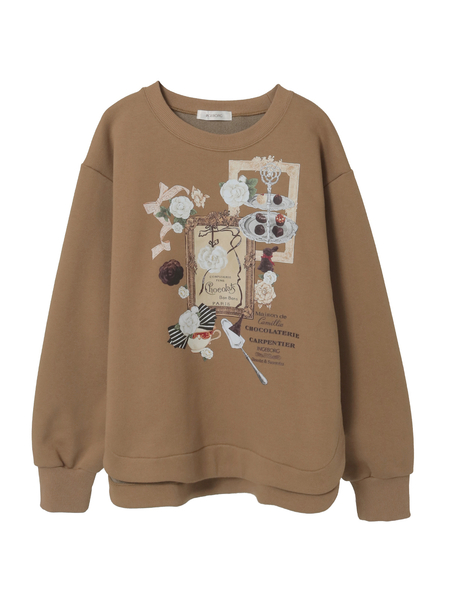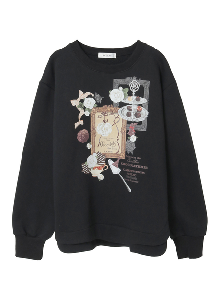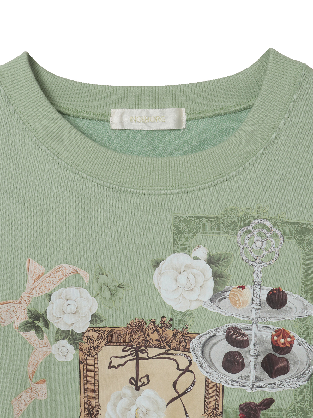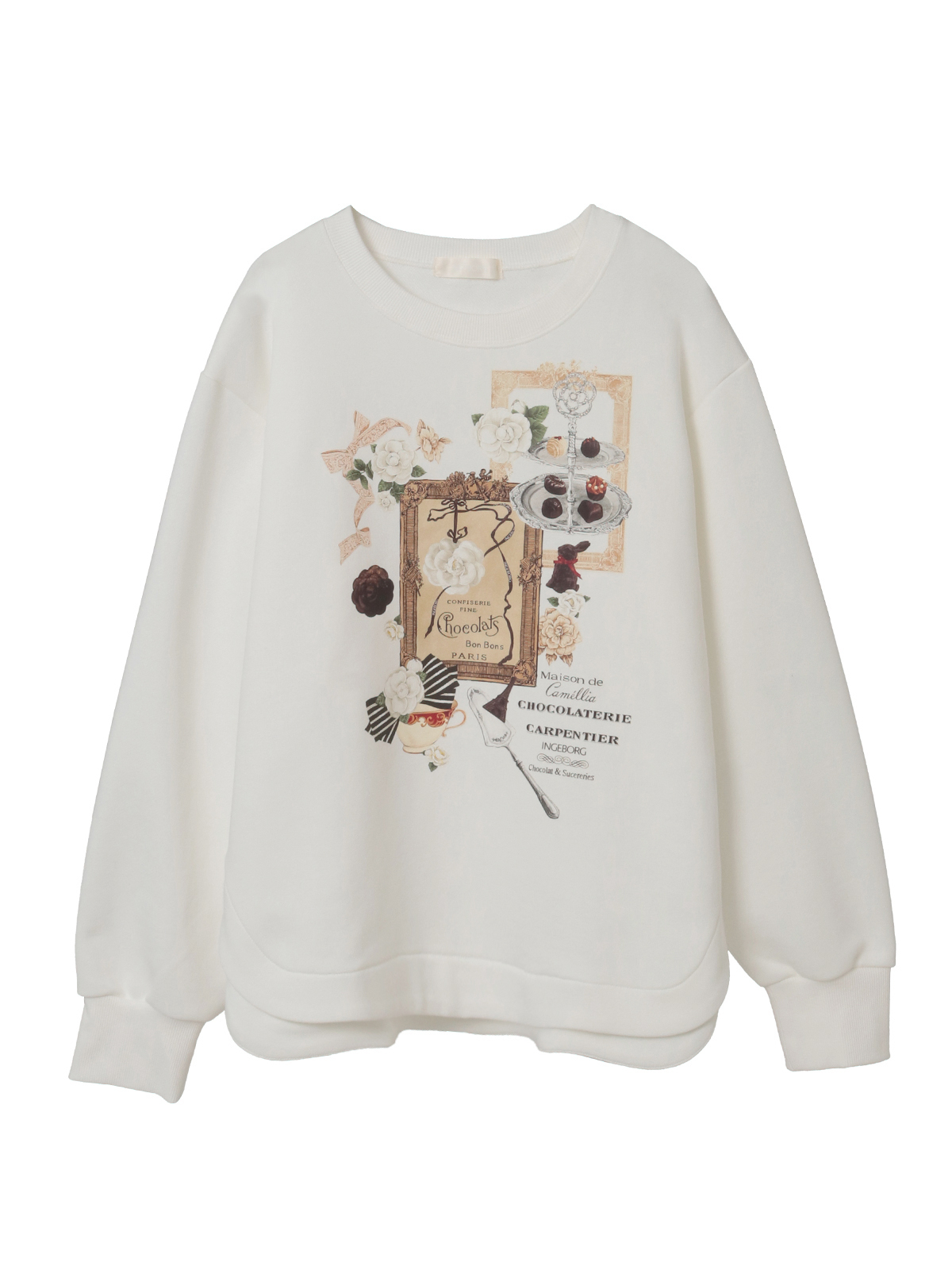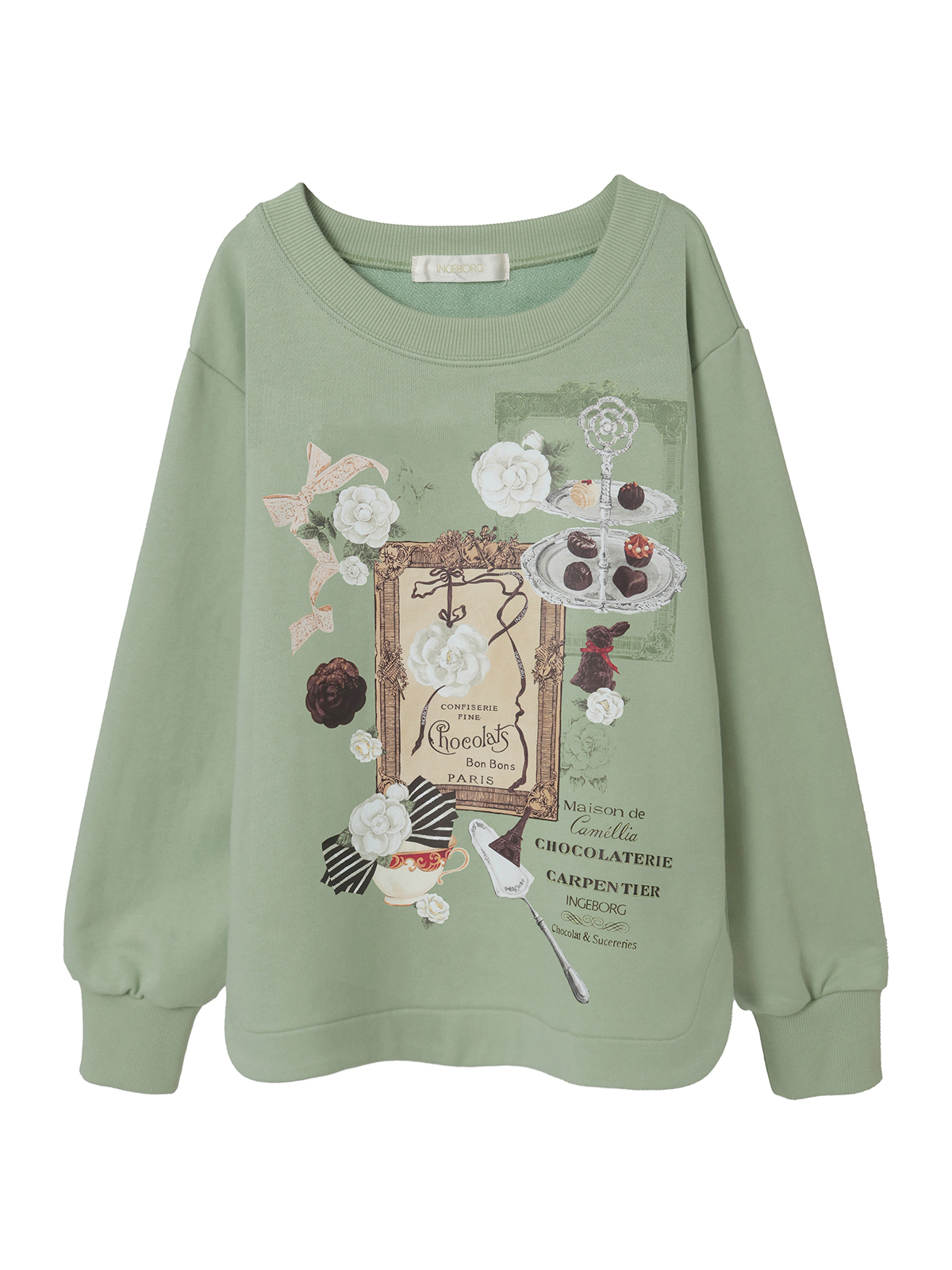 その甘く美しい世界を閉じ込めた、INGEBORGのエレガントスイーツ柄『メゾンドカメリアpt.』を前身ごろにプリントしたトレーナーです。