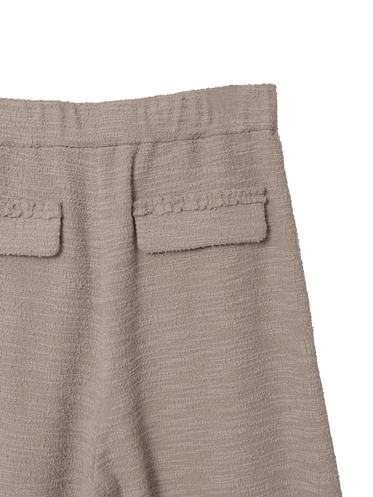 サイドポケット付き、後ろのフラップポケットには控えめなフリルをあしらい、裾にも一本のフリルが優雅な表情を生み出します。