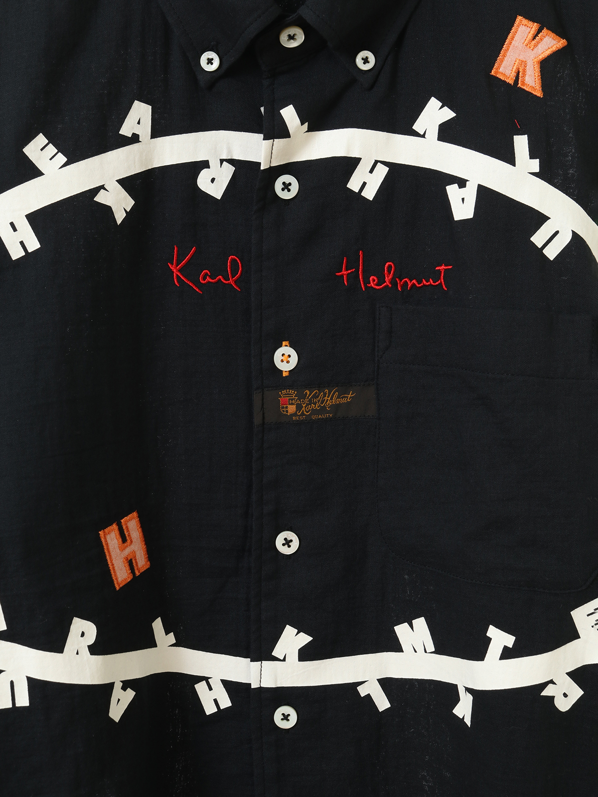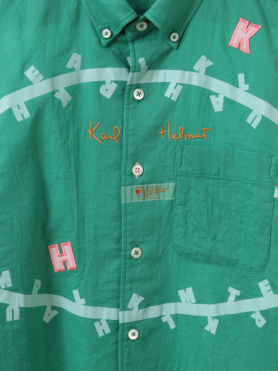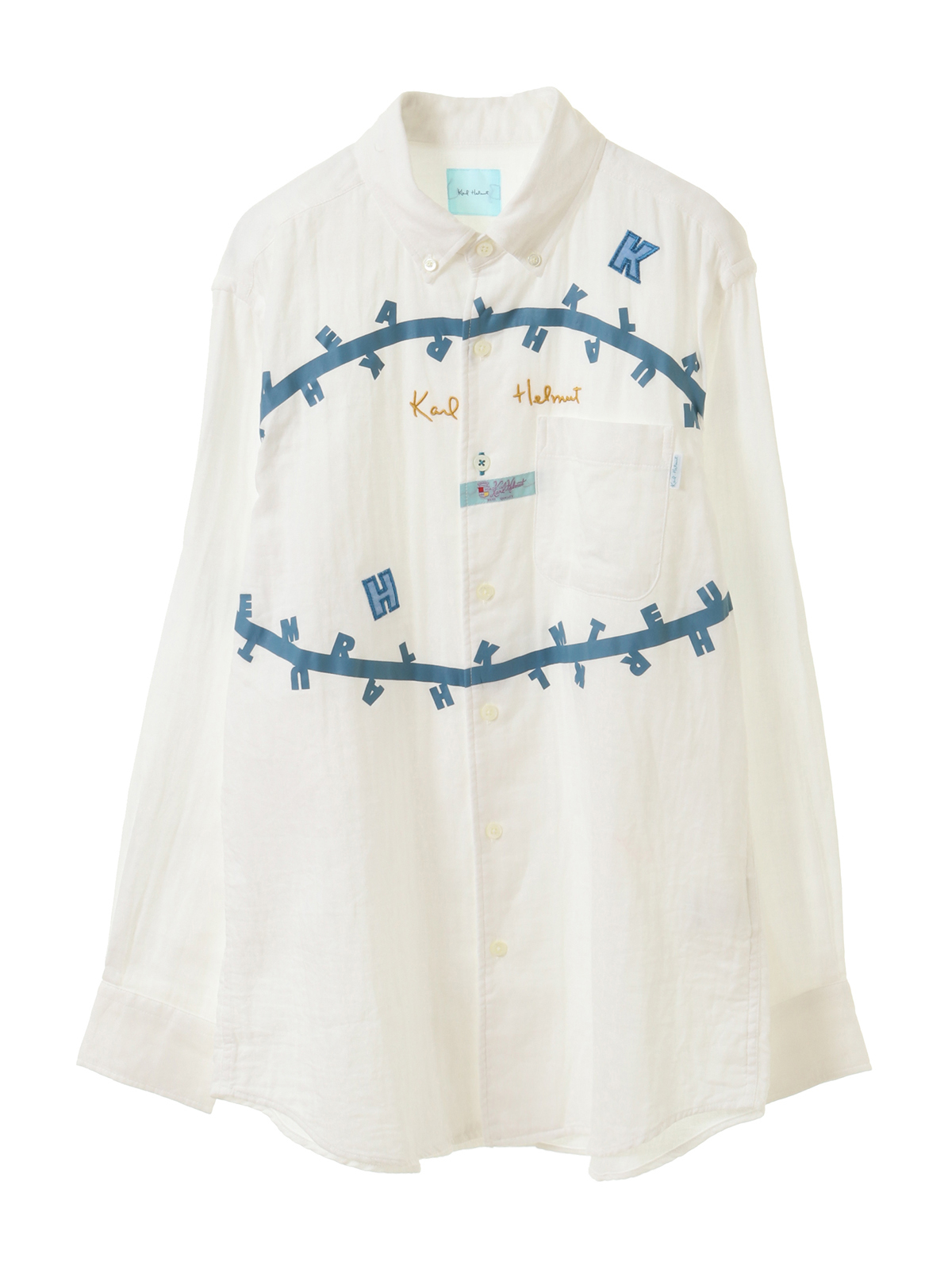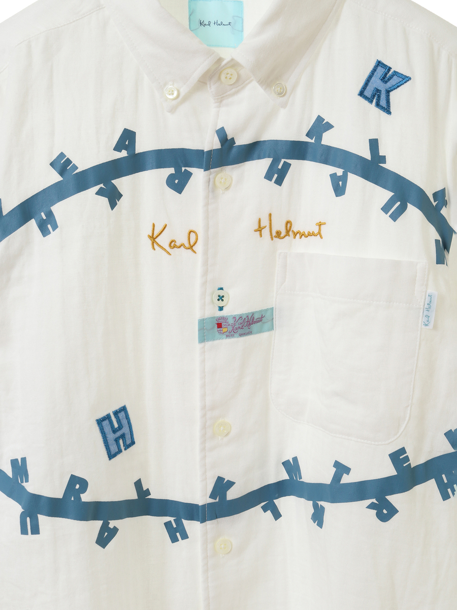 無造作に引いた2本のラインのうえに、KARL HELMUTのイニシャルロゴをランダムに並べたユニークで面白みのあるプリントがとても印象的なシャツブラウス。