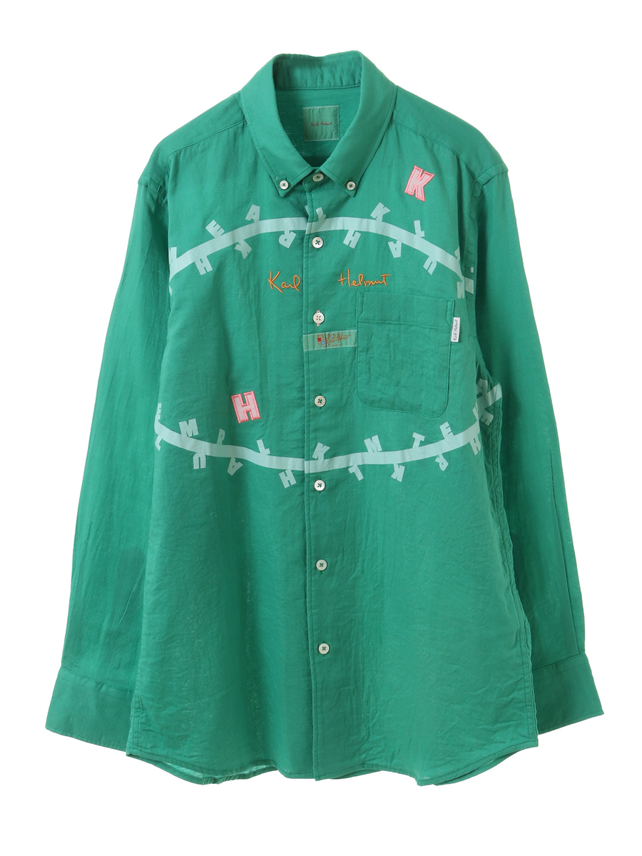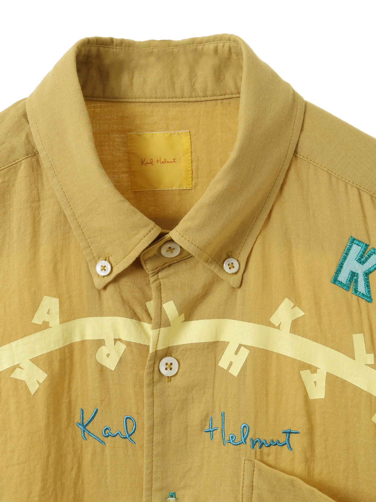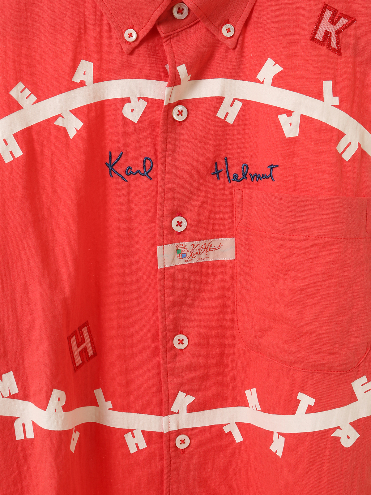 無造作に引いた2本のラインのうえに、KARL HELMUTのイニシャルロゴをランダムに並べたユニークで面白みのあるプリントがとても印象的なシャツブラウス。