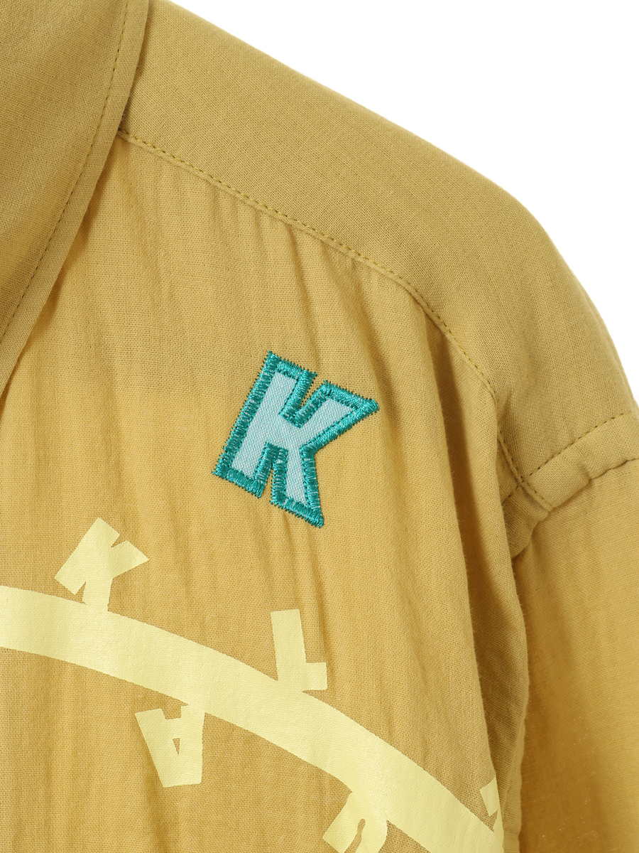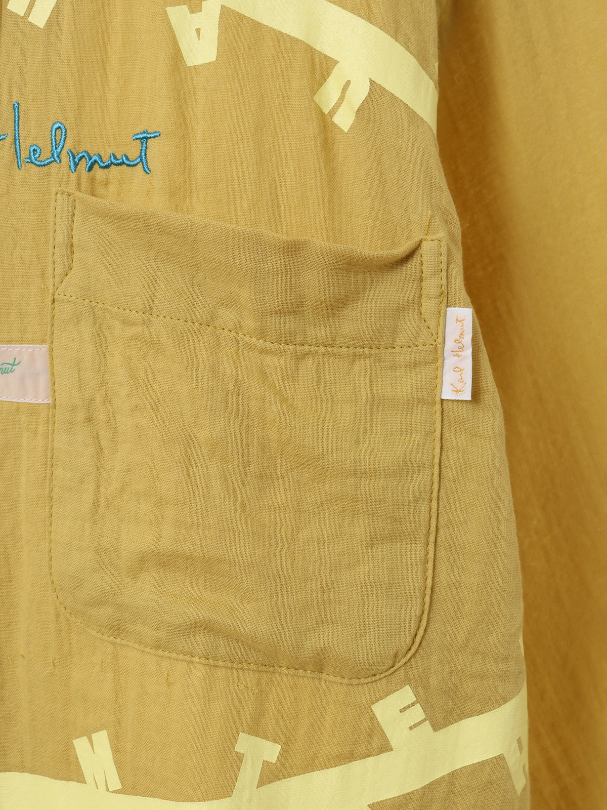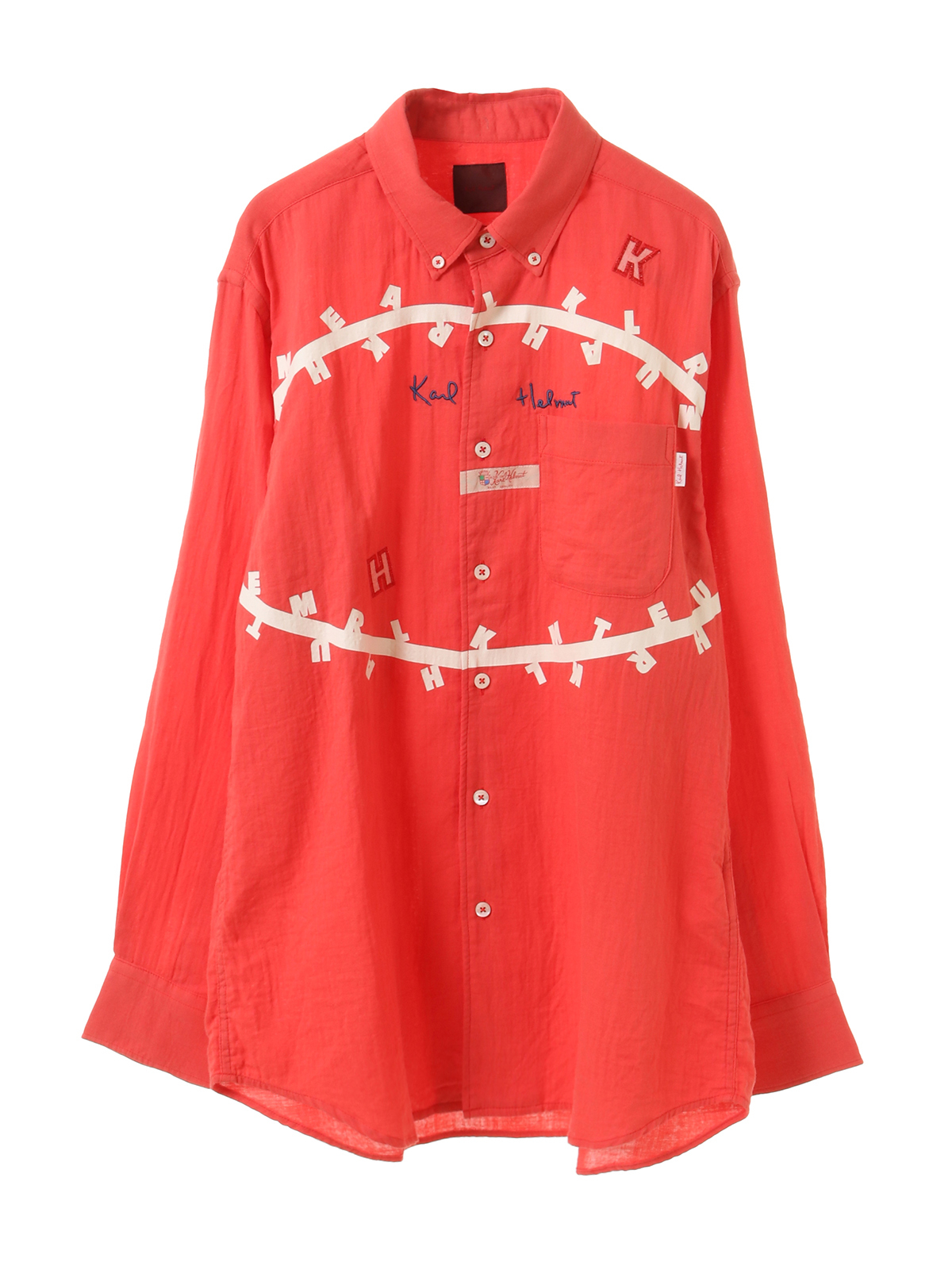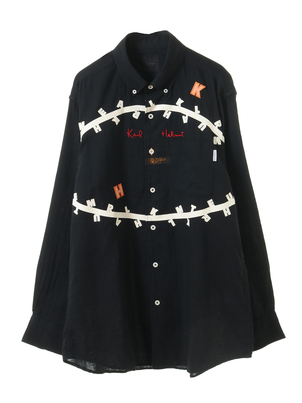 無造作に引いた2本のラインのうえに、KARL HELMUTのイニシャルロゴをランダムに並べたユニークで面白みのあるプリントがとても印象的なシャツブラウス。