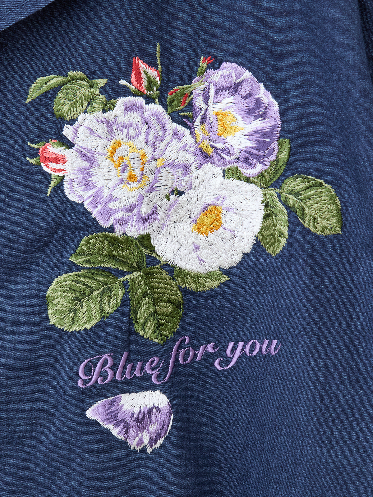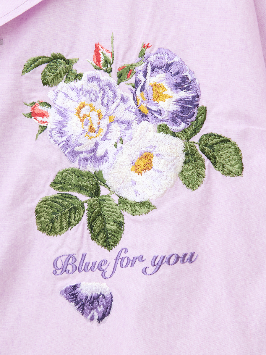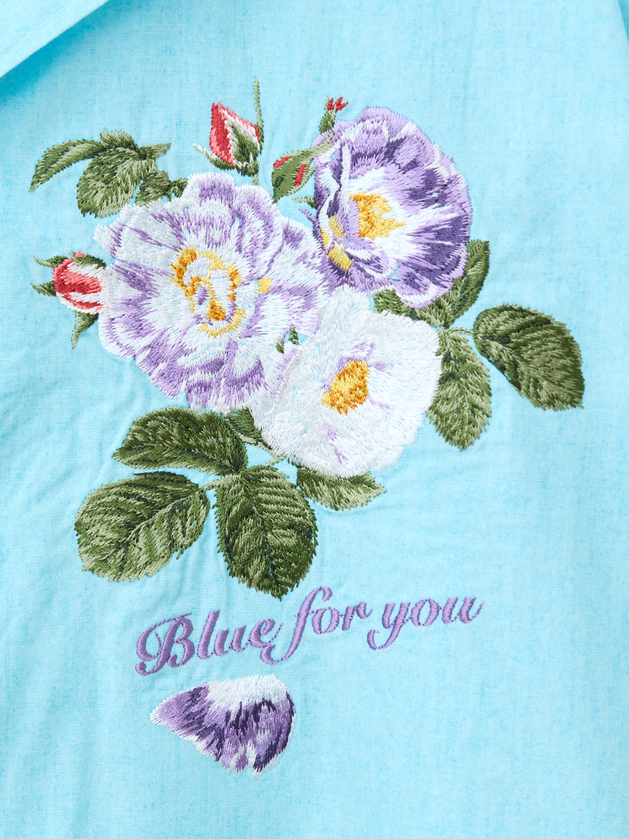 鮮やかな色合いのオープンカラーのシャツに、華やかなローズの刺繍がとても映えます。