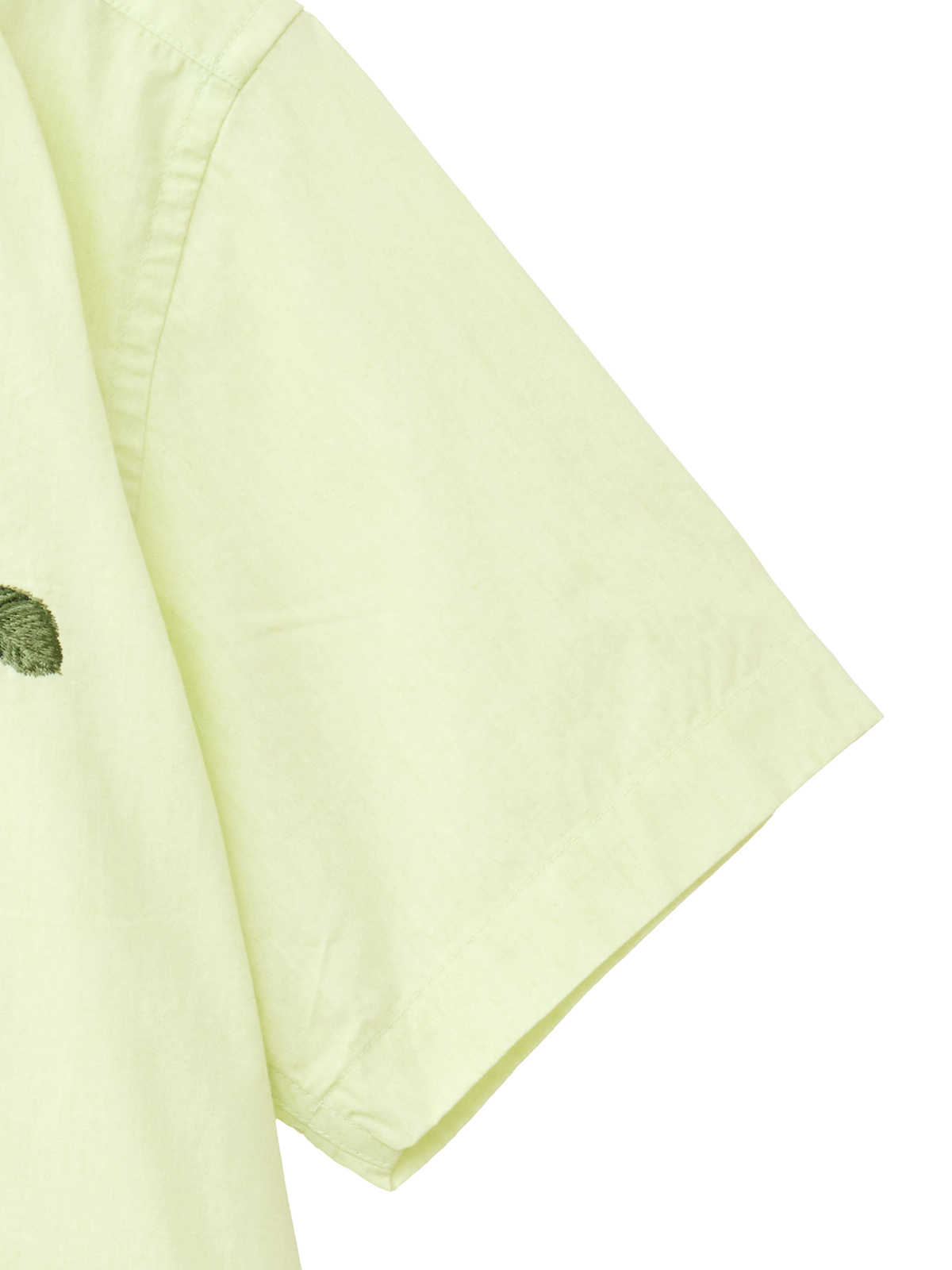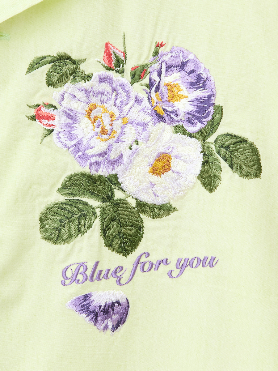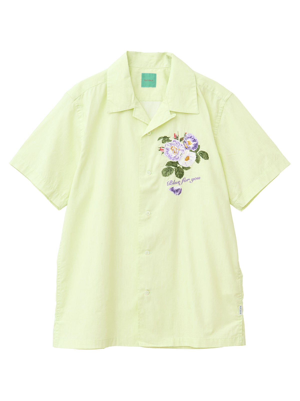 鮮やかな色合いのオープンカラーのシャツに、華やかなローズの刺繍がとても映えます。