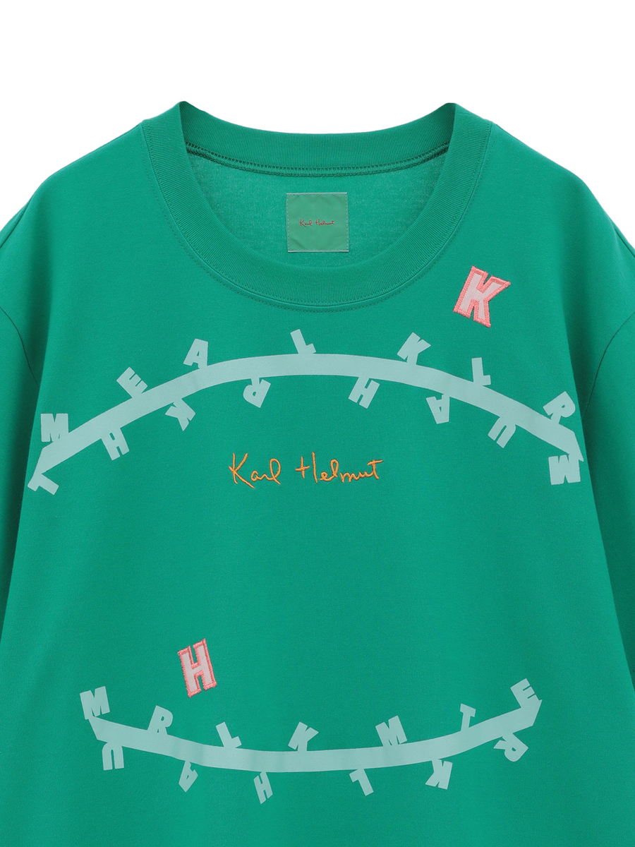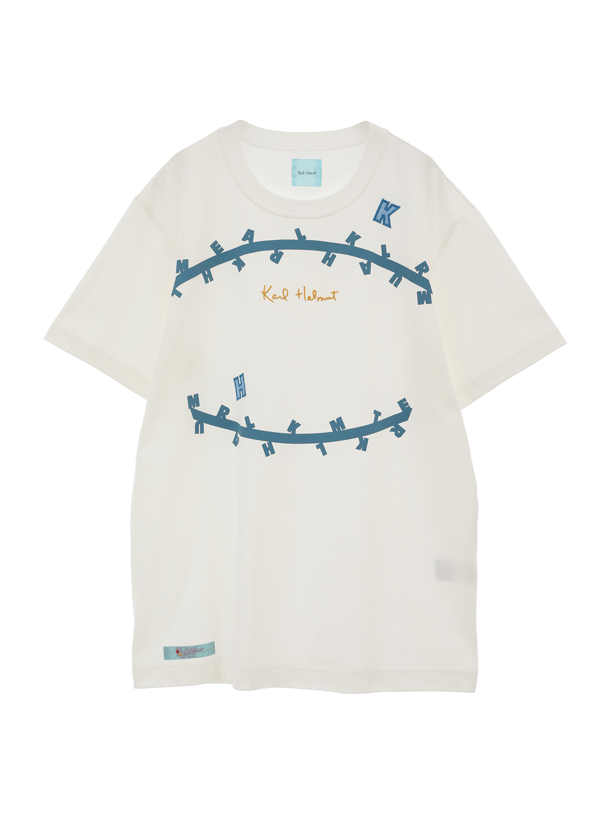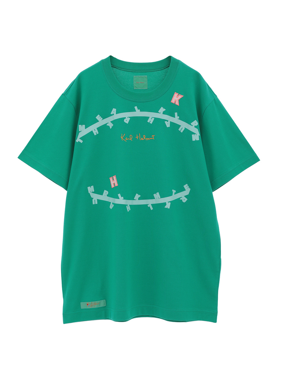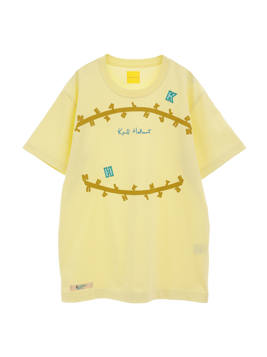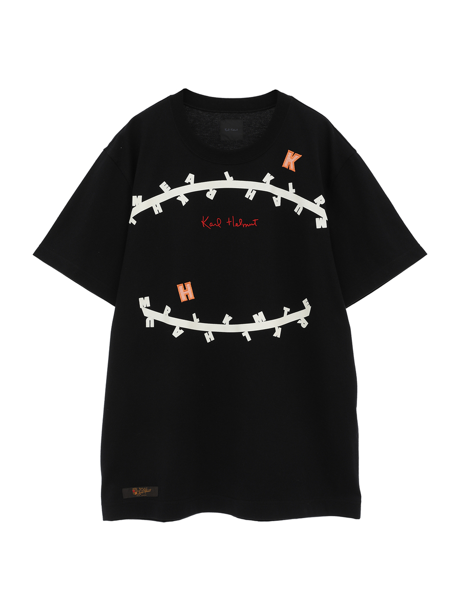 無造作に引いた2本のラインのうえに、KARL HELMUTのイニシャルロゴをランダムに並べたユニークで面白みのあるプリントがとても印象的なTシャツ。